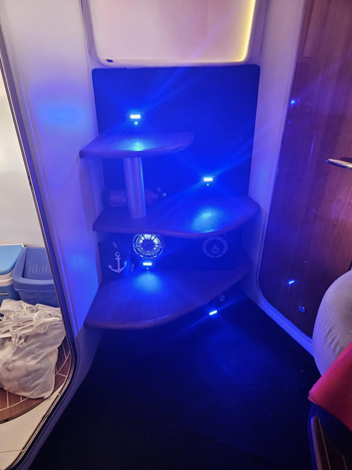 Engine Alarm, Bilge Alarm, Water pressure pump, Deck Shower, Directional Spotlight, Hydraulic Flaps, Fire Extinguishing System, Flaps Indicators, Courtesy Lights, Underwater lights, Gangway (IDRAULICA), Platform, Automatic Bilge Pump, Shorepower connector, Voltage Rectifier, Rollbar, Electric Windlass, swimming ladder, cockpit table, Tender, Horn.