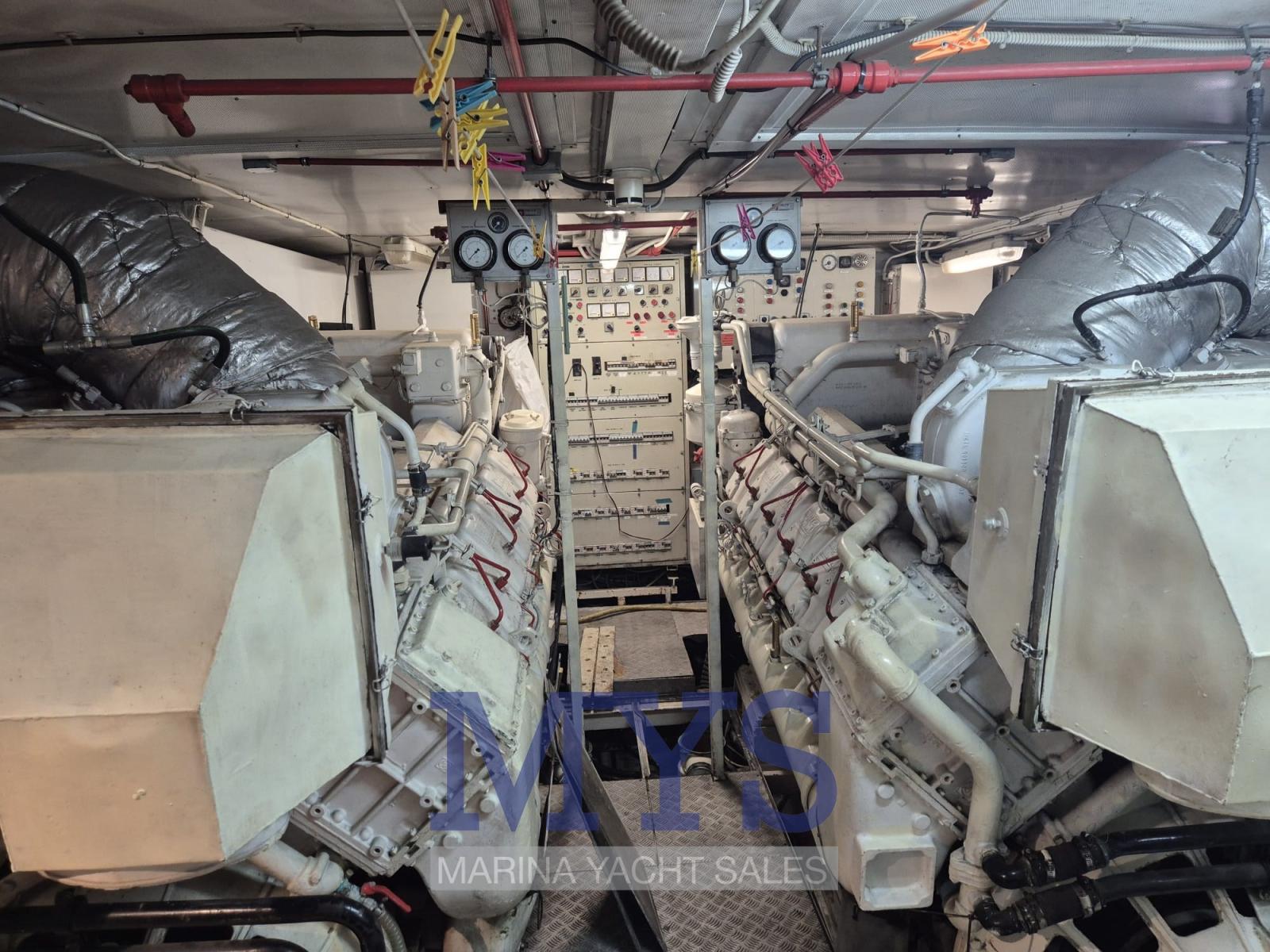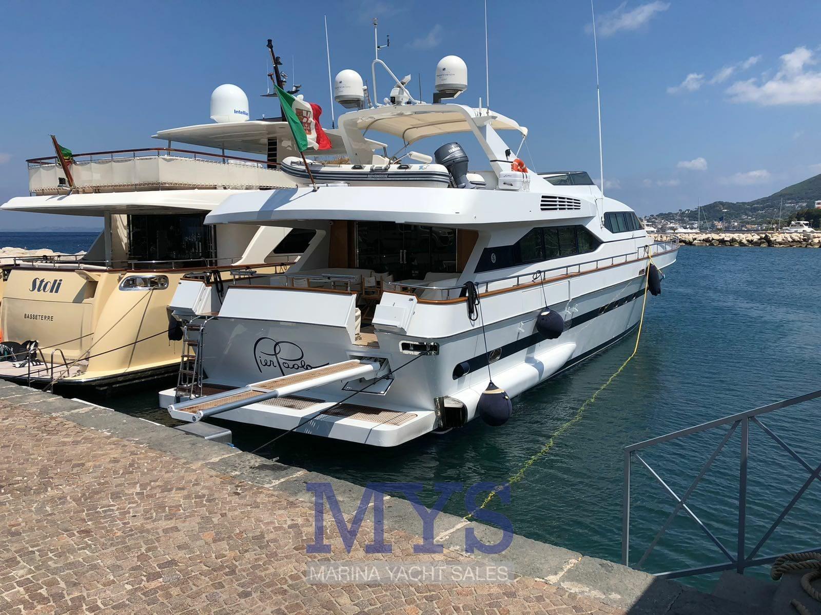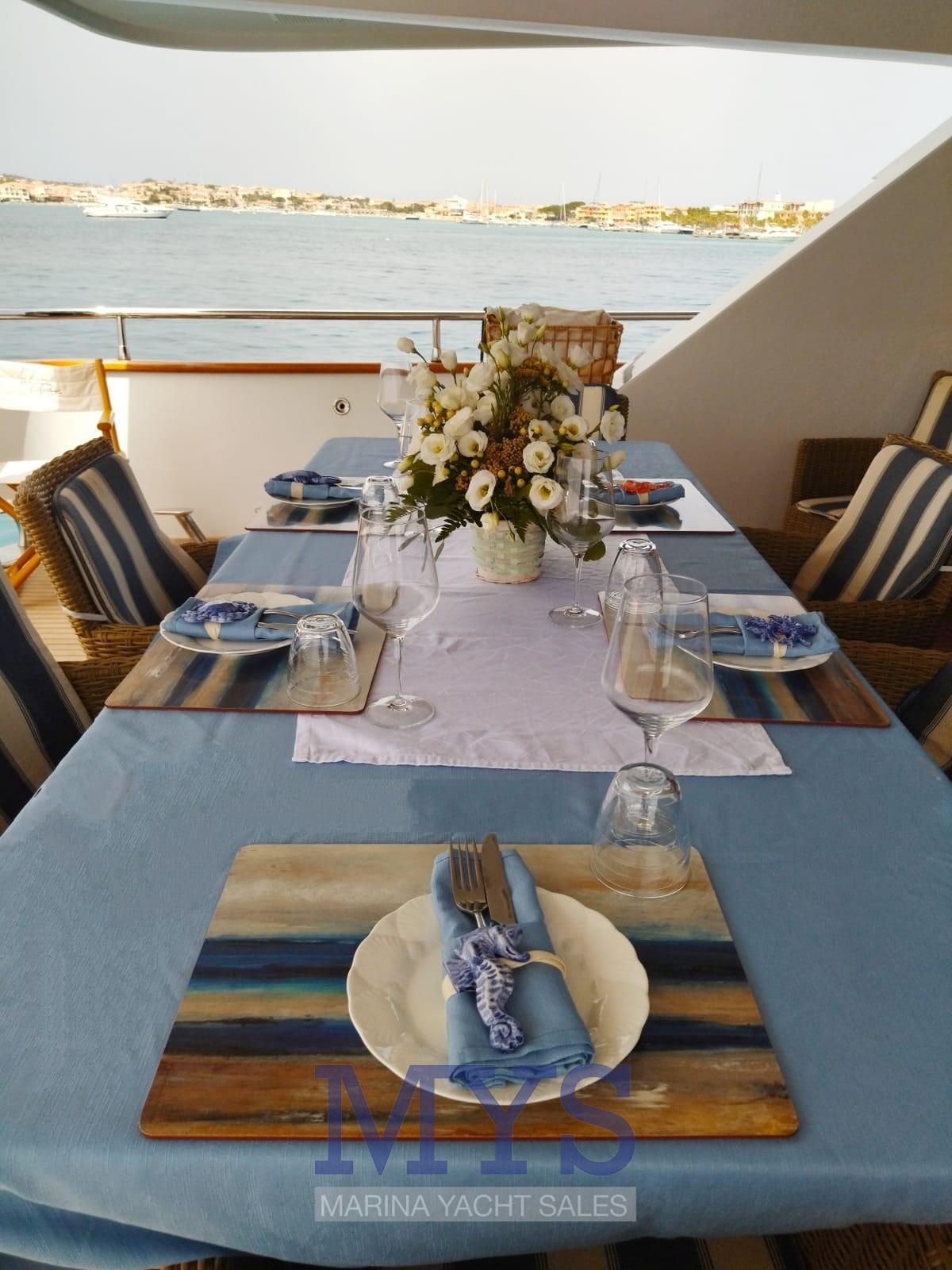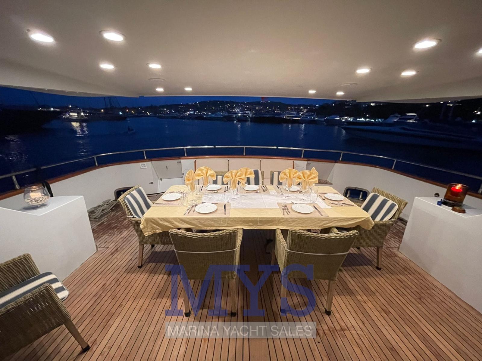 Fume/Gas Detector, Engine Alarm, Bilge Alarm, 2 Anchor, 2 Water pressure pump, 3 Life Raft, 8 Batteries, Draining System, Teak Side Decks, 3 Battery charger, Shore power cable, Guard rail, Deck Shower, Twin Steering, Hydraulic Flaps, Davits for tender on fly, Fire Extinguishing System, Compressor Air System, Flaps Indicators, Anchor Chain Washdown, Courtesy Lights, Underwater lights, Outboard engine for tender (40/60), Fenders, Gangway (idraulica a scomparsa), Platform (Da bagna a poppa), Waste Water Tank Drain Pump, 3 Automatic Bilge Pump, Manual Bilge Pump, Seawater Pump, Teak deck, Entry door, 2 Side door, Teak Cockpit, Shorepower connector (+V 380), Voltage Rectifier, Rollbar, Hydraulic Windlass, Gang Board, swimming ladder, Saddles for tender, cockpit table, Tender, Horn, Winch Hydraulic, 2 Stern Winches (a scomparsa), 2 Bow Winches.