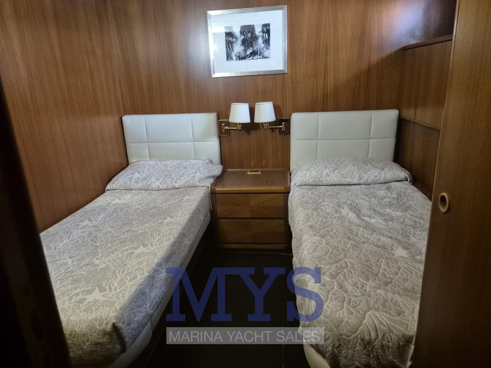 The sleeping area consists of 4 cabins, 2 doubles and two twins. The full-beam aft owner's cabin with ample space for maximum comfort, equipped with en suite services, with double sink and shower, spacious walk-in closet complete with safe, desk area, independent air conditioning, LED-Ultra HD TV, stereo, intercom system inside the ship (predisposition), VIP cabin forward always full beam and equipped with every comfort, en suite services, large walk-in closet complete with safe, independent air conditioning, LED-Ultra HD TV, stereo, intercom system inside the ship (predisposition), two double cabins with comfortable flat beds, each with complete en suite bathrooms, independent air conditioning, internal intercom system (predisposition), also the yacht is equipped with air sanitizer-ionizer for maximum care and hygiene of the interiors.