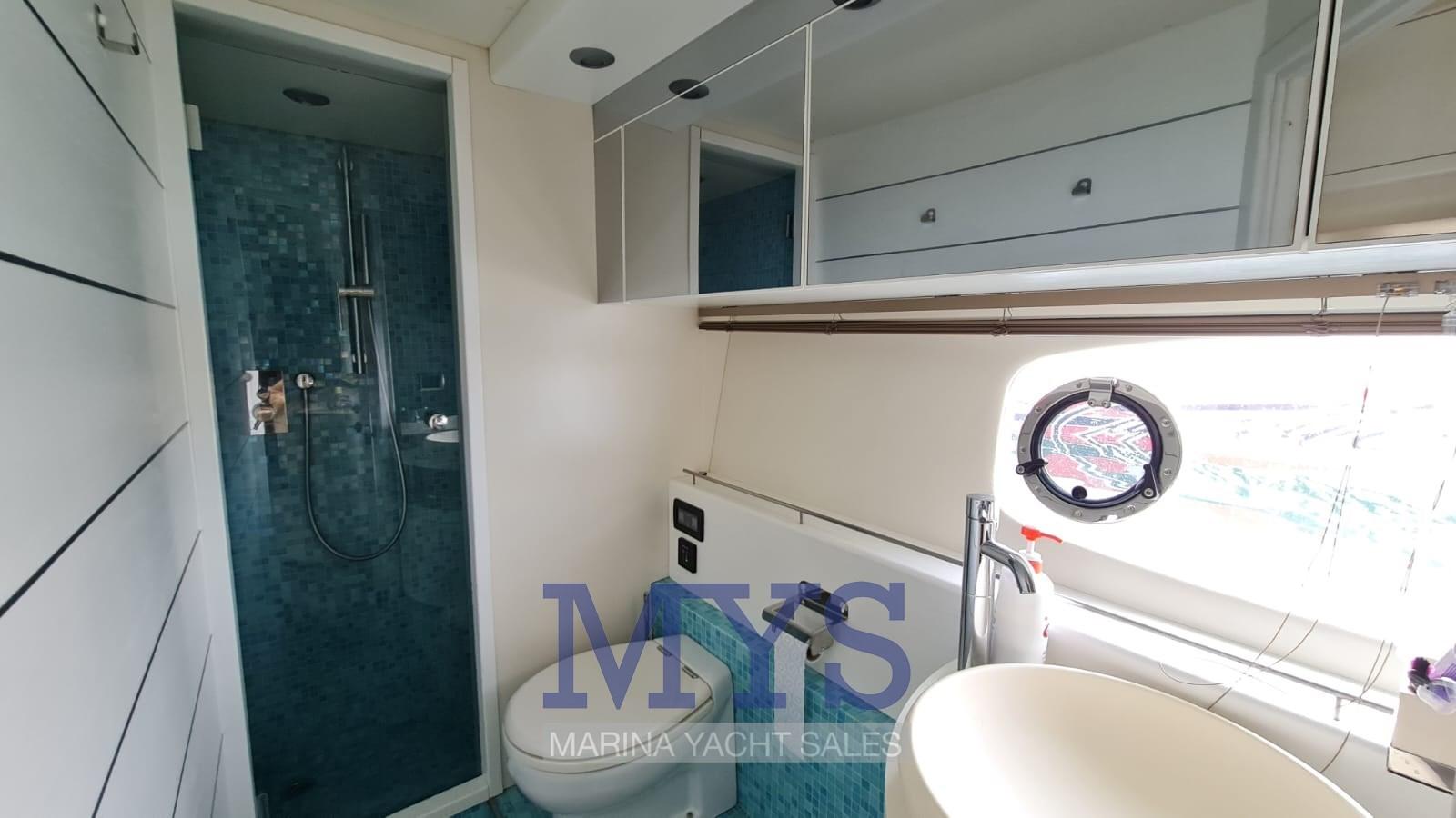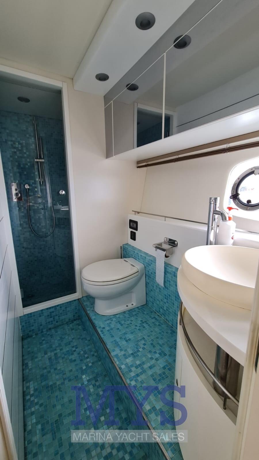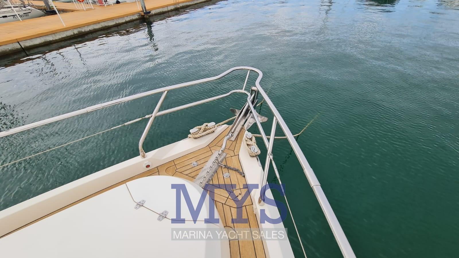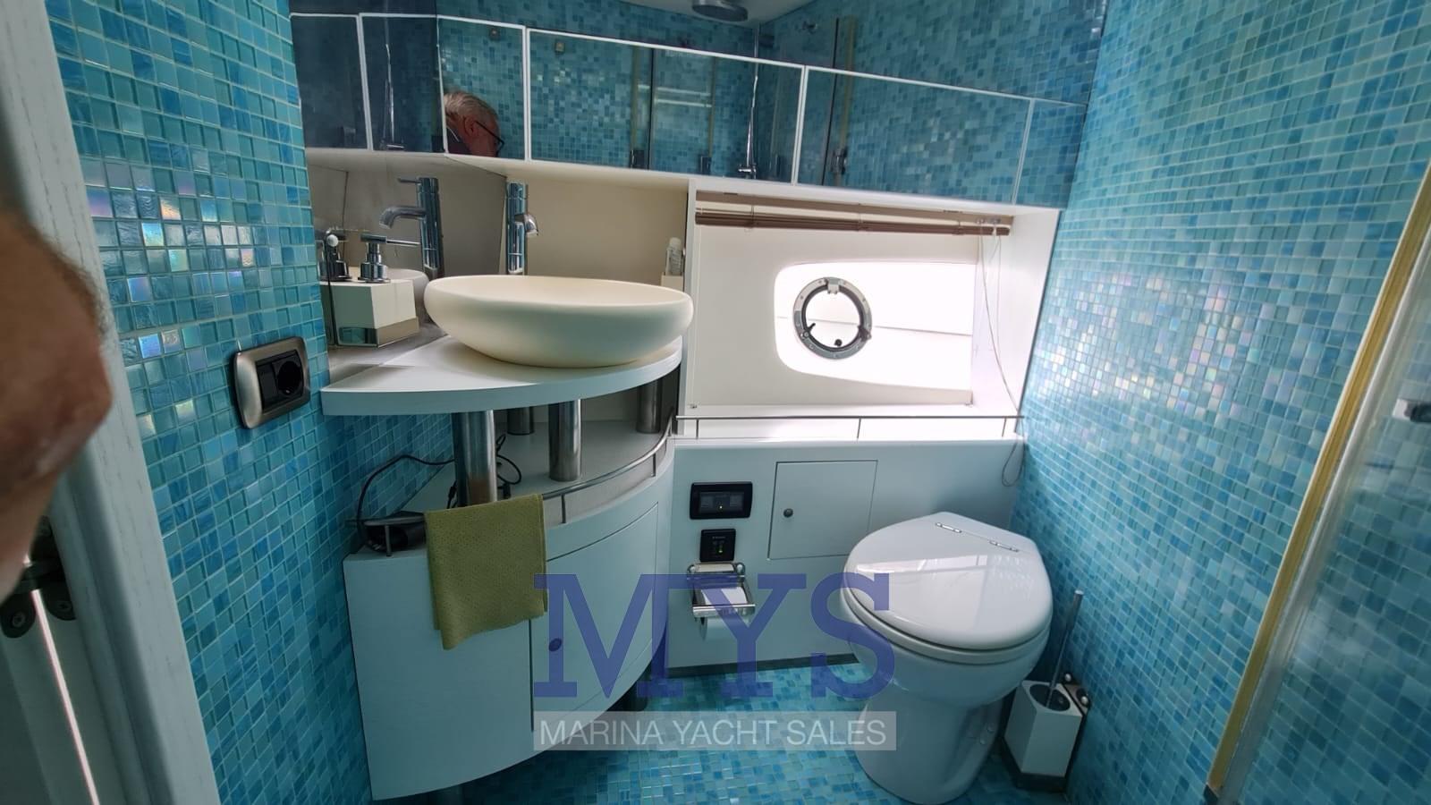 Engine Alarm, Bilge Alarm, Water pressure pump, Special Colour (Scafo blù), Deck Shower, Directional Spotlight, Hydraulic Flaps, Gangway (Idraulica), Platform, Automatic Bilge Pump, Entry door, Teak Cockpit, Shorepower connector, Voltage Rectifier, Electric Windlass, swimming ladder, cockpit table, Horn, Stern Winches.