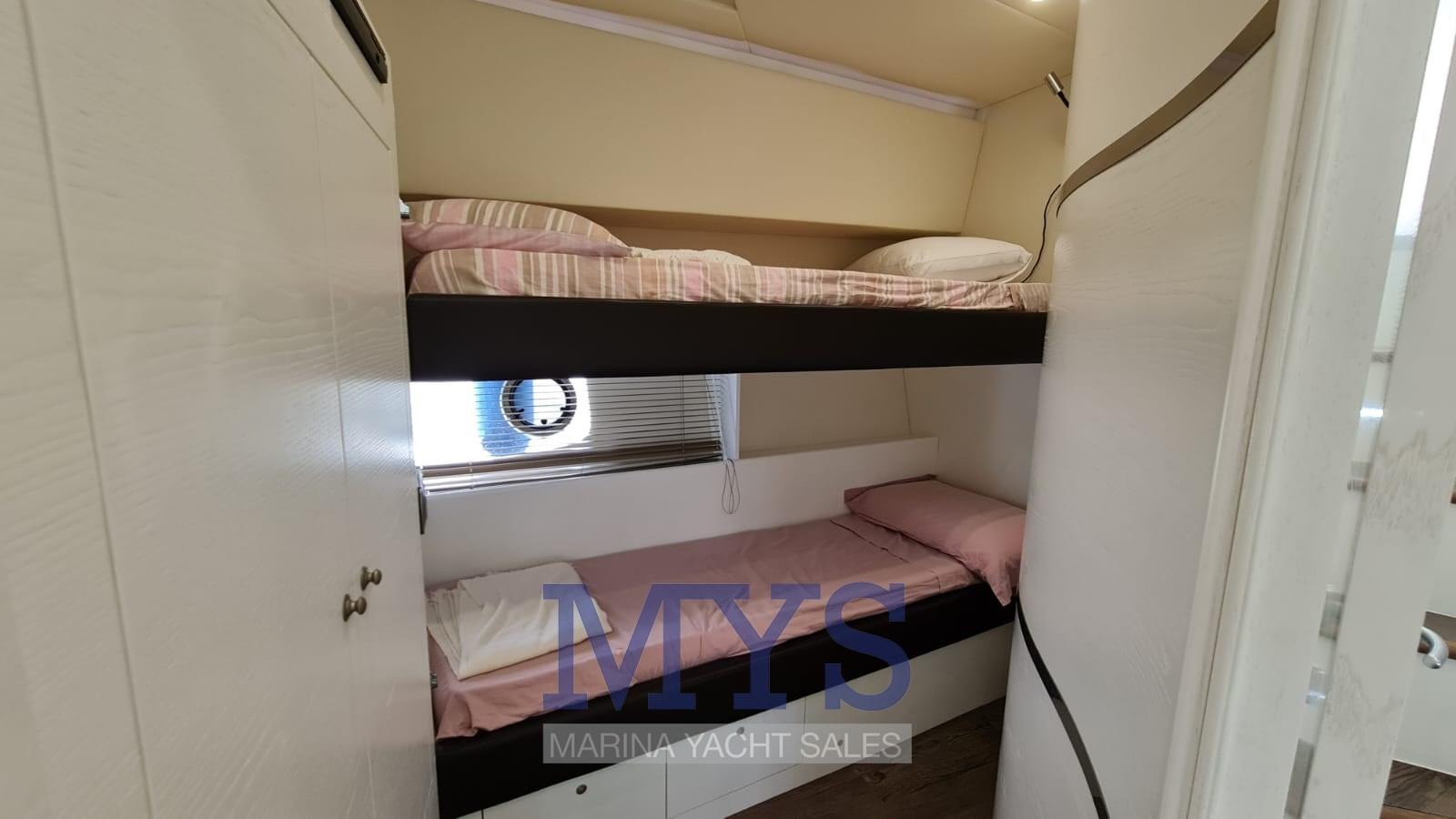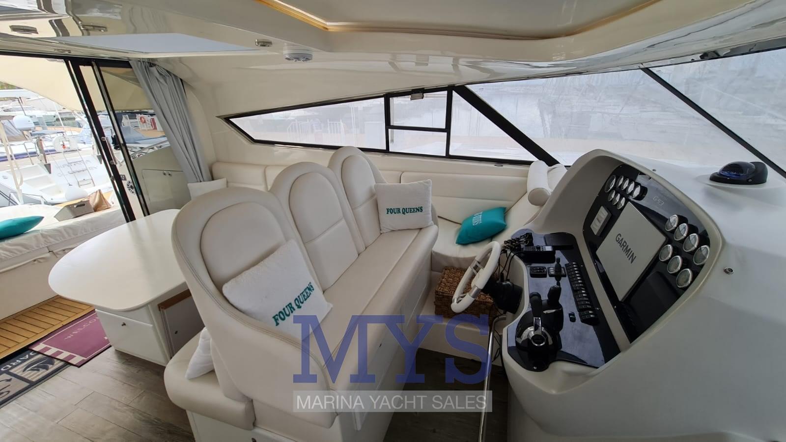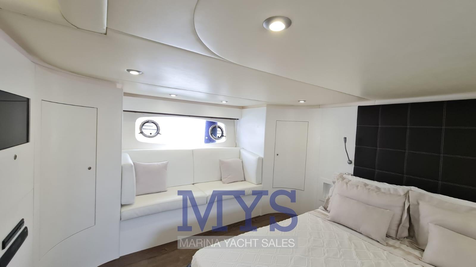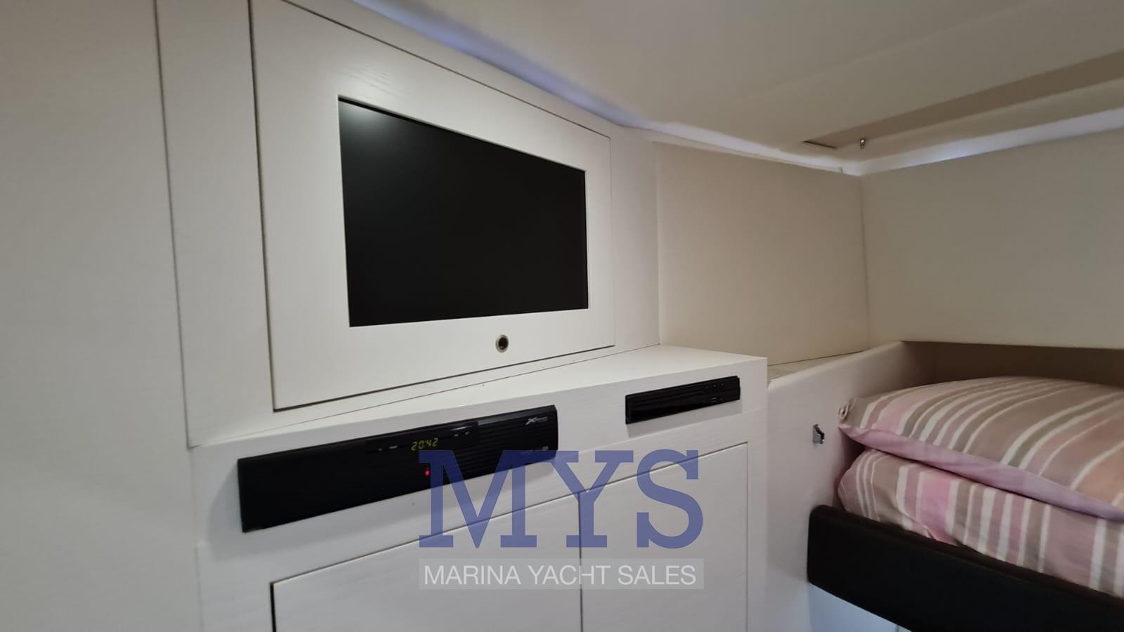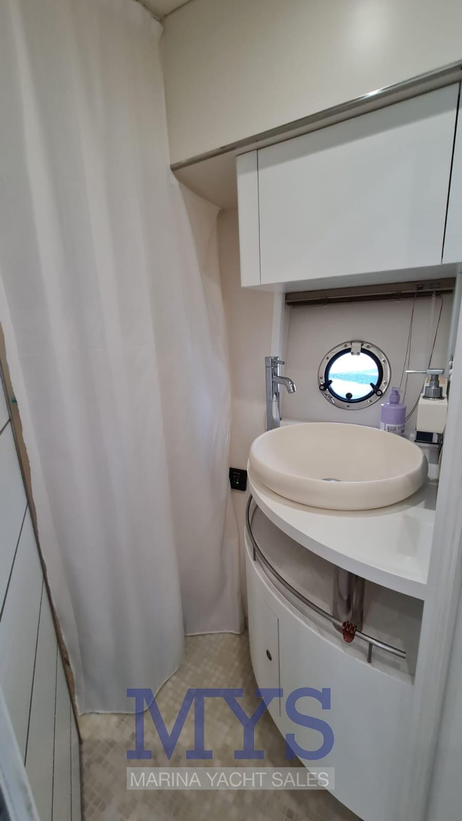 Engine Alarm, Bilge Alarm, Water pressure pump, Special Colour (Scafo blù), Deck Shower, Directional Spotlight, Hydraulic Flaps, Gangway (Idraulica), Platform, Automatic Bilge Pump, Entry door, Teak Cockpit, Shorepower connector, Voltage Rectifier, Electric Windlass, swimming ladder, cockpit table, Horn, Stern Winches.
