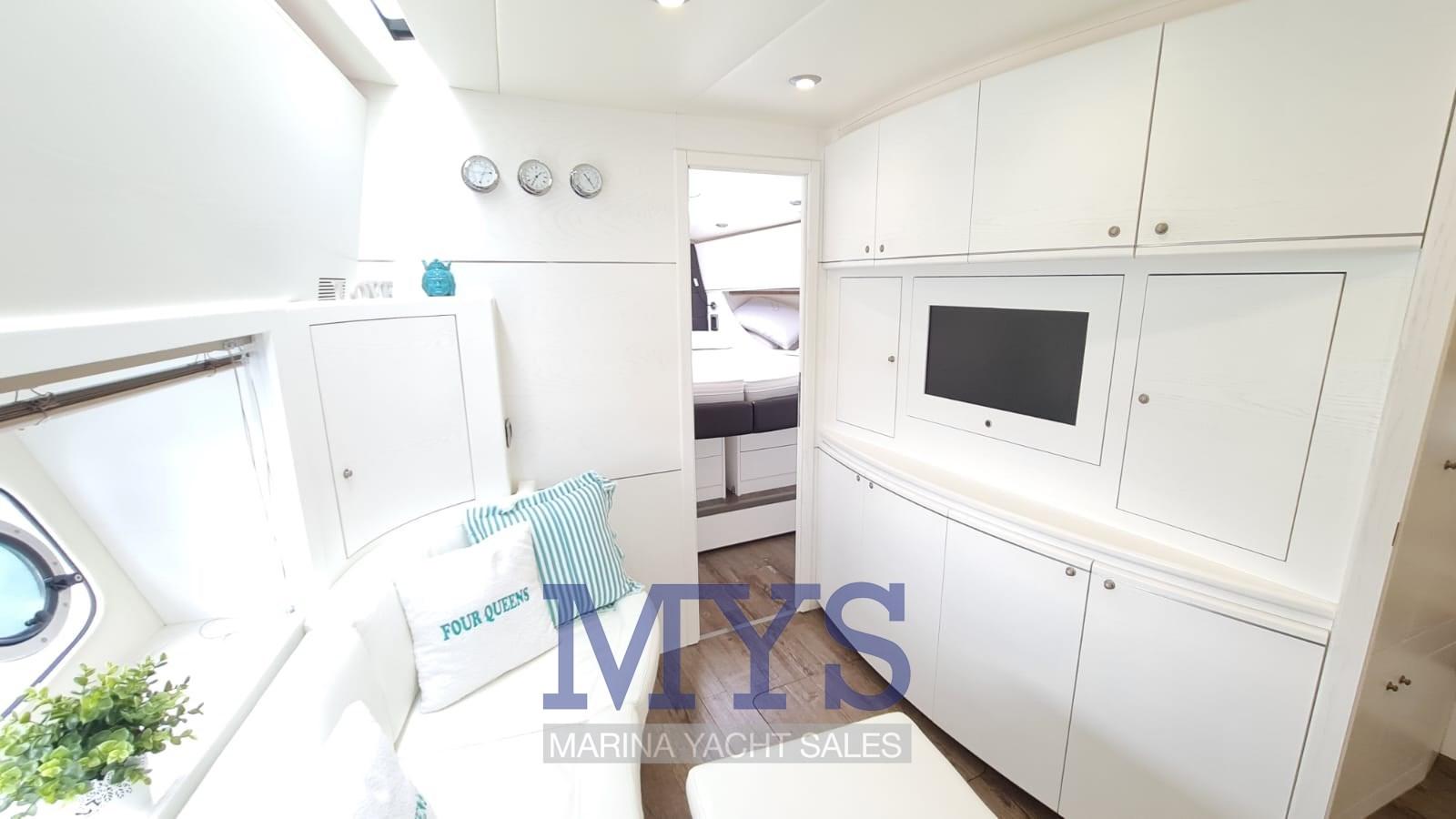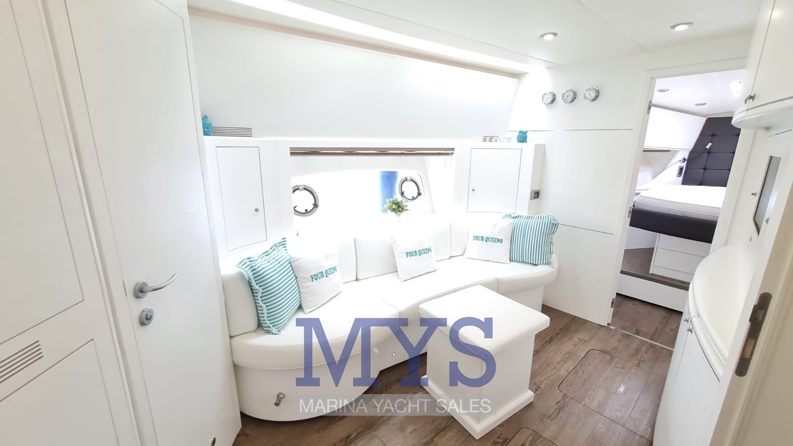 In the deckhouse there is the large living room and the helm station. The furnishings are characterized by fine materials and fabrics according to the style now tested on previous models.