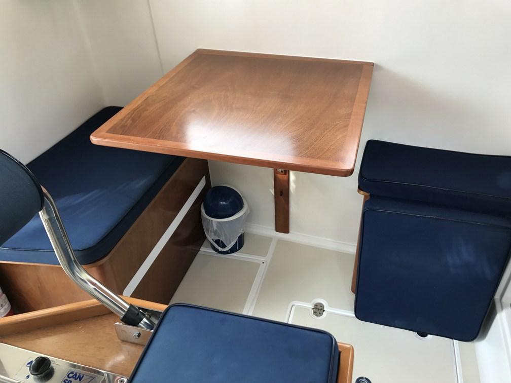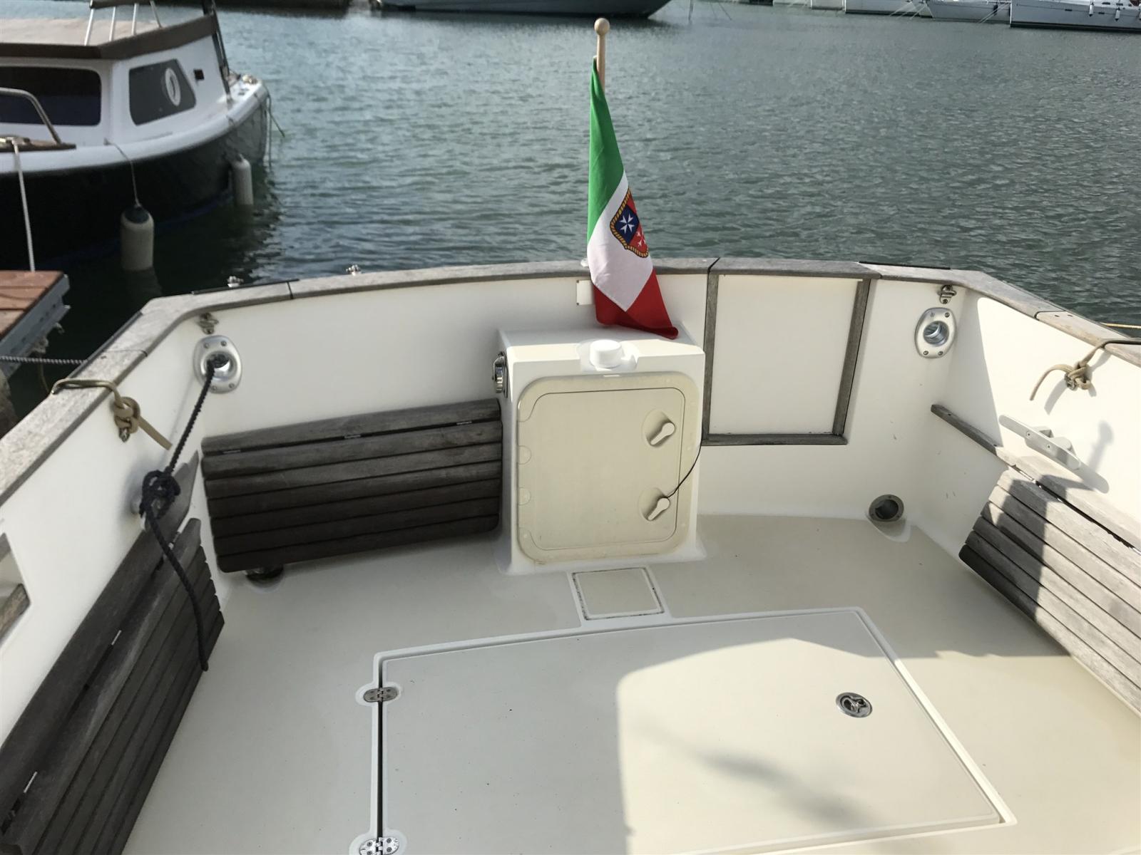 Large cockpit and stern platform in fiberglass with non-slip. Benches in the cockpit also foldable in wood.