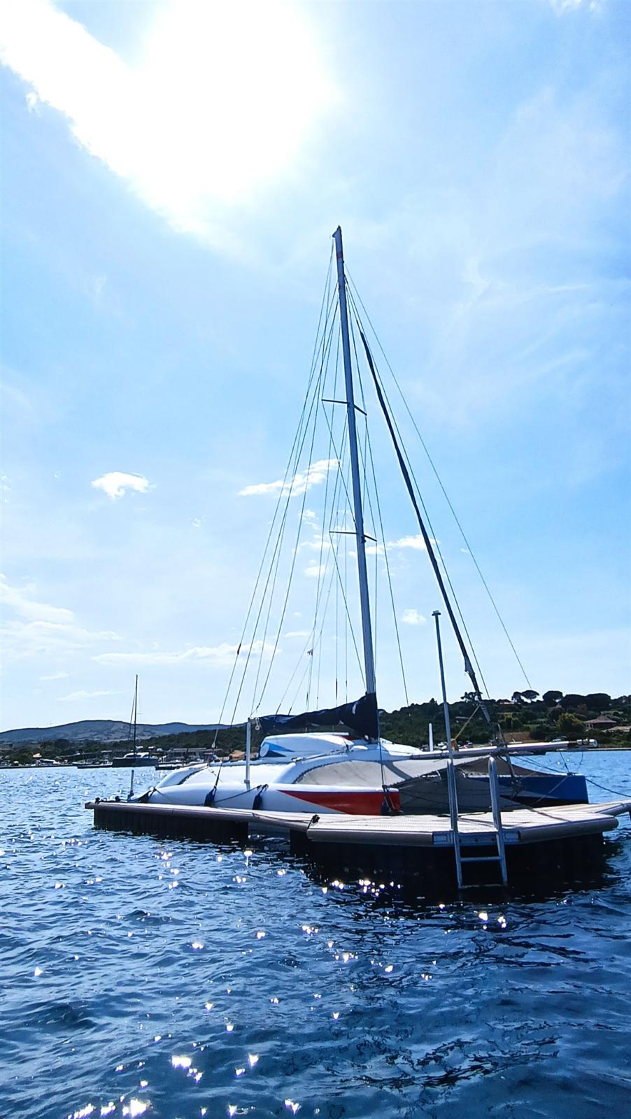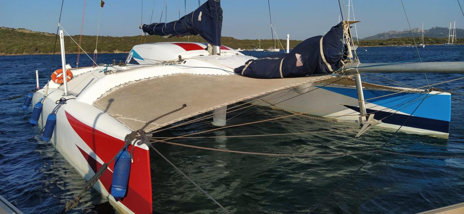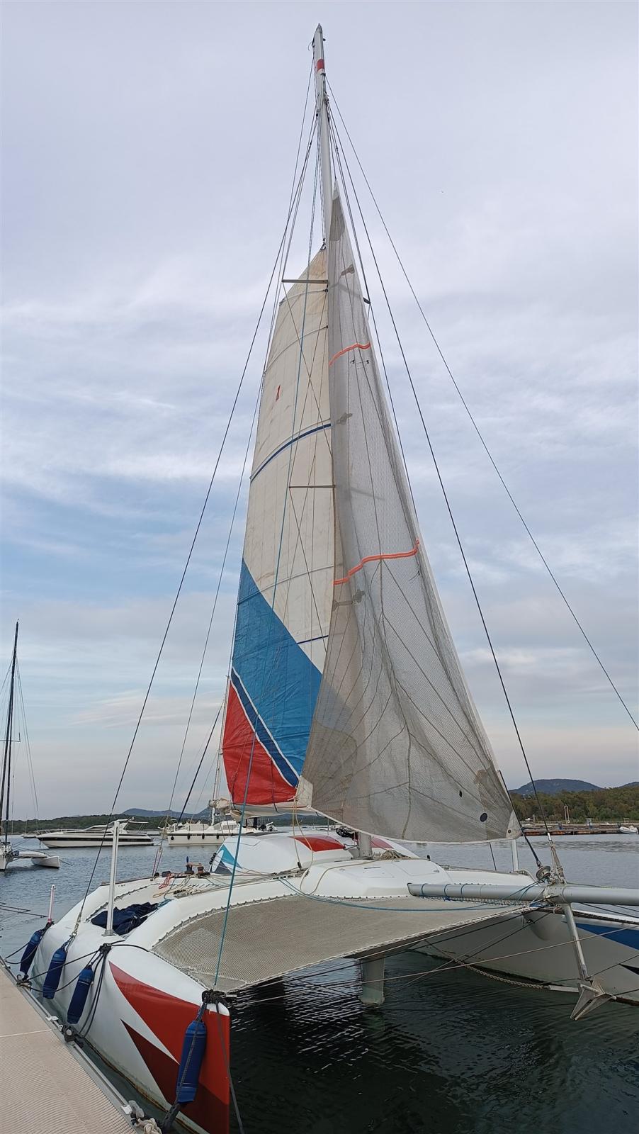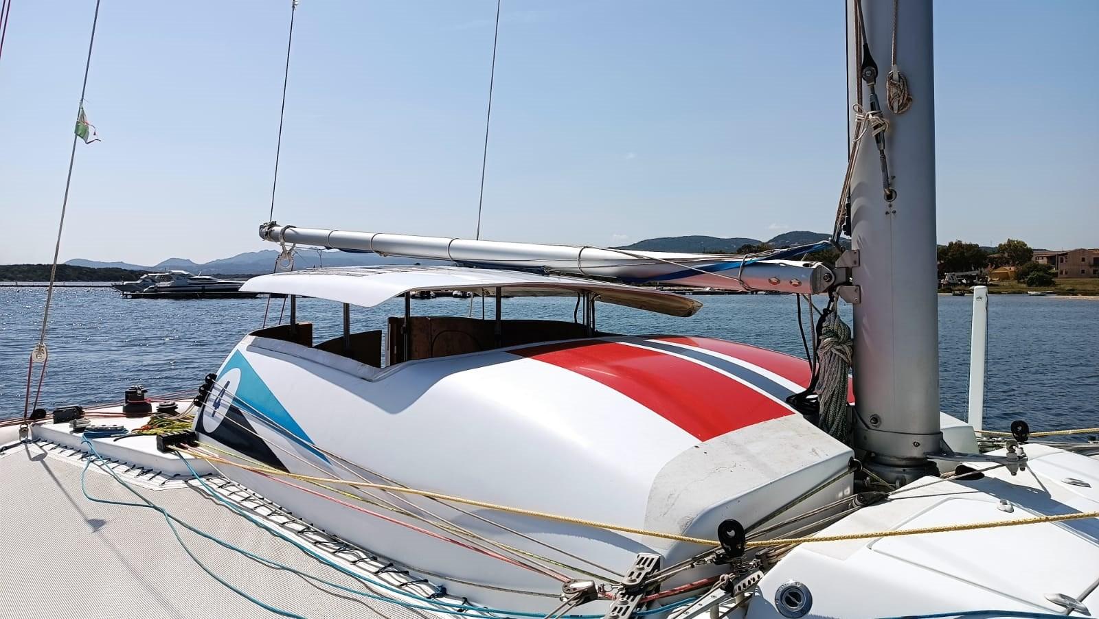 Crowther's custom built catamaran in composite material. Liftable deckhouse in 2 parts for dinette and bathroom and galley Mobile dinghies with control from the cockpit such as rudder blades FB engine in a special compartment; Lift. Many sails