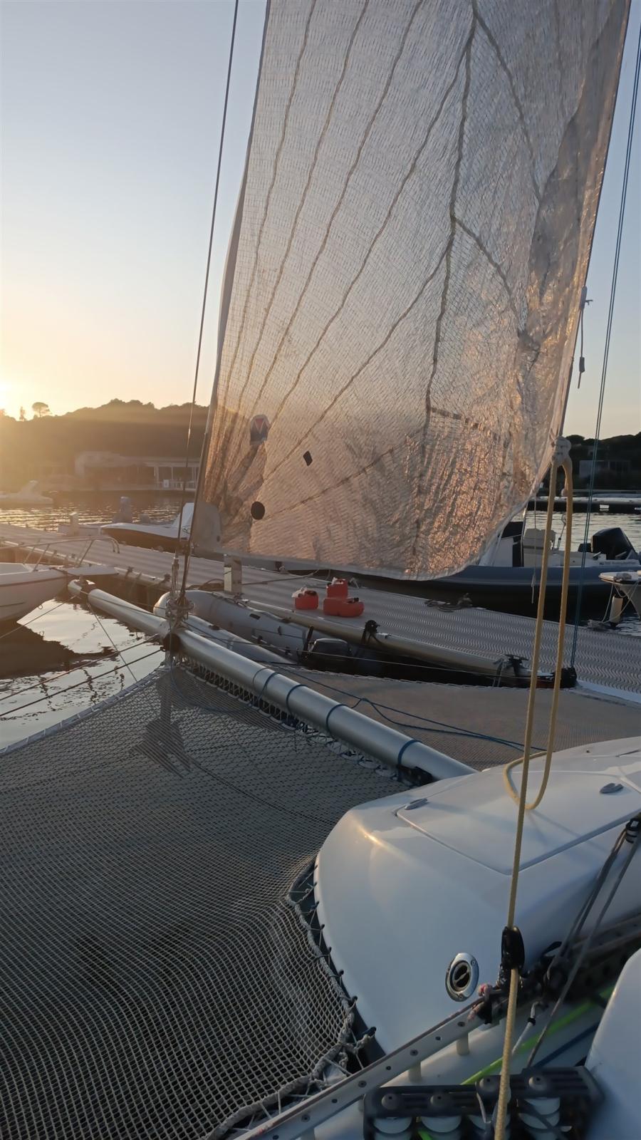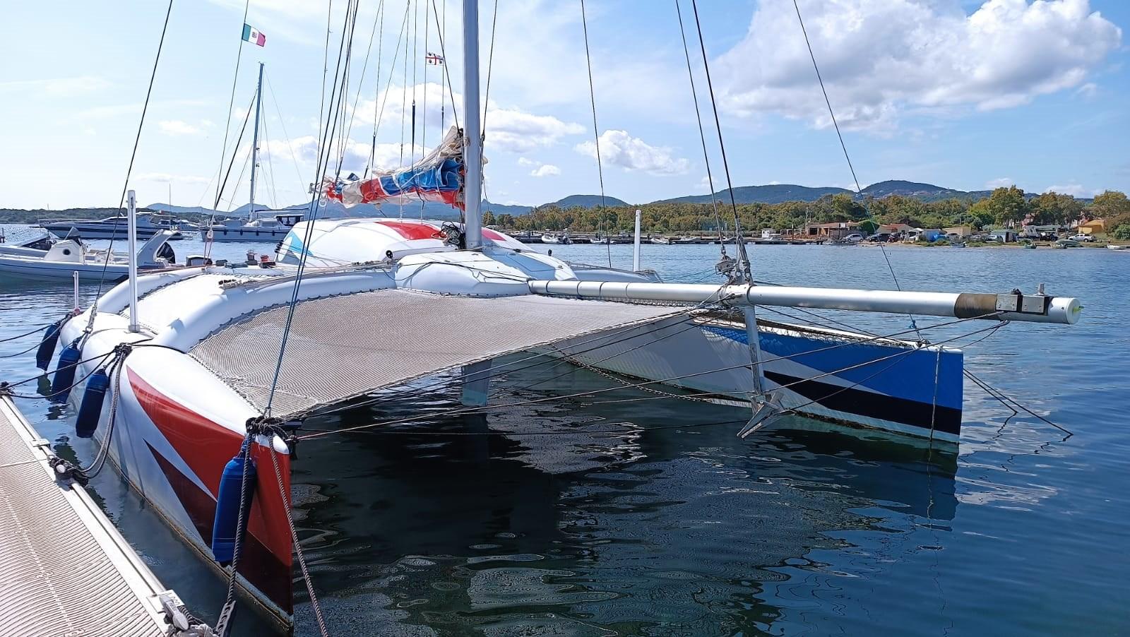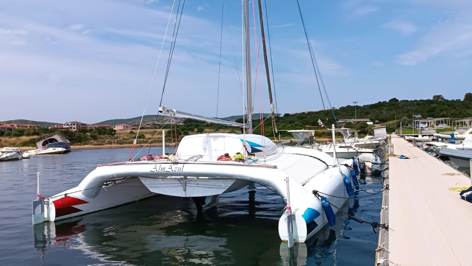 Crowther's custom built catamaran in composite material. Liftable deckhouse in 2 parts for dinette and bathroom and galley Mobile dinghies with control from the cockpit such as rudder blades FB engine in a special compartment; Lift. Many sails