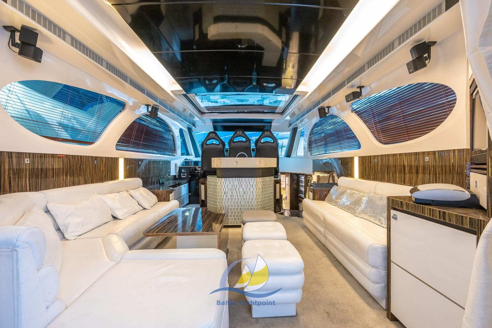 The saloon is generously sized and equipped with large windows that let in plenty of natural light and offer stunning views of the sea.