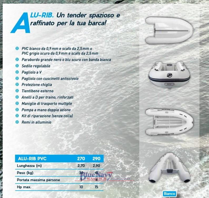 0.9mm white PVC and 2.5mm hull or, 0.9mm dark grey PVC and 2.5mm hull, Black or dark blue large fender with white stripe, Adjustable seat, V-shaped dunnage, Floor with non-slip bearings, Keel protection, External tientibene, D-rings for towing, reinforced, Multiple carrying handles, Double action hand pump, Repair kit (without glue), aluminum oars.