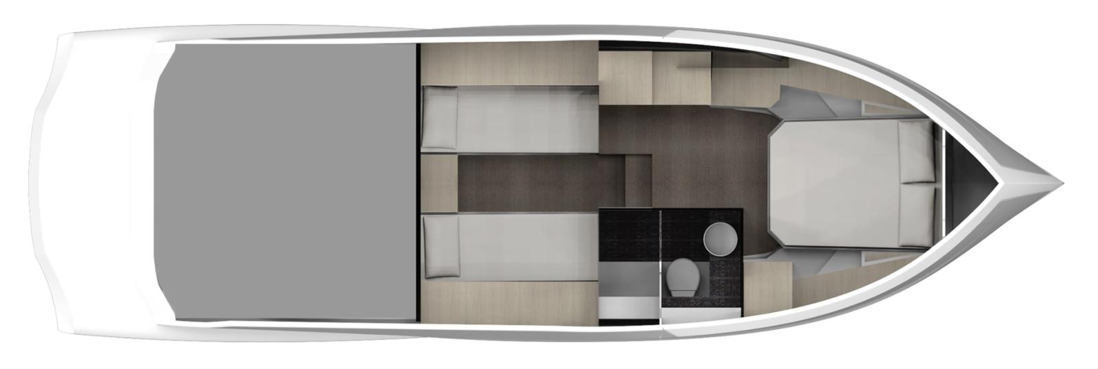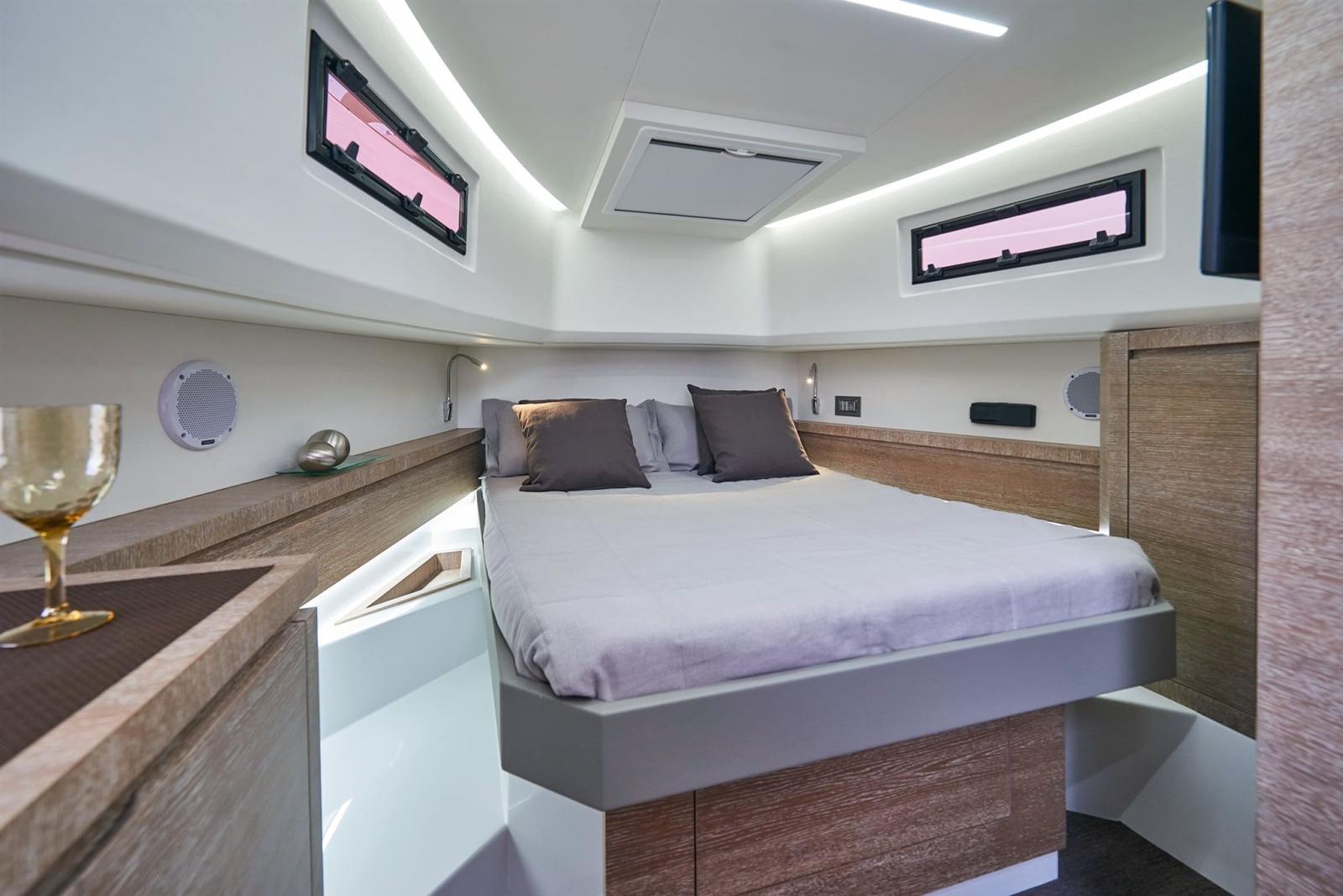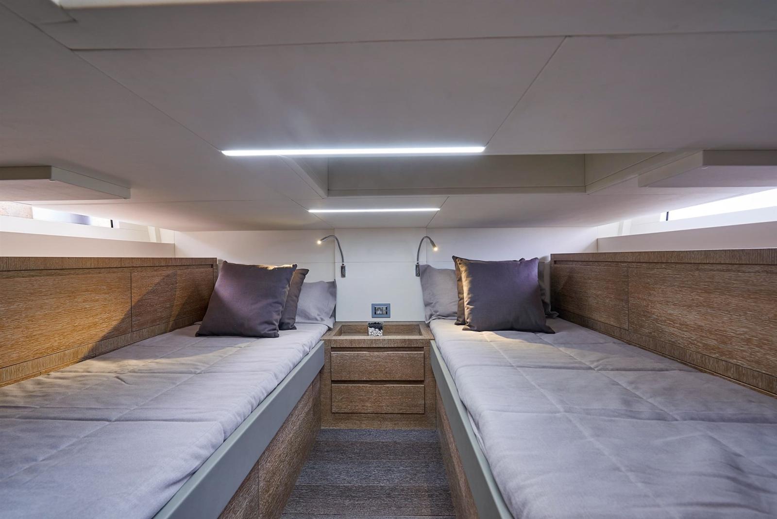 Master cabin with bed, wardrobe and drawers - - LED lights - Natural oak interior furniture - Guest cabin with two single beds, wardrobe and drawer units - Grey interior upholstery - Wooden cabin floor - Toilet with independent shower - Electric toilet - Floor and cabinet top in the toilets in Corian.