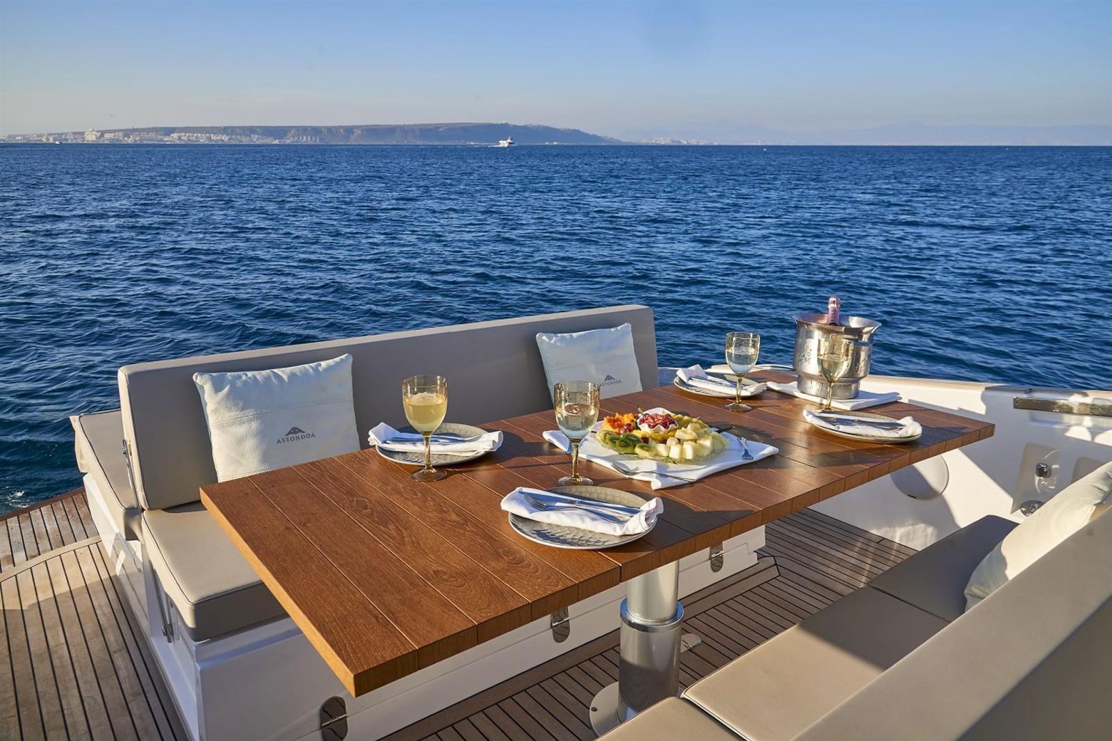 Astondoa white hardtop - Glass windscreen with windscreen wiper - Bathing platform - Storage locker with overhanging sundeck with electric opening - Access to engine room with electric opening - Three helm seats - Silvertex exterior upholstery - Folding sundeck backrests - External aft shower - Kitchen exterior cabinet with sink, 65 L fridge and induction hob - Hardtop with LED lighting - Courtesy lights on the main deck
