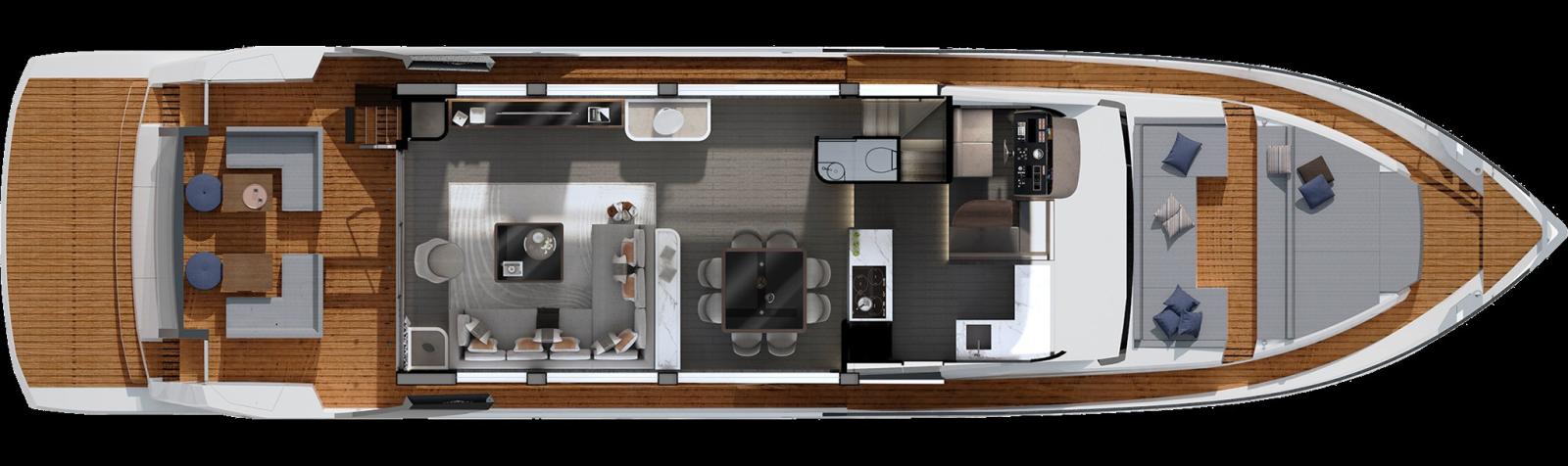 Underwater lights (4) - Hardtop with electric opening panels, speakers and LED lighting - Full teak - Fly cabinet with barbecue, sink and fridge - External cushion and table covers - Cockpit and bow tables with electric movement.
