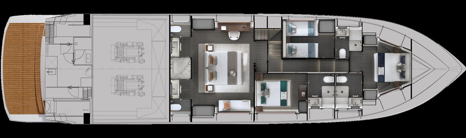 Four cabins, four bathrooms below deck and crew cabin • Saloon, galley, dining room, bathroom and helm station on the main deck • Standard De Luxe decoration • Wooden interior deck floor • Carpeted cabin floor • Household appliances: refrigerator, dishwasher, oven/microwave and induction hob • Tecma toilets • Manually operated deck and subdeck awnings