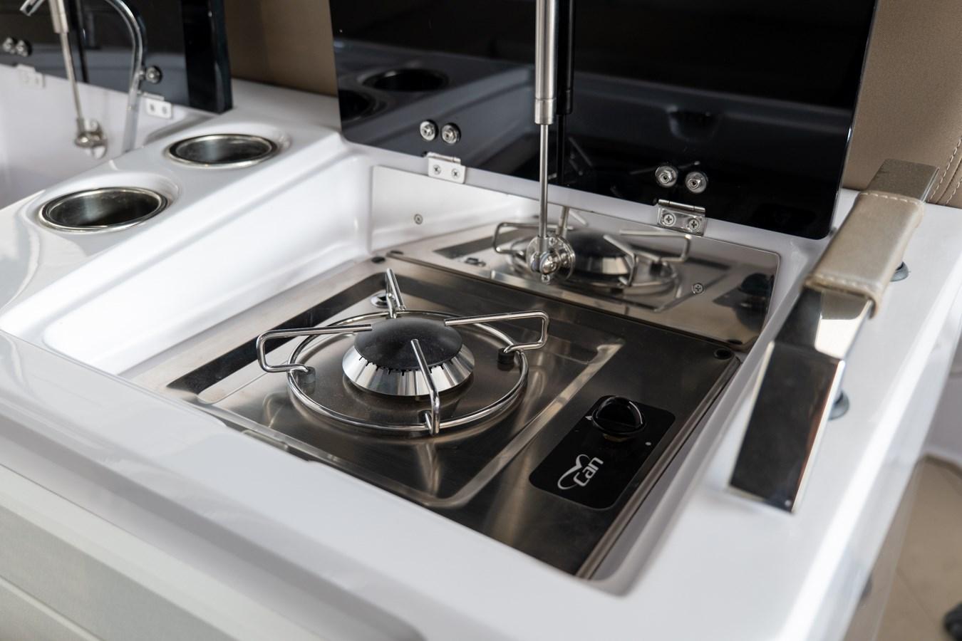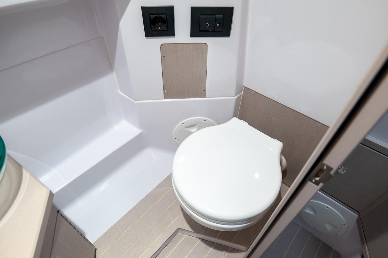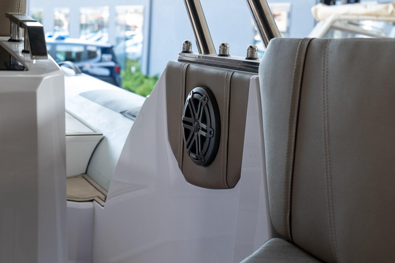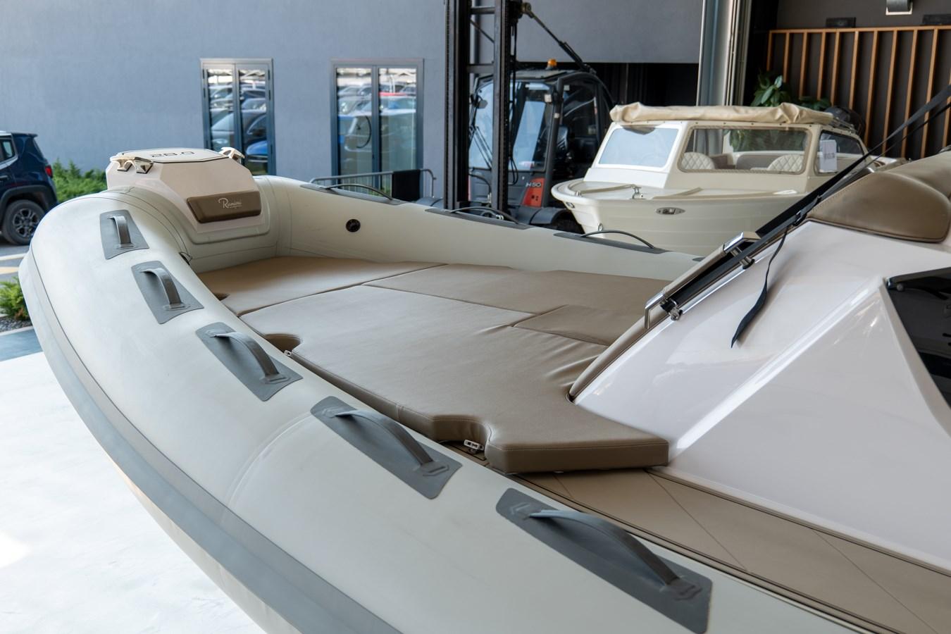 2 Console portholes - 4 Stainless steel cleats - Luxury cabin equipment - Gas extractor - Complete, anti-UV and water-resistant closed cell external cushions - Bow sunbathing cushion - Fabric dinette sofa that can be converted into a double bed - "C" shaped cockpit sofa with large counter-moulded lockers underneath - Stainless steel external refrigerator - Towing and mooring hooks - Counter-moulded anchor locker and chain collection - Steering console locker with door - Stern locker for mooring accessories - Stand up guide locker with door - Counter-moulded bow lockers - Manual inflator - Complete shower system - Complete electrical system - Navigation lights - Bathroom cabinet with washbasin - Fiberglass nose in the bow - Opening hatch in the bow - Electric panel with push-button panel - Stern platforms with telescopic ladder - Bilge pump with automatic/manual control - Electric windlass - Cross-linked polyethylene fuel tank - Electro-actuated battery switch with emergency manual control - Driving stand up - Driving stand up with counter-moulded sink - Standard external upholstery - Internal upholstery - Complete hydraulic steering up to 300HP (Single propeller) - Electric horn - Two-tone Arctic grey tubulars / smooth inserts - Electric marine toilet with black water tank