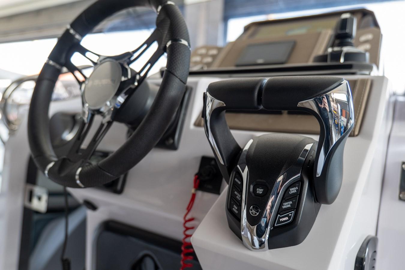 Luxury Console - Chain counter - Additional battery system - Stereo system with 4 speakers and bluetooth - Courtesy LED in the cockpit - Electronic Pack - 110/220 volt shore socket with charger - Folding stainless steel roll-bar with double awning - Joystick and autopilot - 2 Batteries + box - Logbook and engine transport - Twin-engine installation - Luxury Matrix External Upholstery - Individual Brown Interior Upholstery - Seadeck Sahara Camel