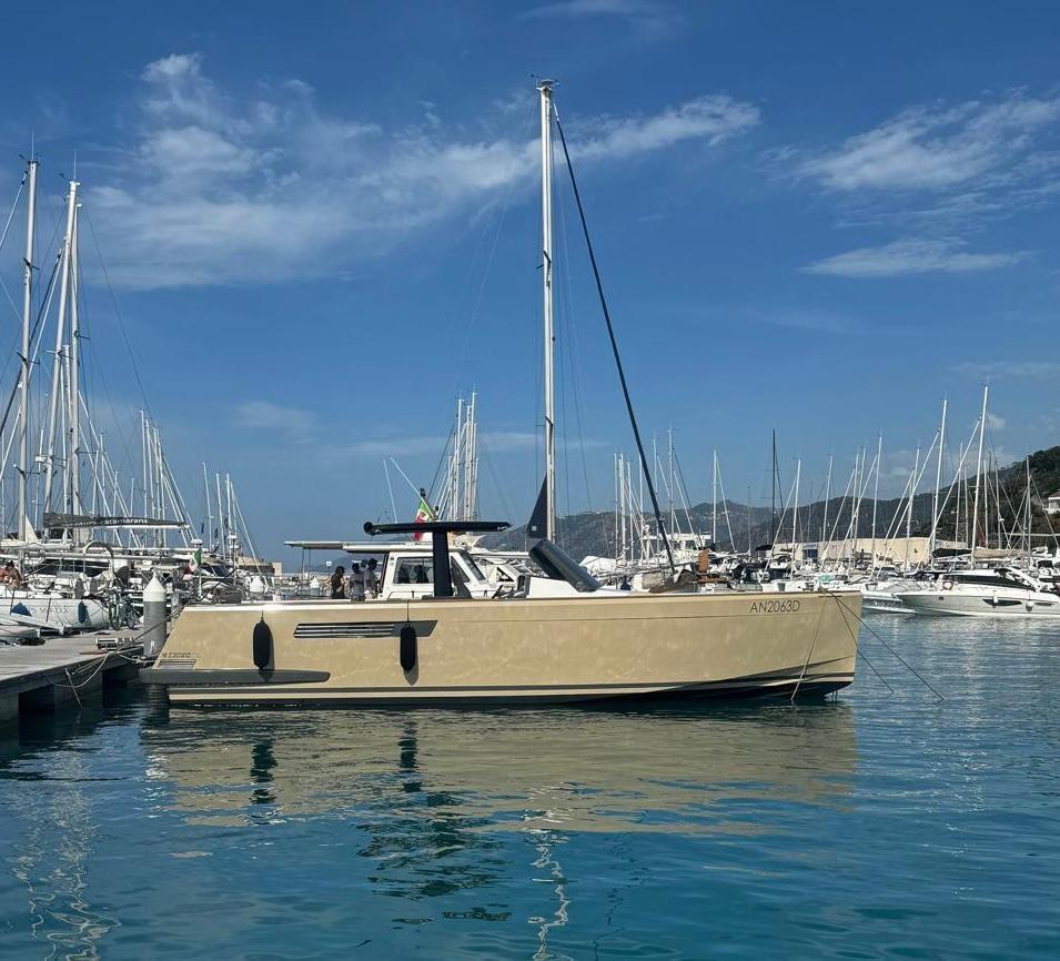 Engine Alarm, Bilge Alarm, Anchor (10kg + 50m SS chain with hydraulic arm system), Water pressure pump, 6 Batteries (2x90 Ah (engines) + 4x160 Ah AGM (service)), 6 Folding cleats, Draining System, Teak Side Decks, Deck Shower, Electric Flaps (Volvo trim tabs), Fire Extinguishing System (firebuoy), Flaps Indicators, Washbasin in the cockpit, Courtesy Lights ((Option)), Underwater lights ((Option)), Platform (extended and fixed), 2 Automatic Bilge Pump, Entry door (sliding), Teak Cockpit, Shorepower connector, Electric Windlass, swimming ladder, cockpit table (on electric pedestal convetible into sunpad), 2 guard rails with gates, Horn, T-Top (painted Jet black).