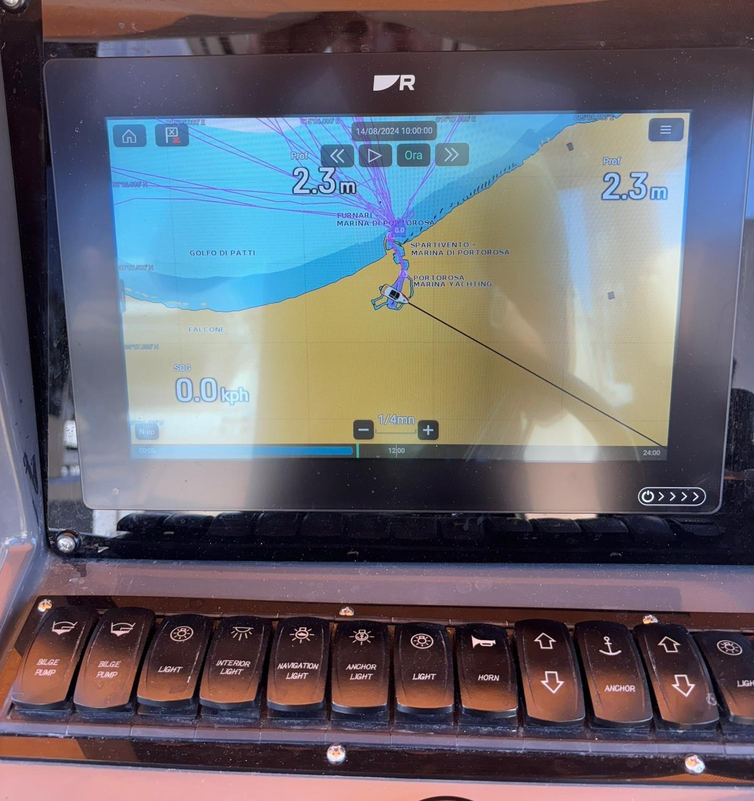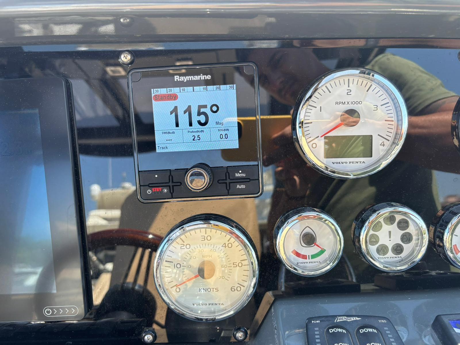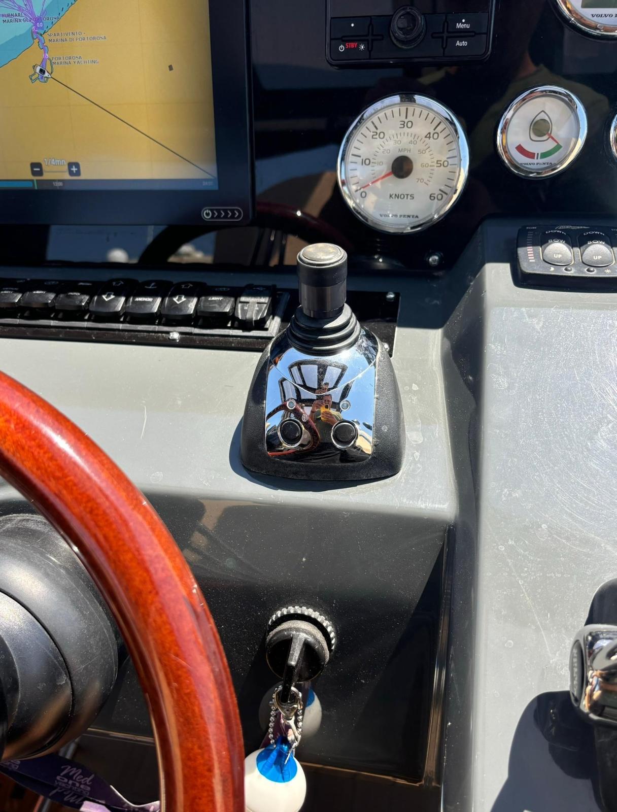 Rudder angle indicator, Electronic engine control (Volvo EVC + 2x 2,5" engines displays), Chain counter ((Option) Quick), Display ((Option) Volvo Trip Computer 7"), DSC vhf (Raymarine 260), Joystick, Autopilot ((Option) Raymarine Evolution), Chartplotter (Raymarine GS125), 2 Co-pilot seat.