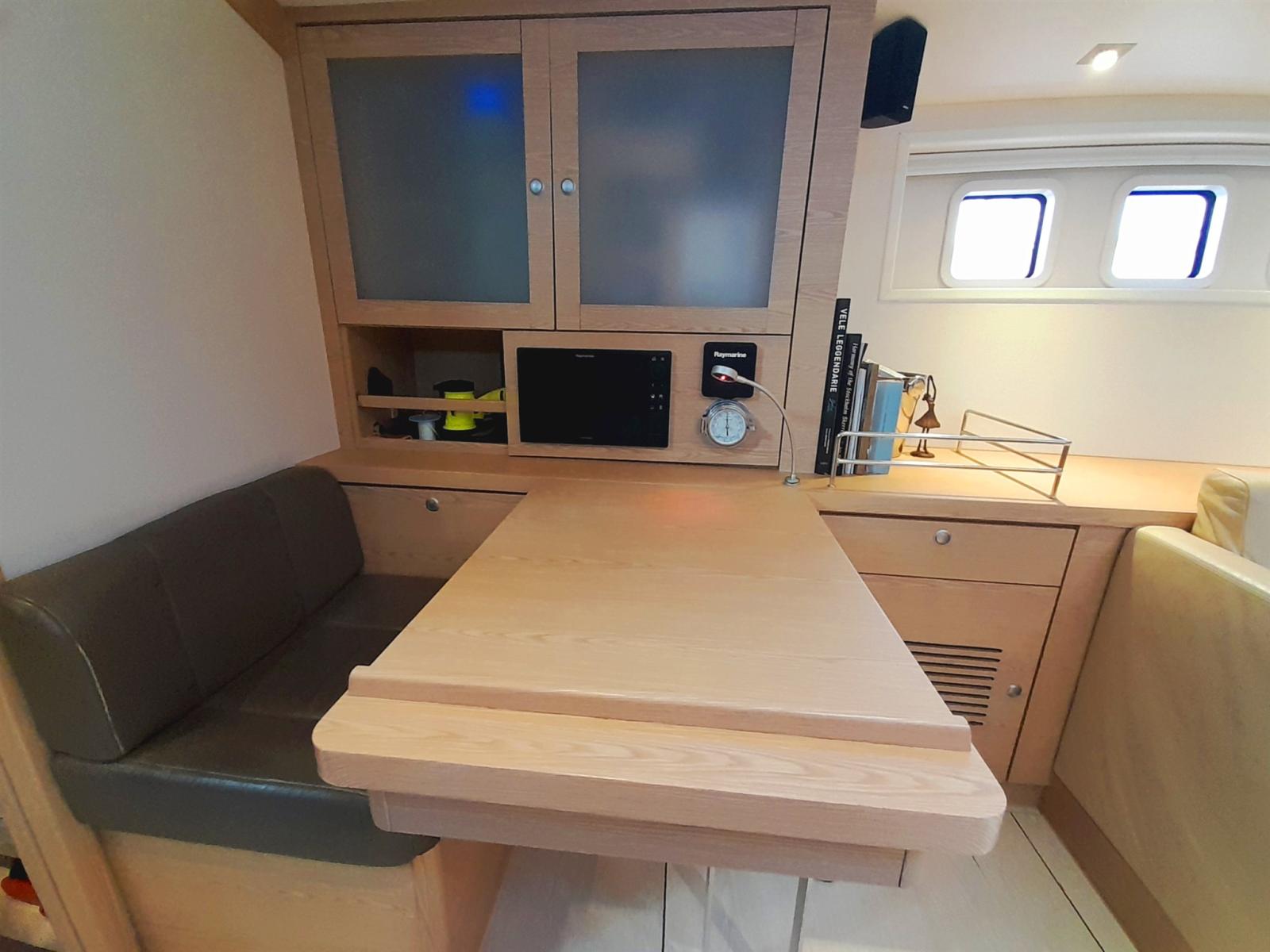 Three-seater sofa on the starboard side with cabinet with retractable TV.