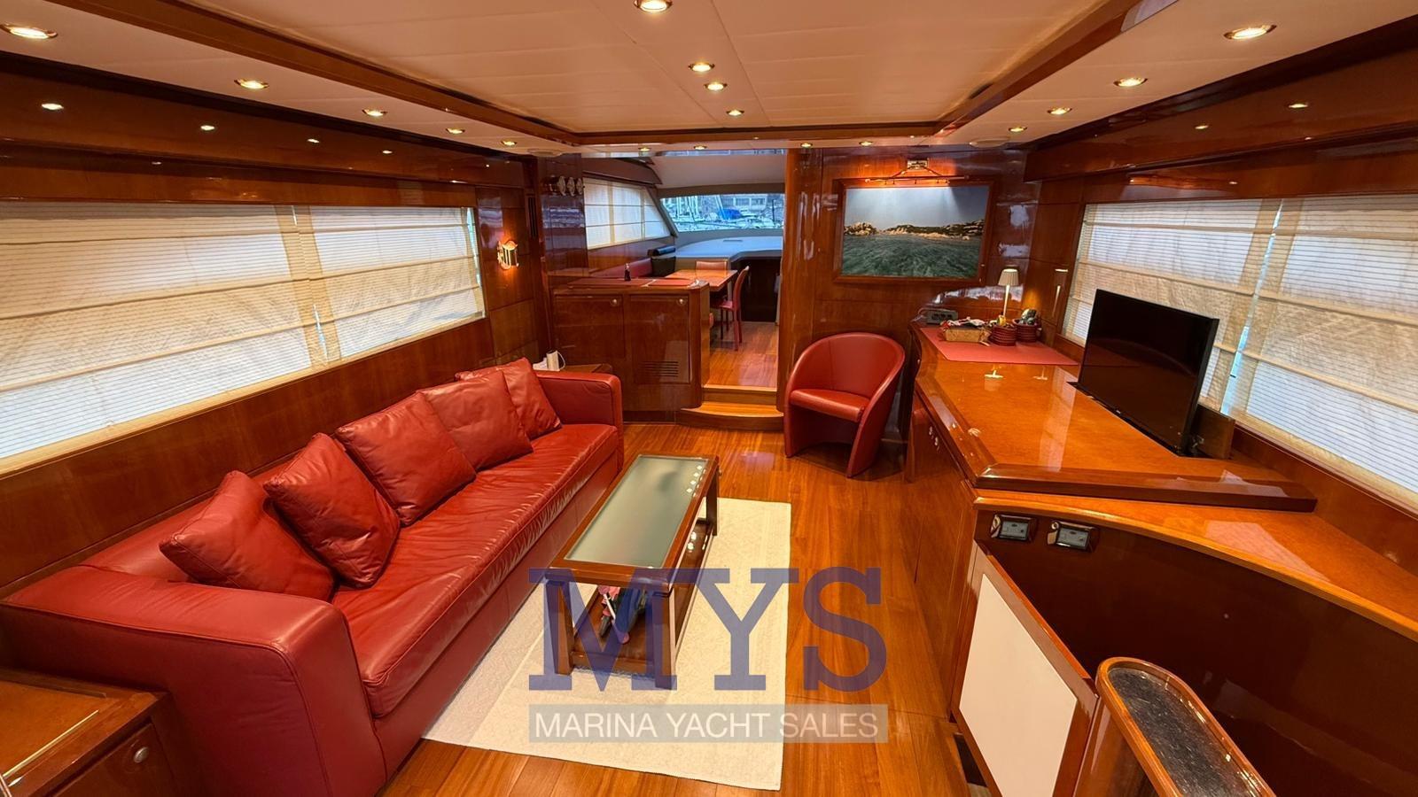 Interiors in polished cherry wood, leather finishes, large saloon with L-shaped sofa - bar cabinet with retractable TV - Dining area for 8 people - Internal steering console -