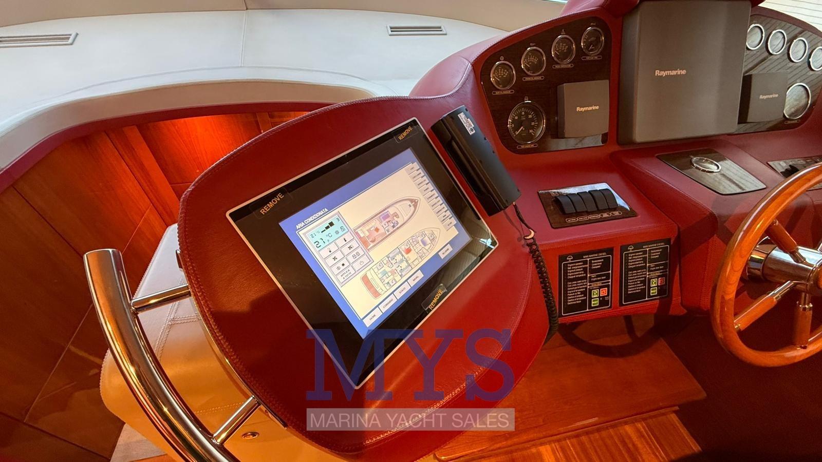 Fume/Gas Detector, Engine Alarm, Bilge Alarm, 2 Water pressure pump (nuove), 12 Batteries (2024), Draining System, Teak Side Decks, 3 Battery charger (2024), Shore power cable, Deck Shower, Twin Steering, Directional Spotlight, Hydraulic Flaps, 2 Crane (idrauliche), Fire Extinguishing System, Flaps Indicators, Anchor Chain Washdown, Courtesy Lights, Underwater lights, Outboard engine for tender (30 Hp), 8 Fenders, Gangway (idraulica a scomparsa), Platform, Automatic Bilge Pump, Manual Bilge Pump, Seawater Pump (2024), Entry door, Side door (elettrica), Teak Cockpit, Shorepower connector, Water harbor connector system, Voltage Rectifier, Rollbar, Electric Windlass, swimming ladder (idraulica), Saddles for tender, cockpit table, Tender (Zodiac 3.20), 2 guard rails with gates (a poppa), Horn, 2 Stern Winches, 3 Bow Winches.