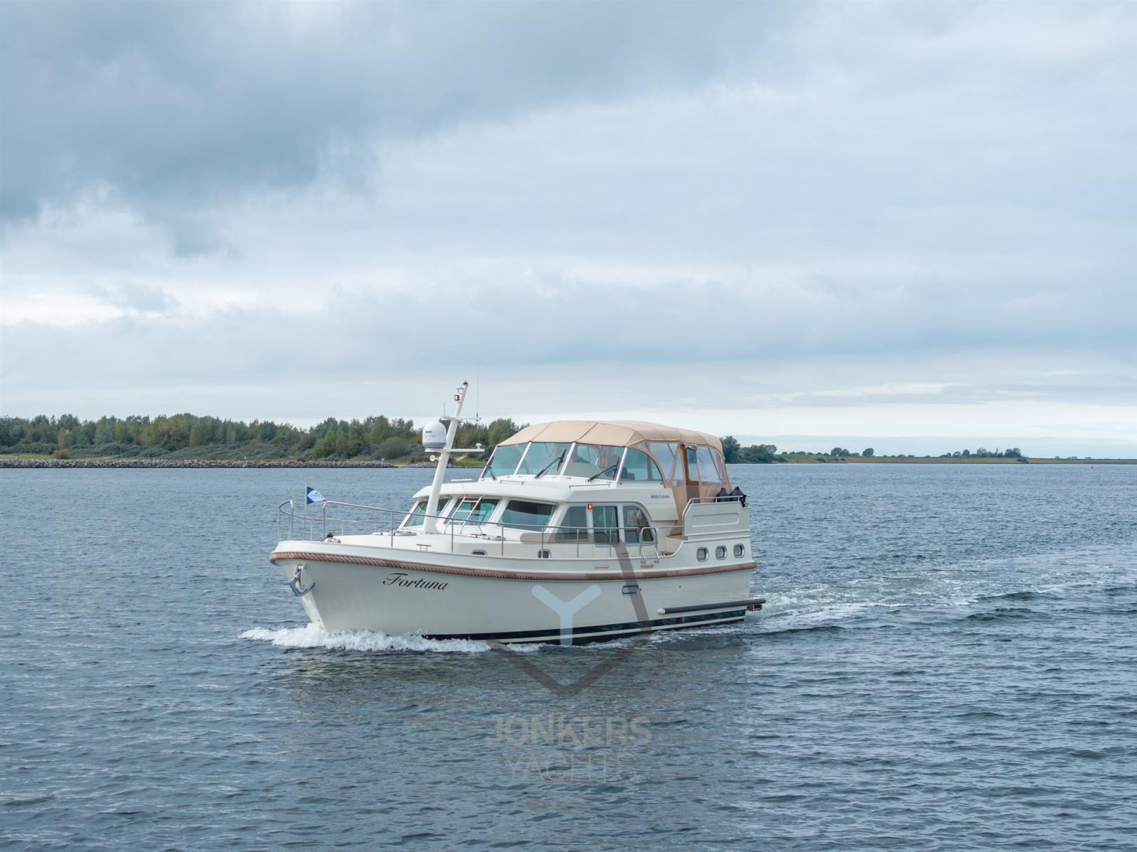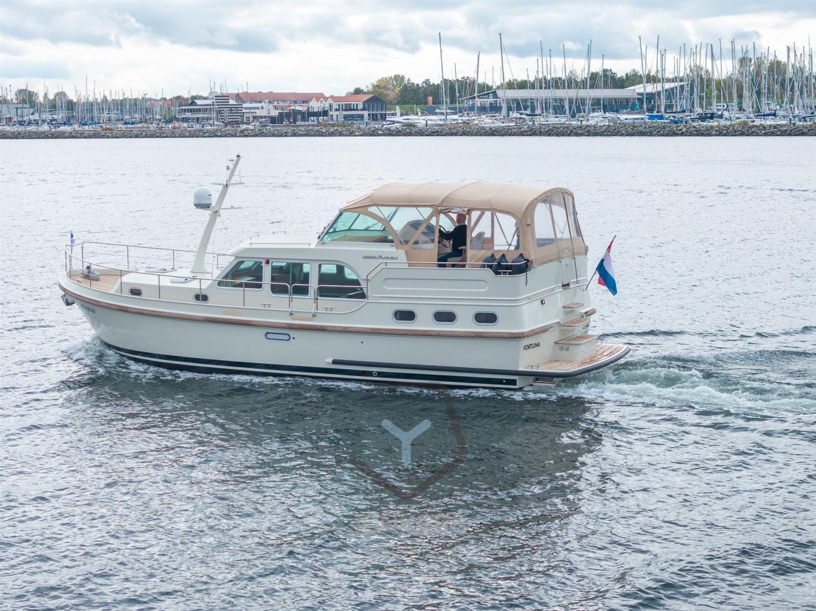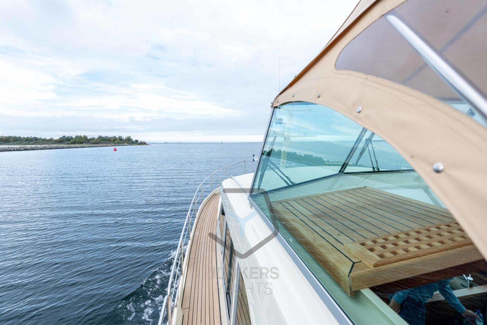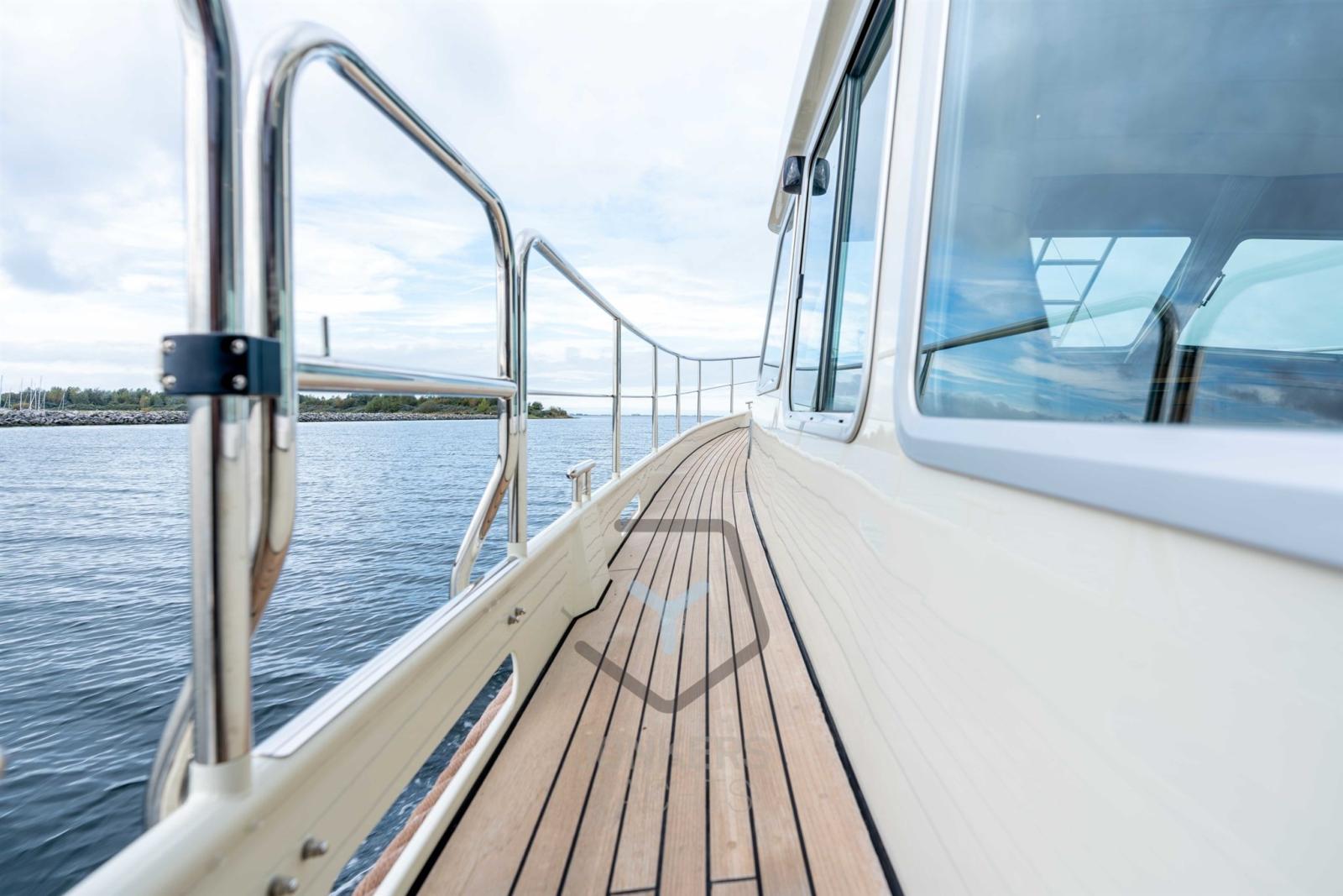 This ship has teak on aft deck, gunwales and foredeck, autopilot, chartplotter, hot-air outlets in the outside helm station, refrigerator drawer as extra in saloon, indirect lighting etc.