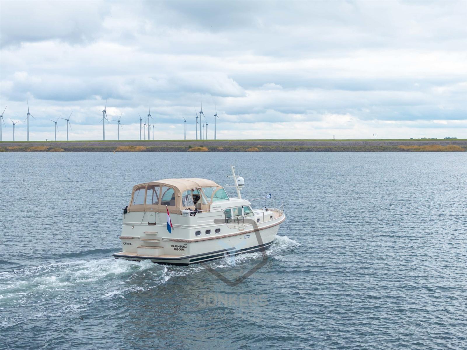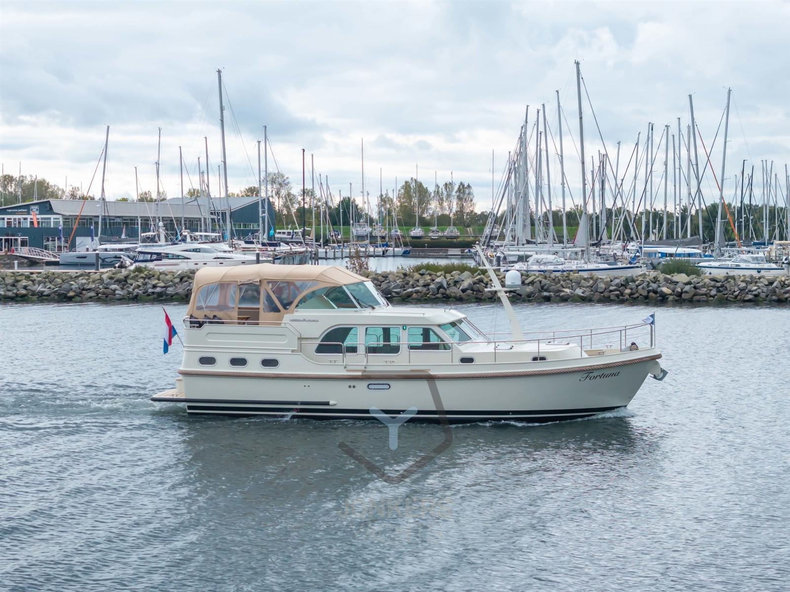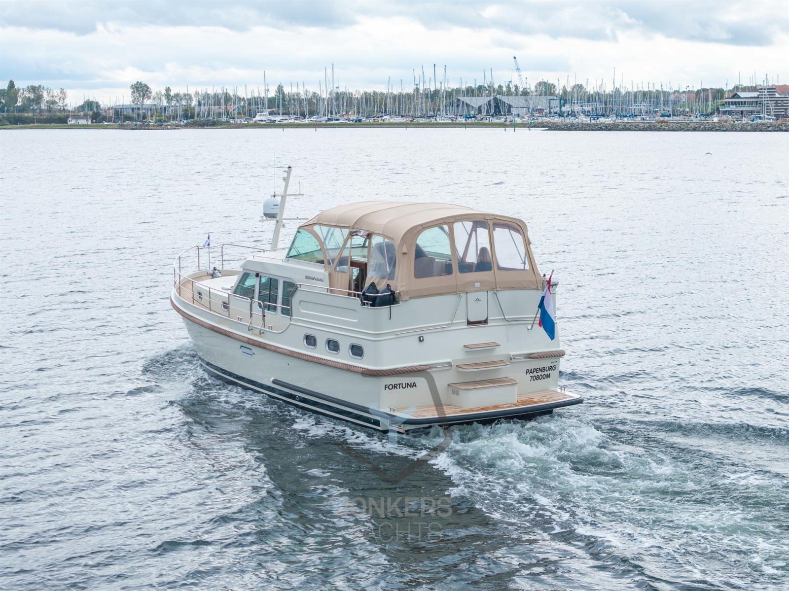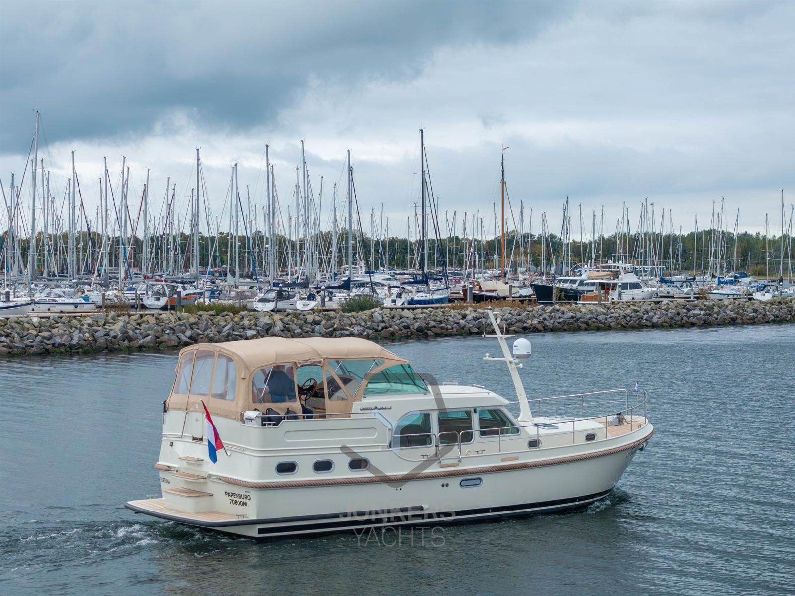 This ship has teak on aft deck, gunwales and foredeck, autopilot, chartplotter, hot-air outlets in the outside helm station, refrigerator drawer as extra in saloon, indirect lighting etc.
