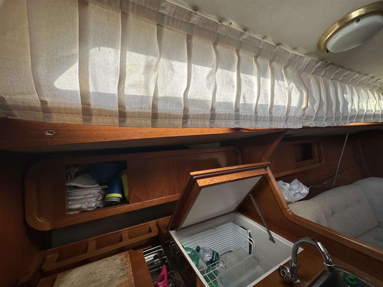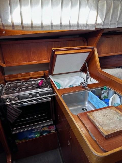 Galley (Doppio lavello frigo a pozzetto stipetti), Burner (2 fuochi), Oven (Basculante), Refrigerator (A pozzetto).