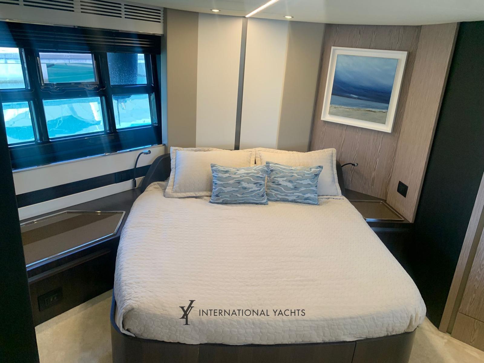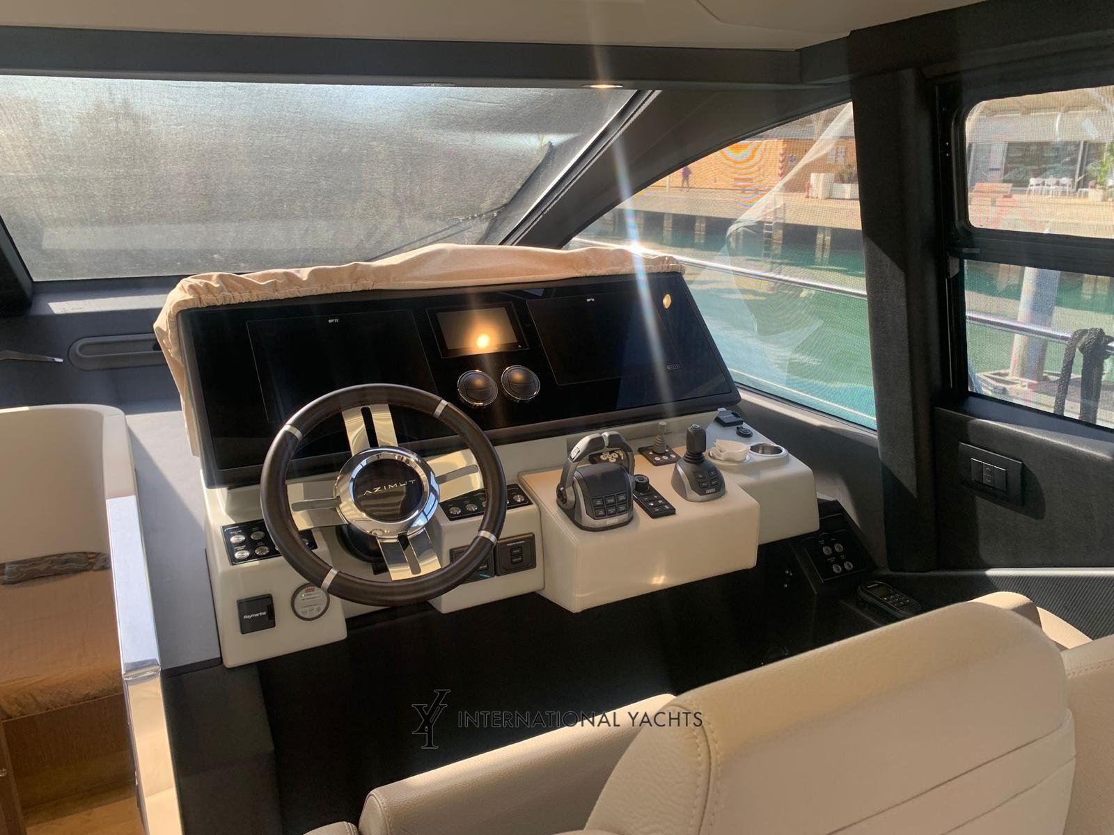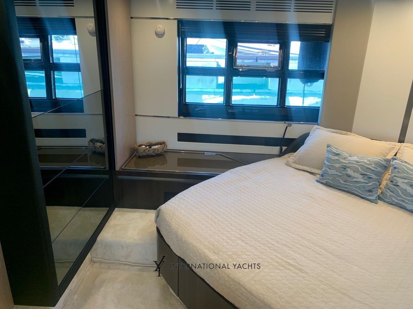 Air conditioning (72000BTU), Bimini (On flybridge and bow with carbon poles), Kitchen (Miele induction), Complete cushions (In Batyline), Bow cushions (In Batyline), Oven (Miele), 2 External refrigerator (In cockpit and on flybridge), Blinds (Electric awning for lounge roof), Internal wooden floor (Lounge, dinette and stairwell), Window covers, Electric awning (Sunshade in cockpit with inverter), manual marine toilet (Tecman with integrated bidet), Mosquito nets (Porthole), Volvo Interceptor system; Racor Filters for Generator; Double Racor filters; Predisposition for desalinator; Additional electrical ducts; Galvanic isolator; Cabinet in the cockpit with refrigerator, barbecue and sink; Folding backrest for fly sundeck; Fixed roof with glass inserts; Up and down system for living room TV; Anchor (Steel), Chain counter (With controls on the bridge), 3 Displays (Raymarine Axiom+ 12), Bow thruster - bow thruster (6.5 kw), 6 Fixed lights at the stern, Adjustable light (Electric), Garage for tender (System hauling), Joystick, 2 Underwater lights, Gangway (Retractable), Platform (Teak), 2 Side doors, Dock water connection, VHF Radio (Ray 90), Co-pilot Seat, Cockpit Table (With carbon top), Folding Salon Table, 2 Electric Winch.