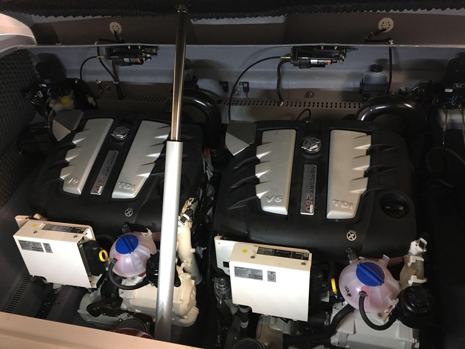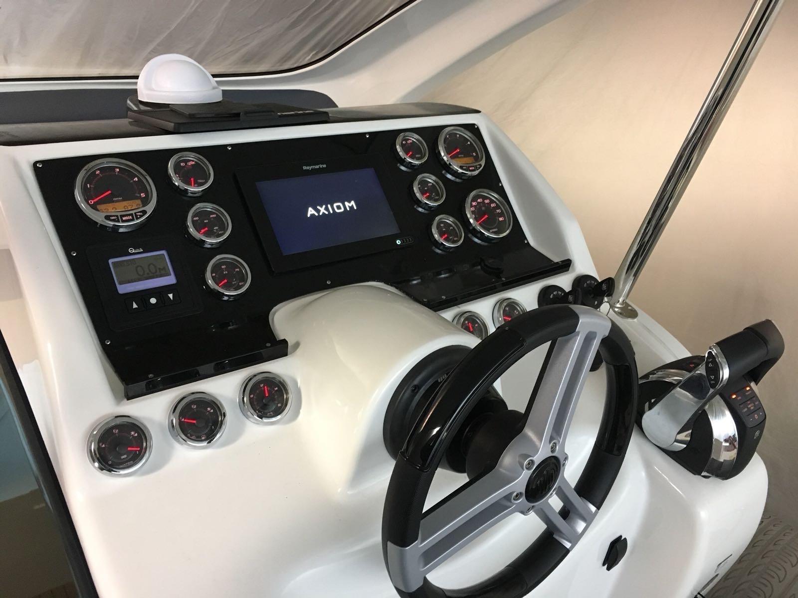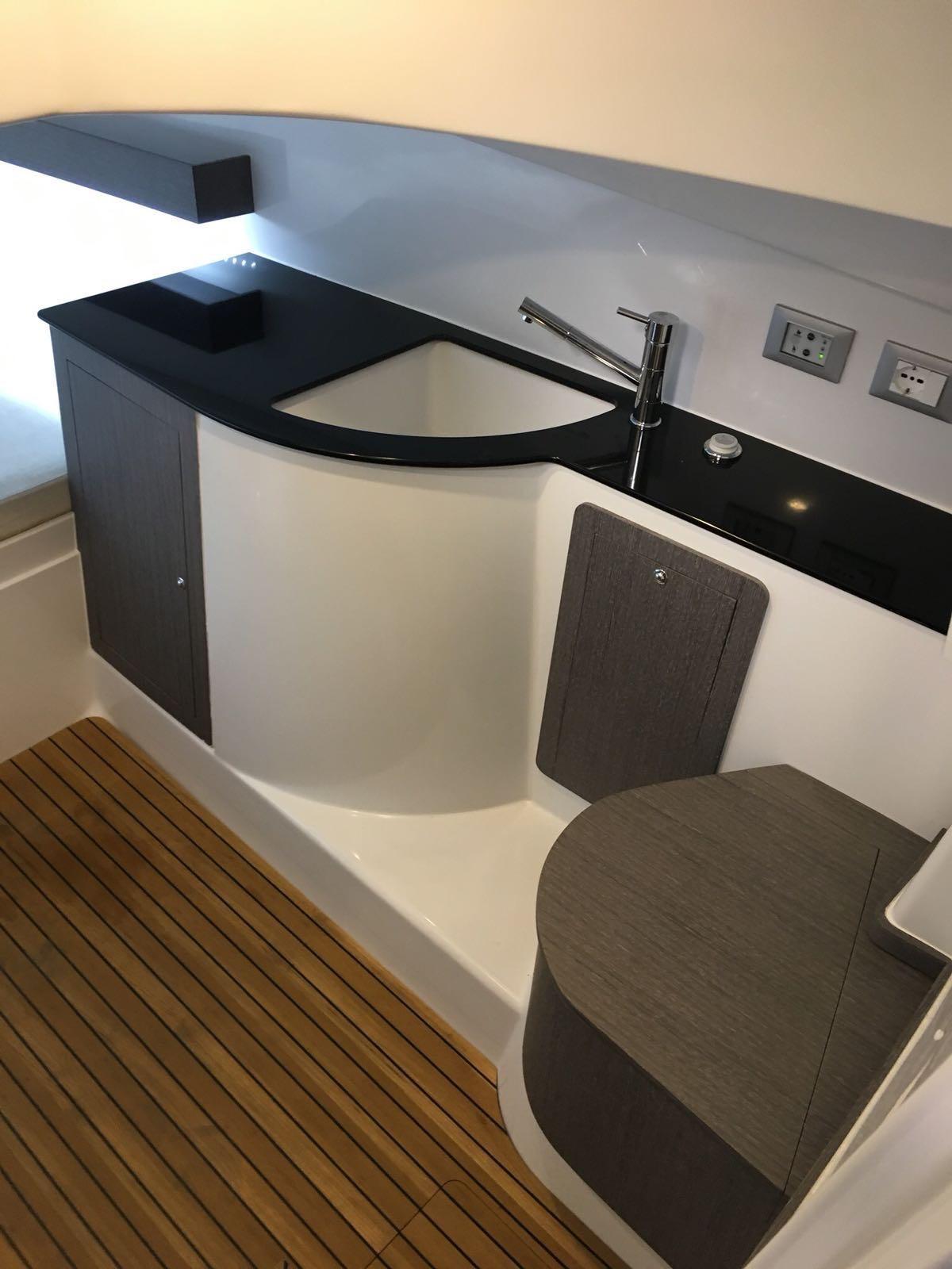 The Pirelli Pzero 1100 console with carbon hard top which leads to a large cabin with a double bed, a small wardrobe and a spacious independent bathroom with sink, toilet and shower. The sunbathing spaces are huge and comfortable with a central dinette with a minibar area equipped with a fridge, sink and a spacious icebox. This unit (year 2018), in the water for only three months a year, is powered by a double Mercruiser 260 hp EFB diesel engine with less than 300 engine hours Included are quay circuit 220, Raymarine GPS/ECO, stereo radio, electric toilet, autoclave with shower, stern platform and bow walkways covered in teak. Interior description cabin with double bed, a small wardrobe and a spacious independent bathroom with sink, toilet and shower. GPS - ECO instrumentation, electric winch Armament equipment Complete bearings, refrigerator, stereo radio