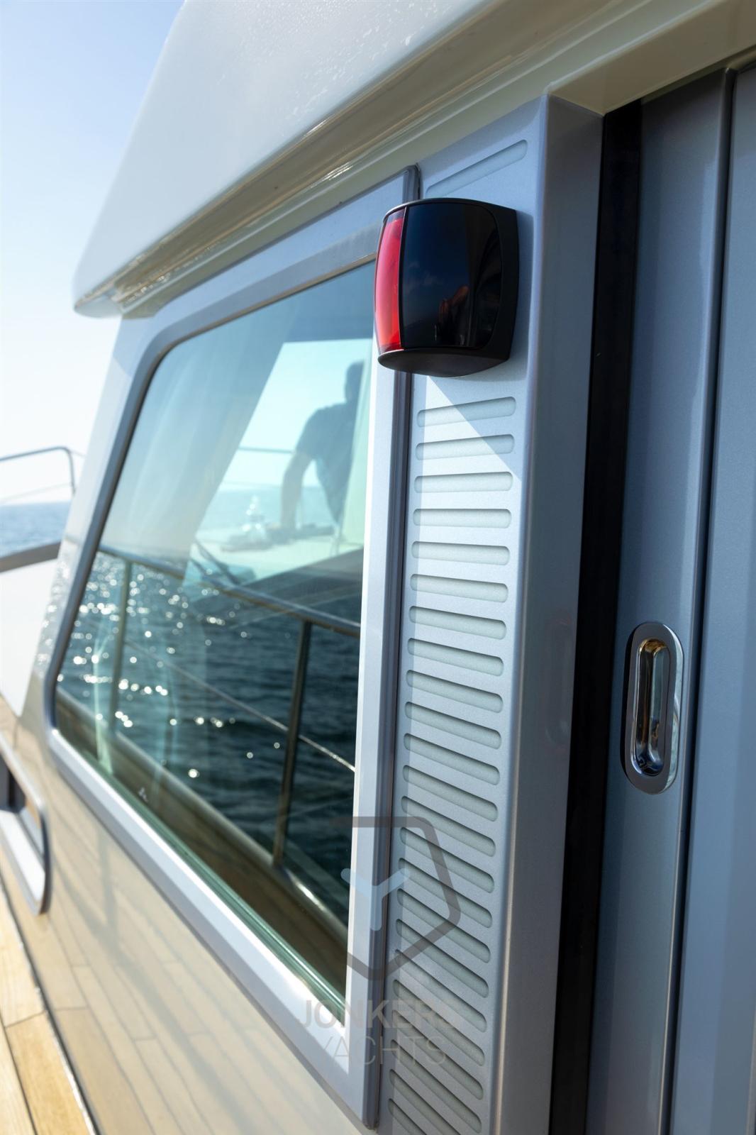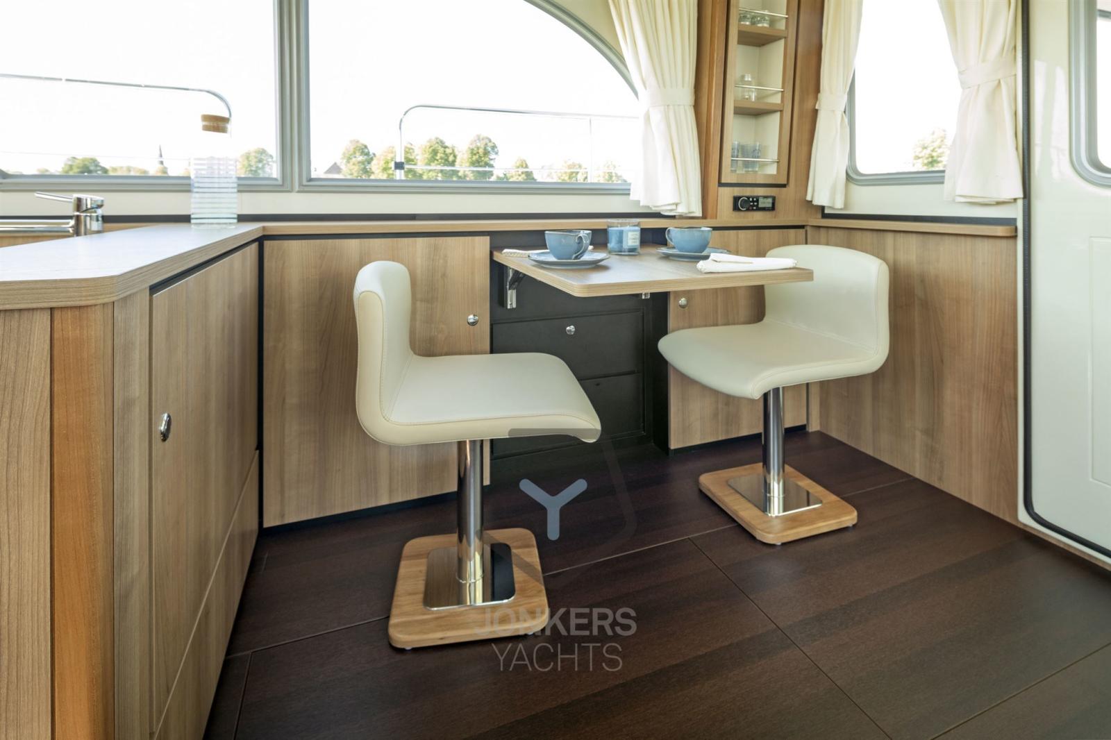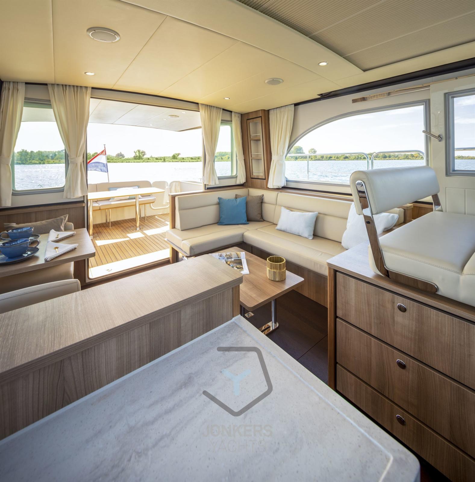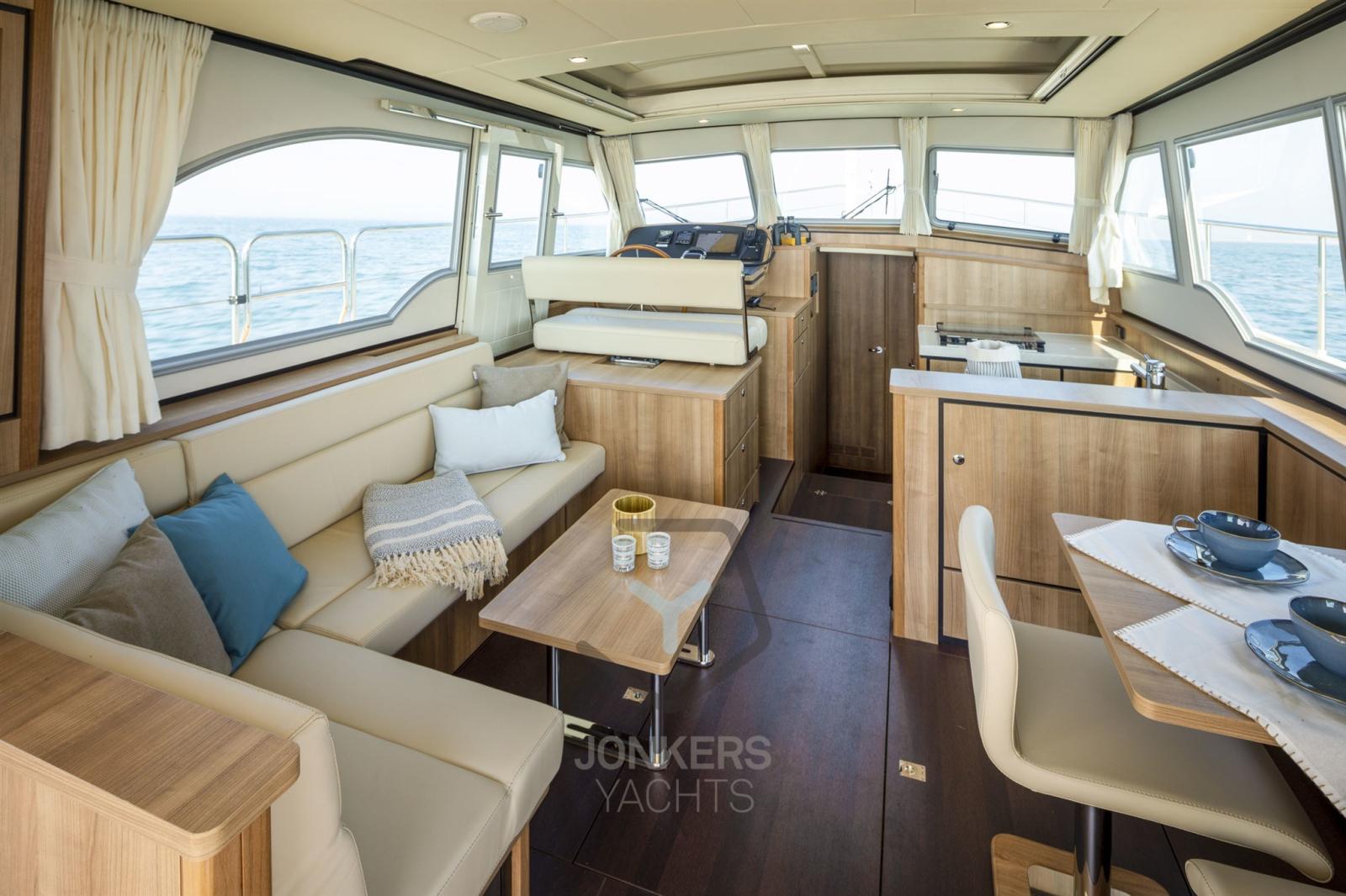 In the salon, the spacious layout features an L-shaped seating area with two tables and two separate chairs. Adjacent to the seating area is the driver's bench. The Sedan is also practical with various storage facilities in both the salon and sleeping quarters.