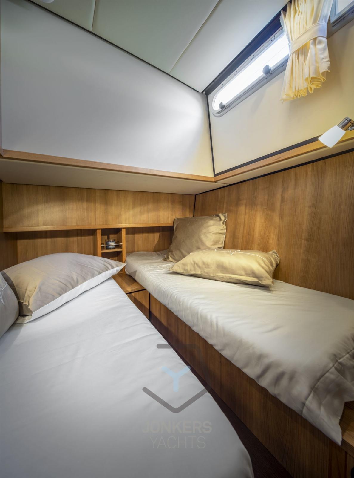 The Linssen Grand Sturdy 40.0 Sedan is the first Sedan in the Grand Sturdy® series to offer 4 permanent berths on board. Unlike the Grand Sturdy 40.0 AC, the 40.0 Sedan has the permanent berths in the forward cabin. As usual, the Sedan offers a spacious forward cabin with a double bed and various closet spaces with an adjoining separate shower and toilet area. These areas are also accessible to guests from the middle cabin. In the space between the forward cabin and the saloon is the middle cabin with two single beds.