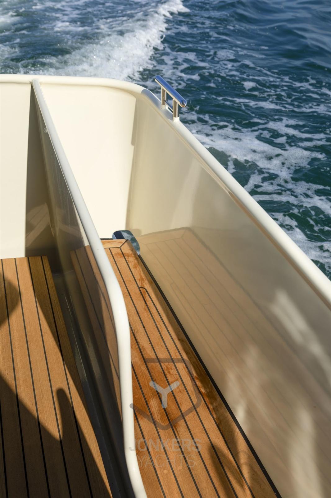On the Grand Sturdy 40.0 Sedan, the connection between saloon and cockpit is on one level, with only a low threshold. In line with the superstructure, the Linssen Longtop runs over the cockpit for protection from all weathers. The open aft cockpit features a teak floor, L-shaped seating area with coffee table, fender storage and access to the swim platform.