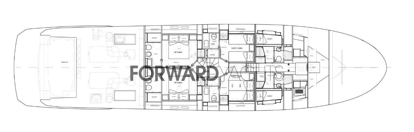 Sleeping area: 5 cabins (1 master cabin on the main deck) + 3 crew cabins.