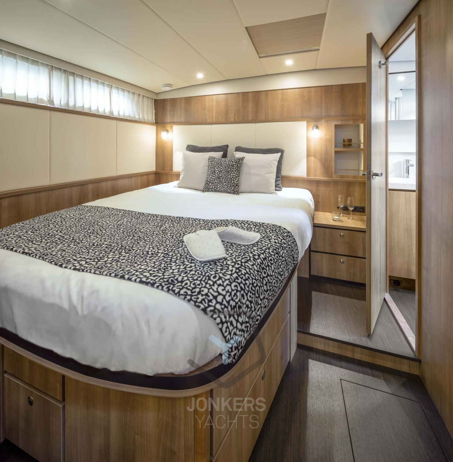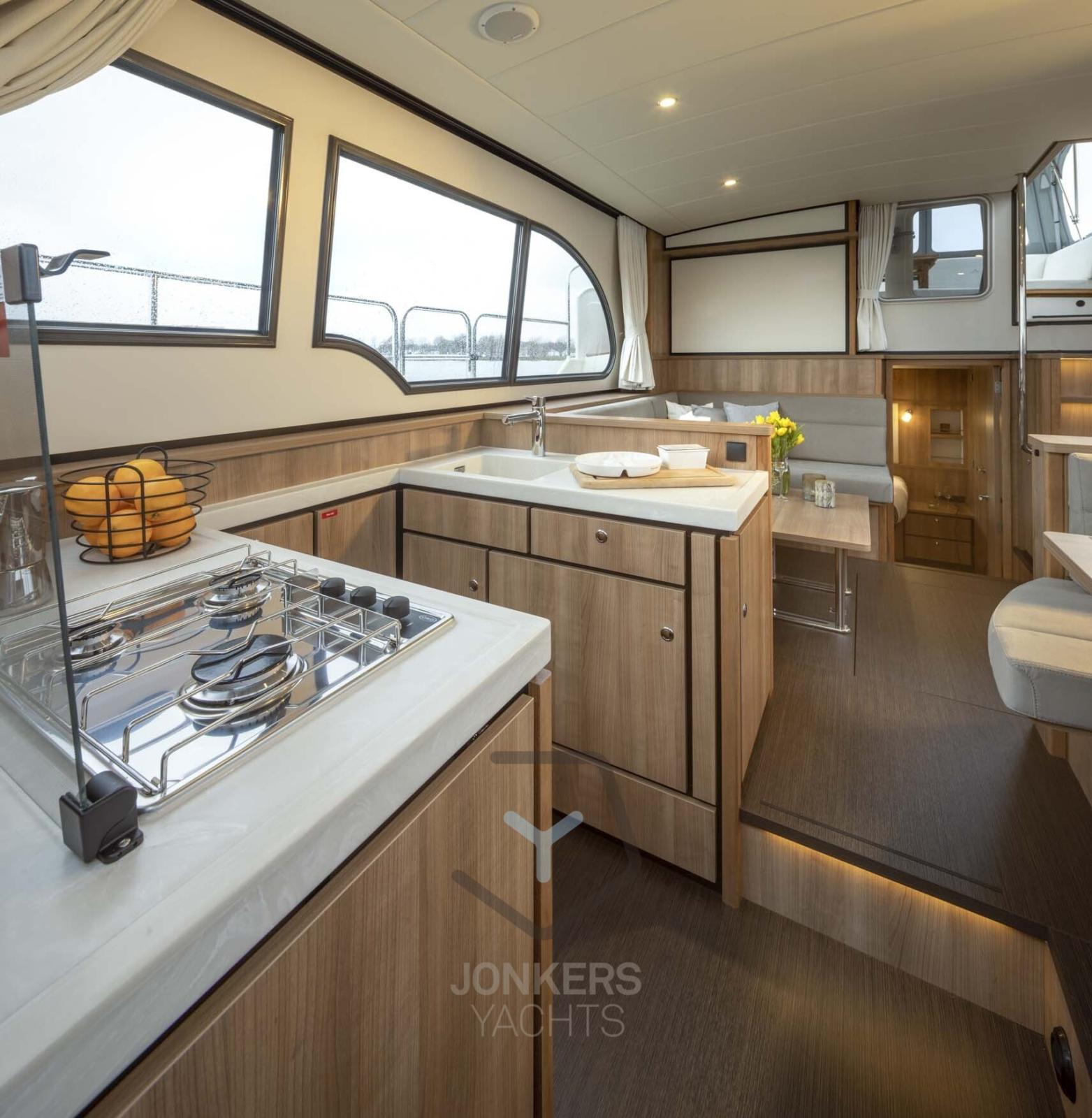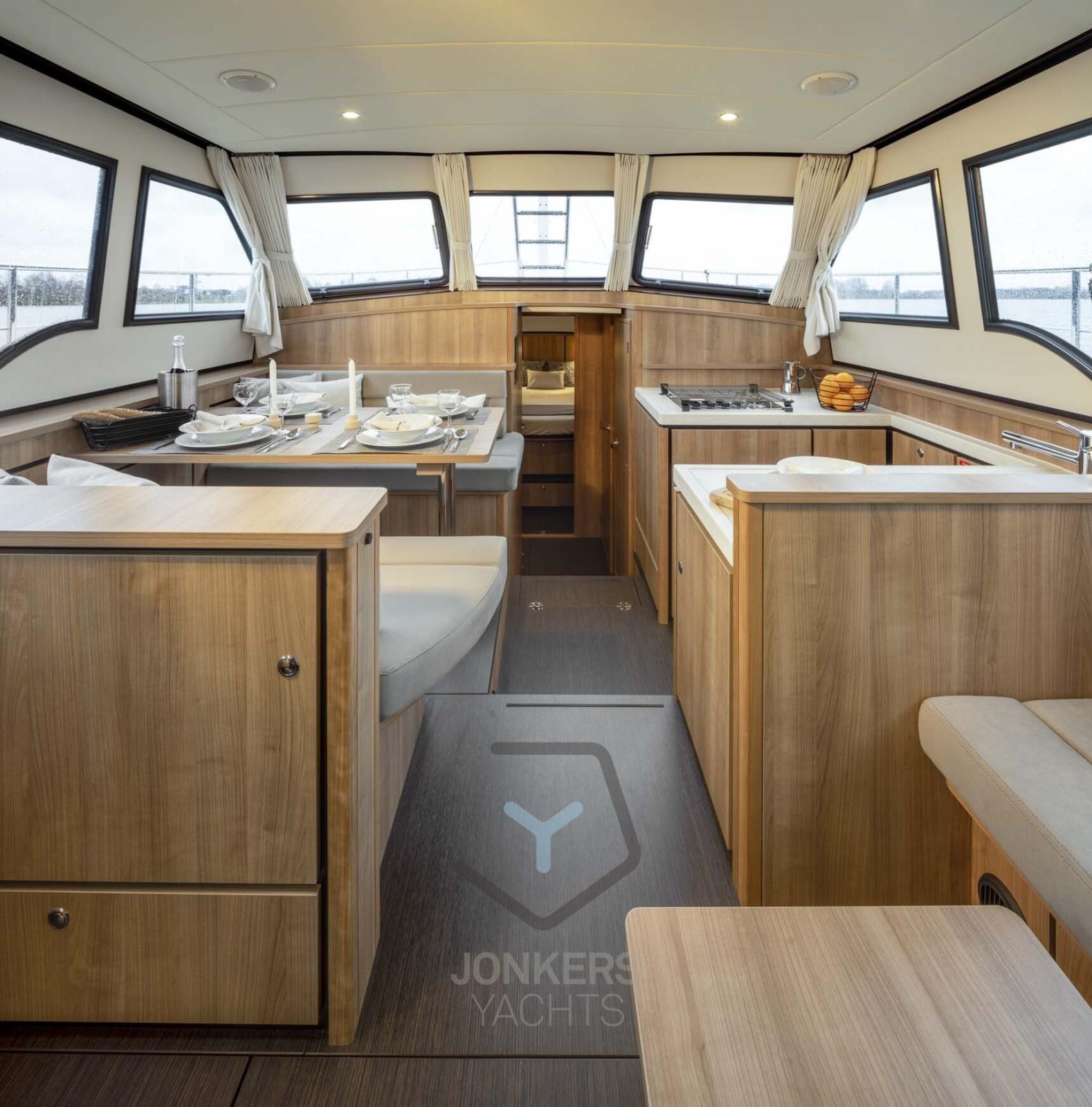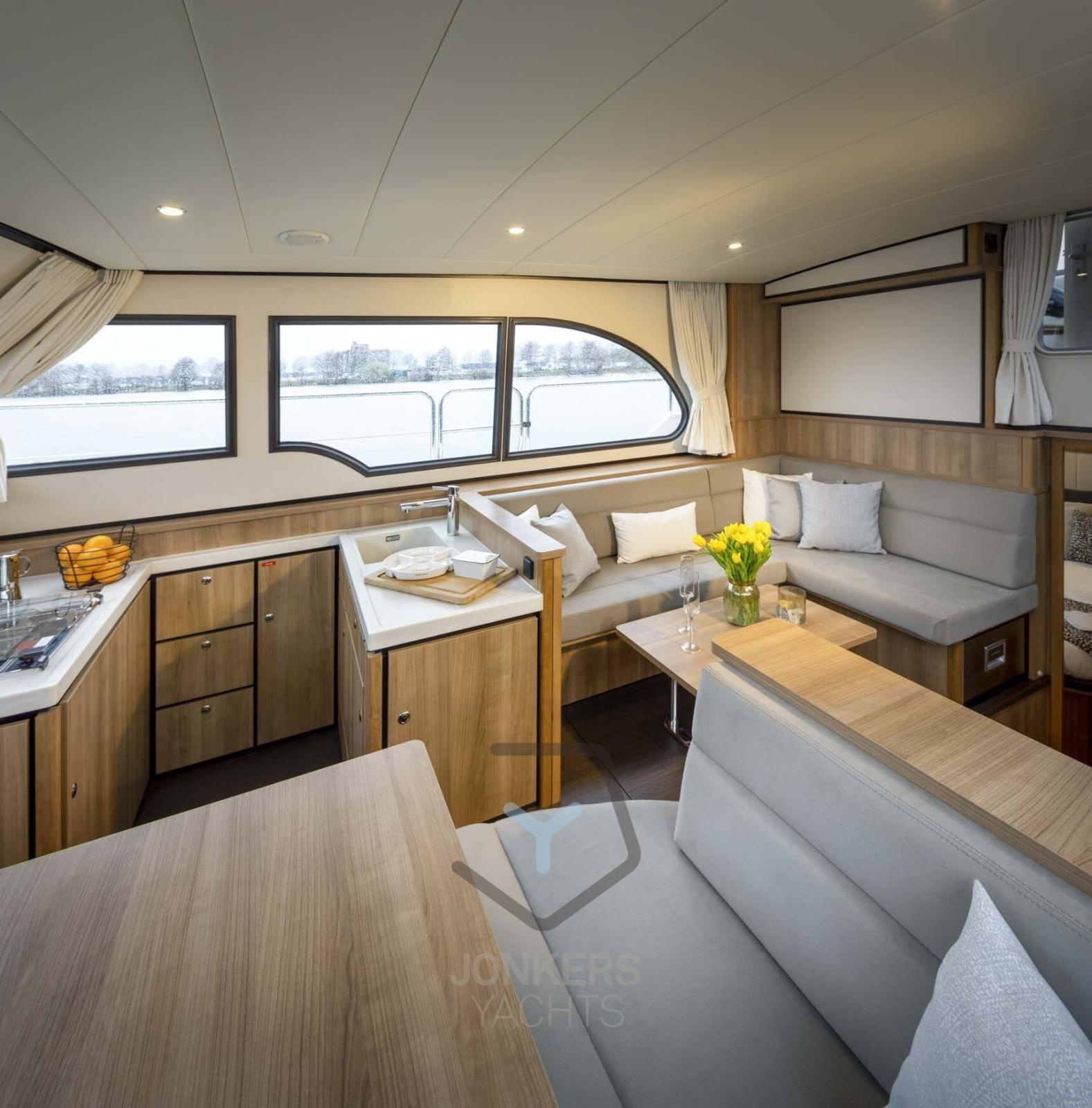 A spacious saloon with L-shaped bench seat (with Easy Sleep Convert System) and spacious galley on starboard side. Dinette with cupboard on port side. Forward cabin with free-standing twin bed and cupboards, toilet unit with electric toilet and separate shower room and a guest cabin with two single beds and cupboards.