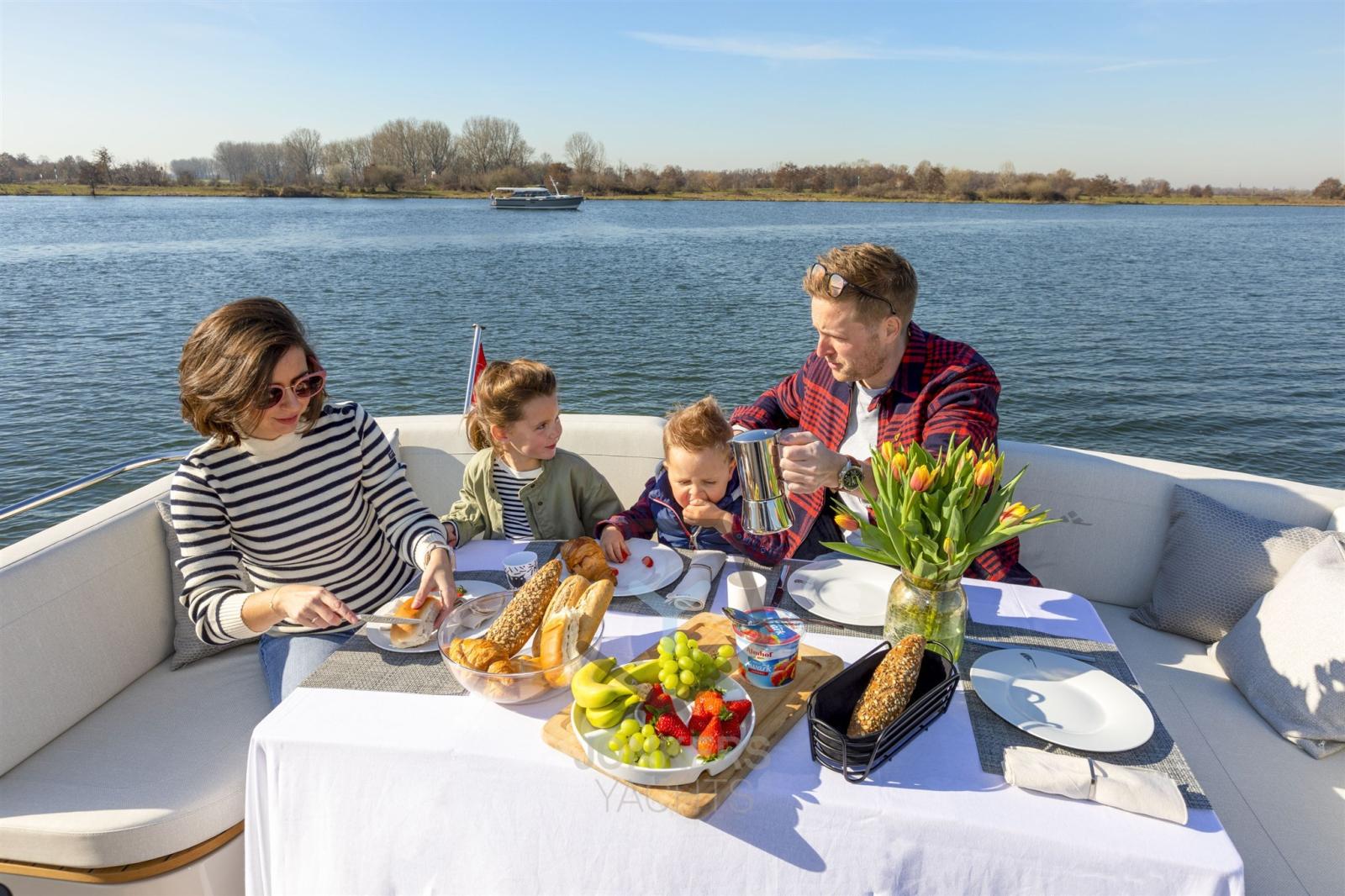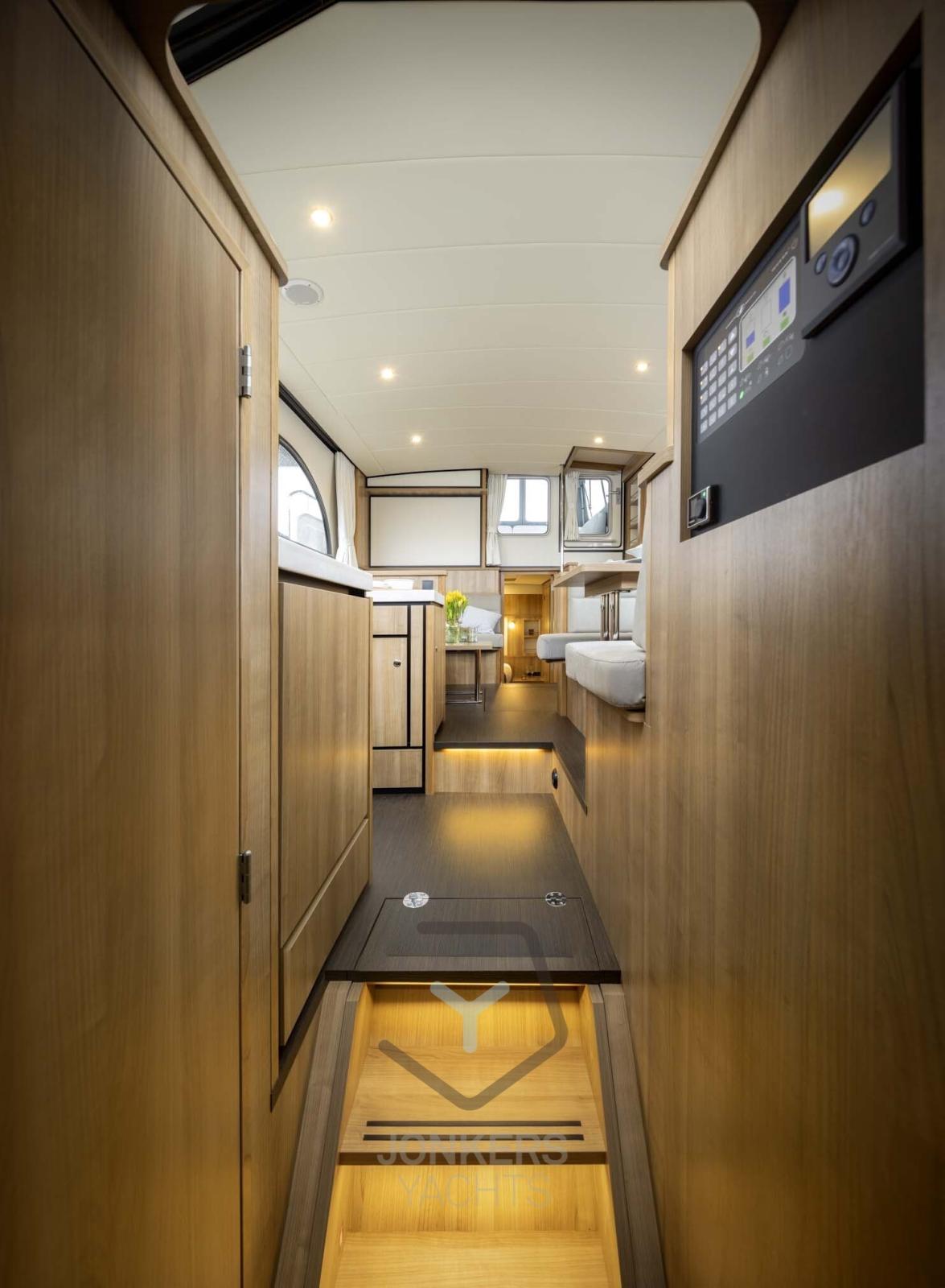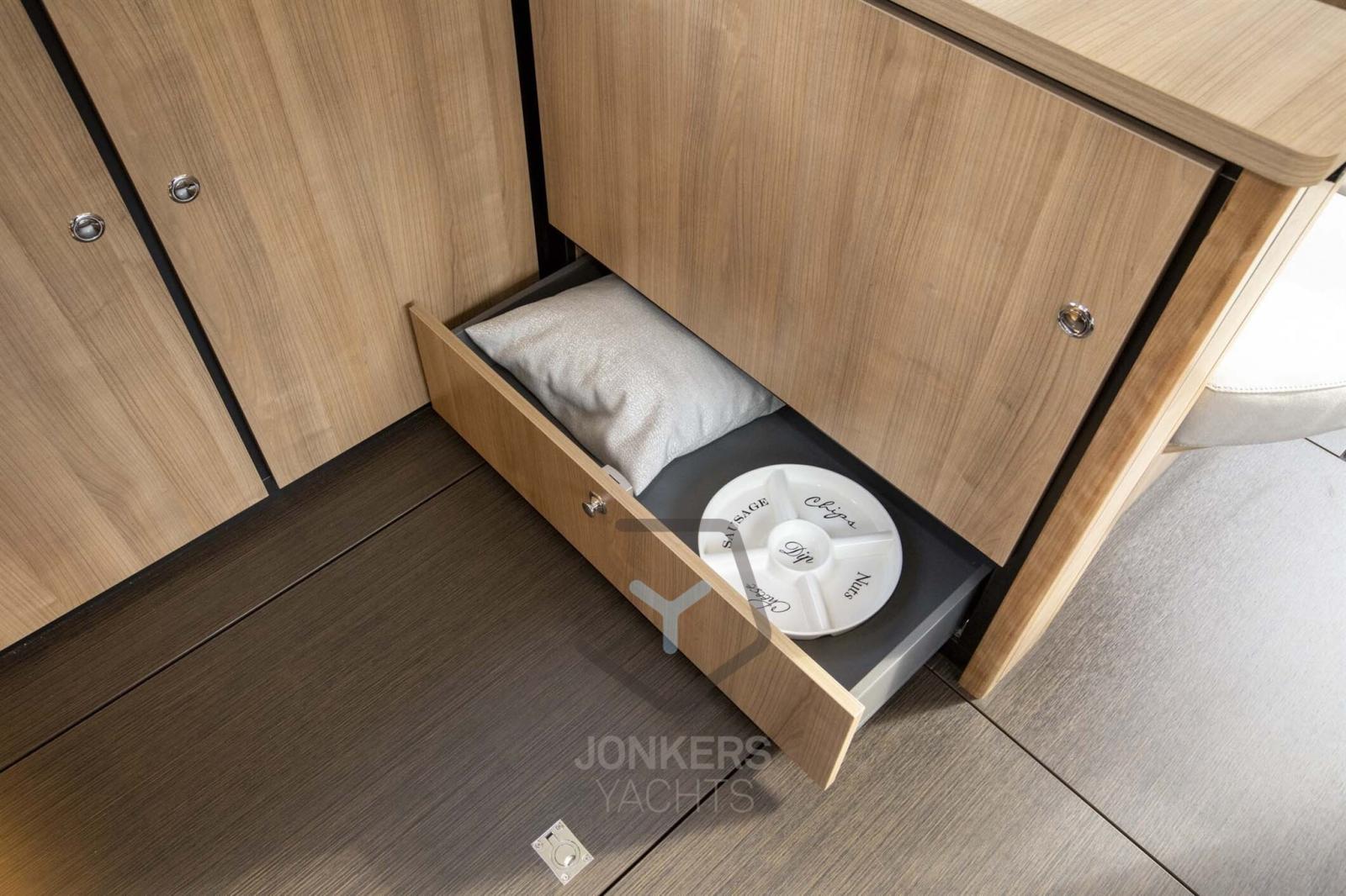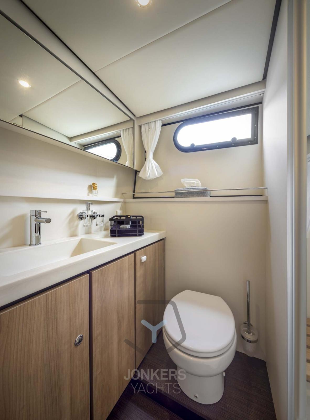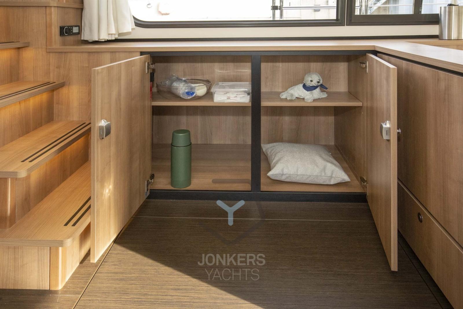 A spacious saloon with L-shaped bench seat (with Easy Sleep Convert System) and spacious galley on starboard side. Dinette with cupboard on port side. Forward cabin with free-standing twin bed and cupboards, toilet unit with electric toilet and separate shower room and a guest cabin with two single beds and cupboards.