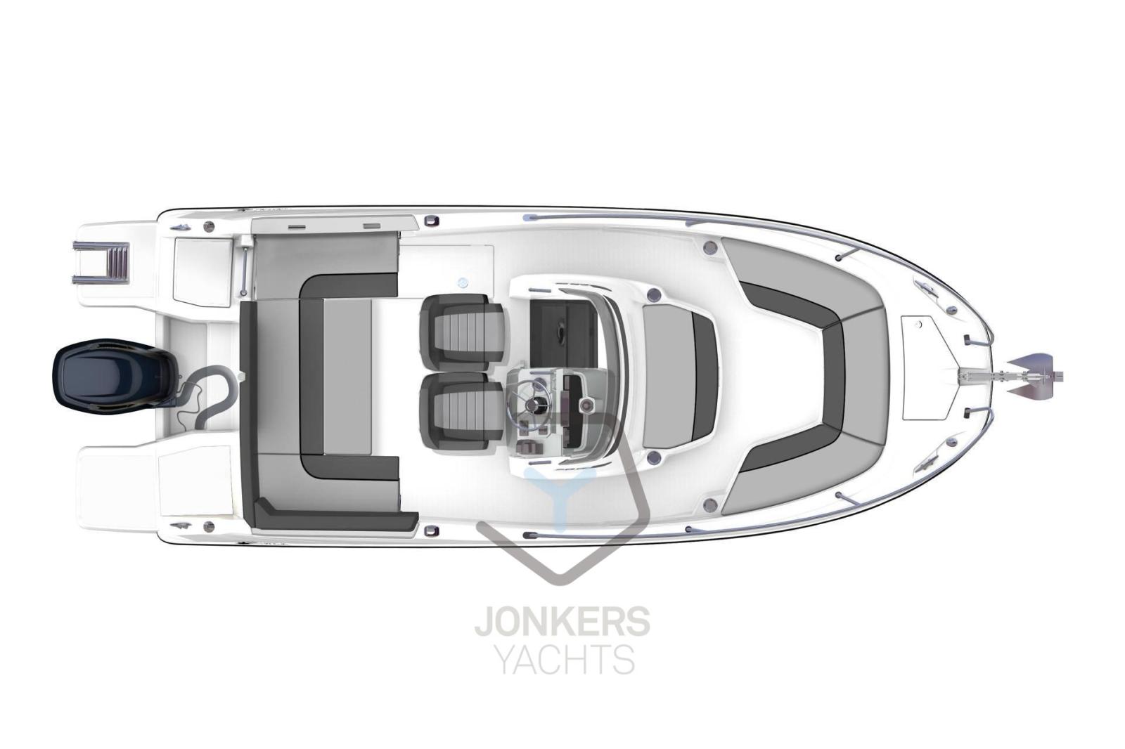 The dashboard has a new design and features the latest evolutions of the line. The front bench seat is the perfect place to relax, and it opens directly to an interior storage area. So this very practical model has double access to the console! Very large, flat swimming platforms further contribute to the ease of use on board.