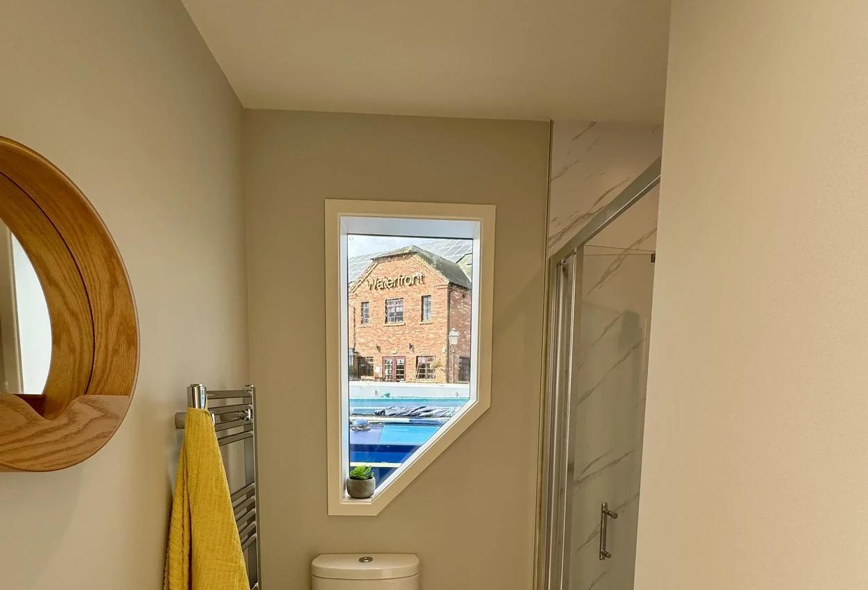 The bathroom includes modern amenities such as a toilet, wash hand basin, walk-in shower, and towel radiator.