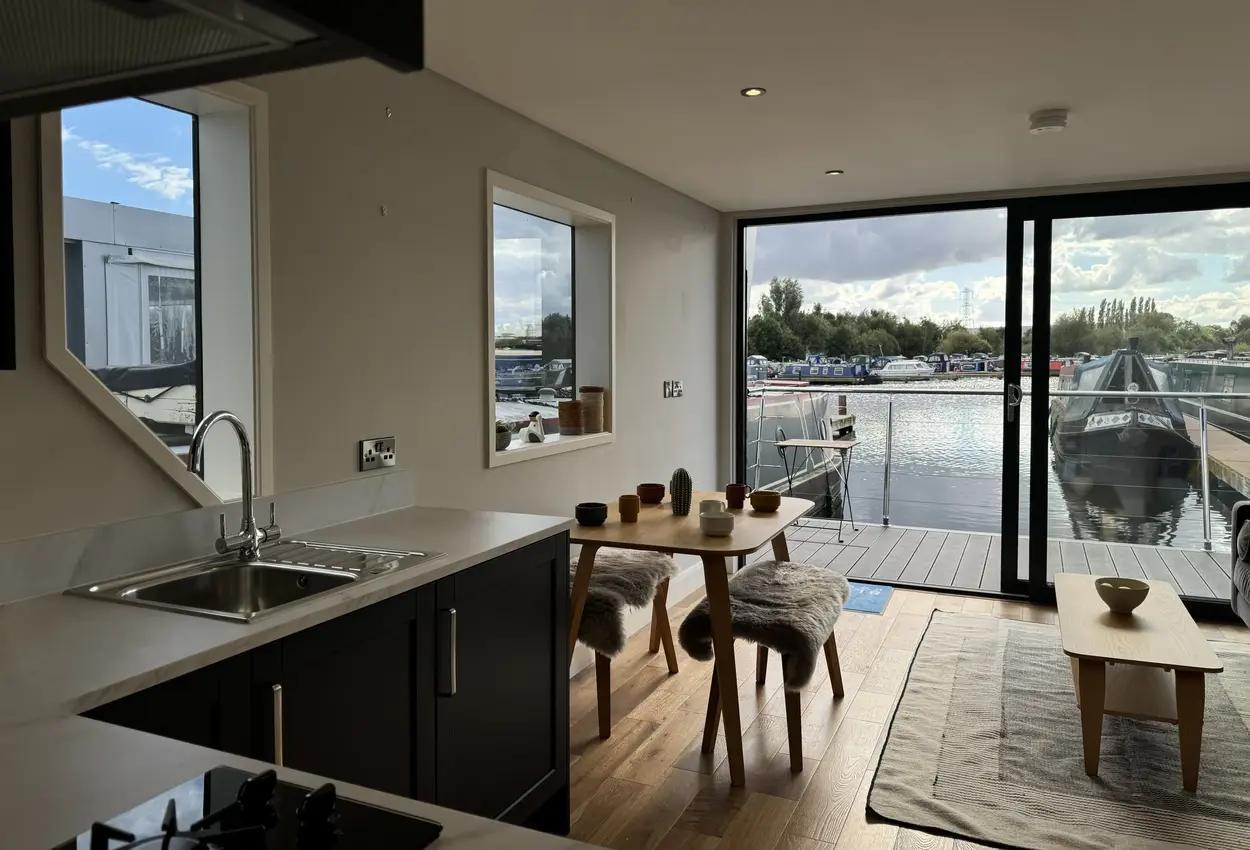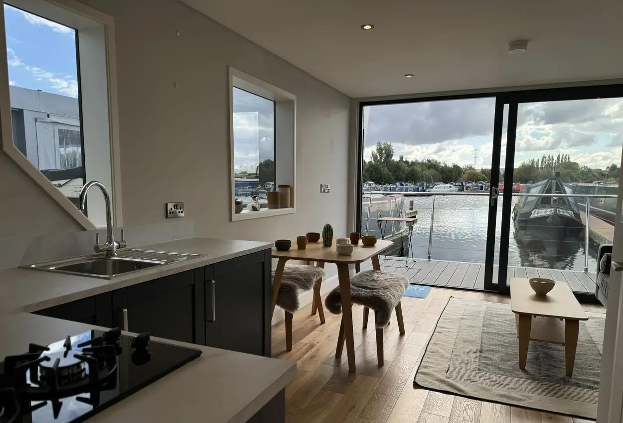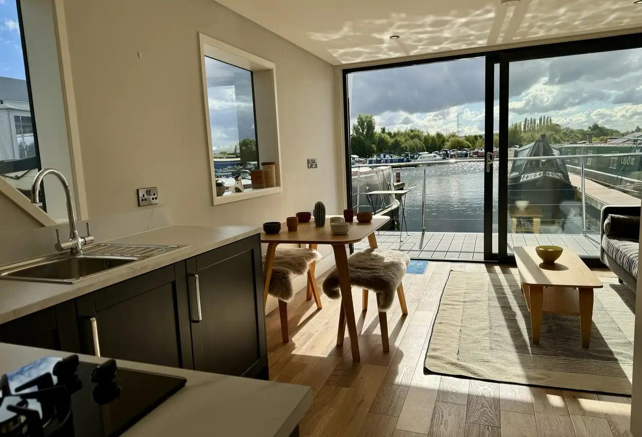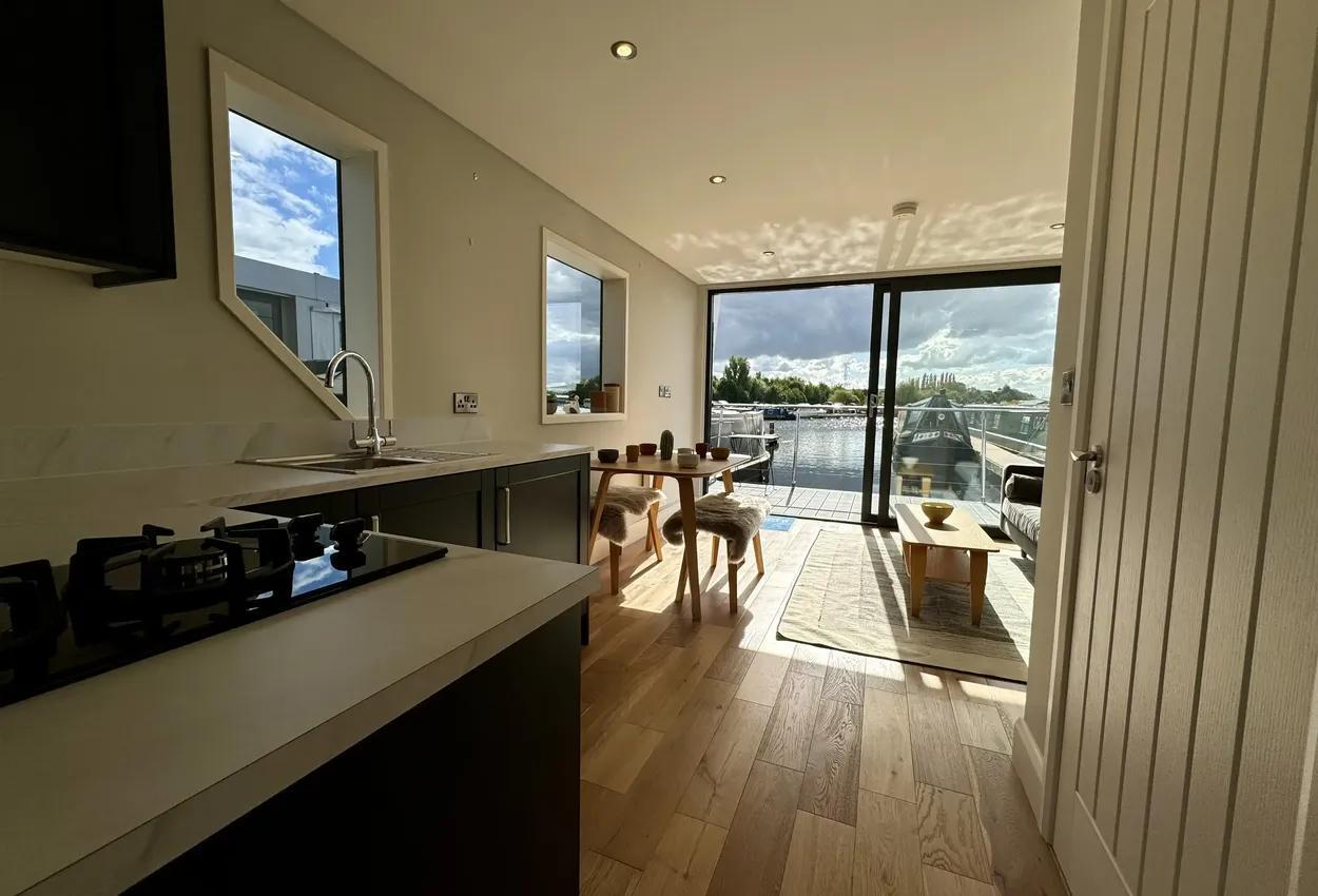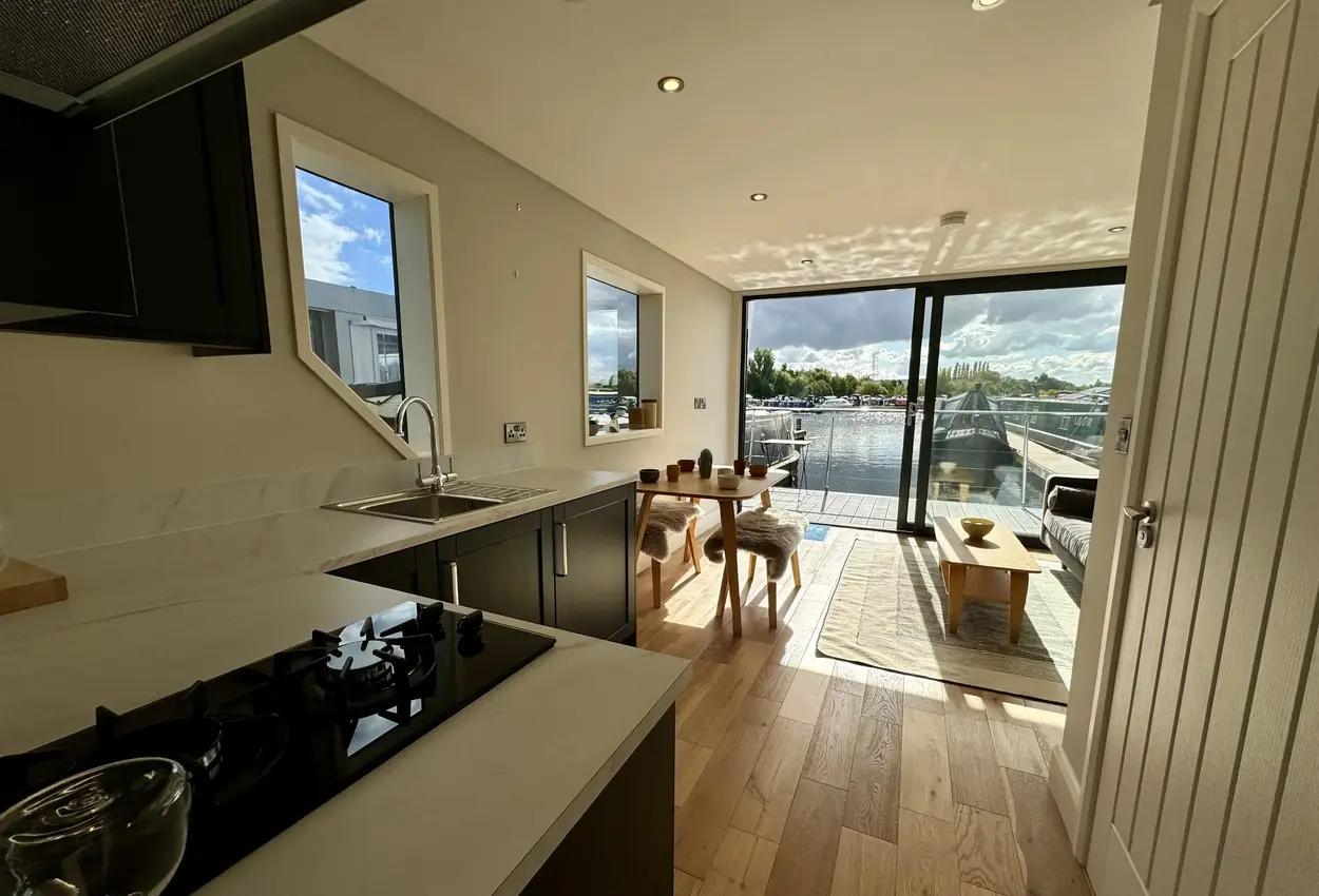 Entering the houseboat through floor-to-ceiling sliding patio doors leads into an open-plan living, kitchen, and dining area. The abundance of windows on all sides floods this space with natural light, creating a bright and inviting atmosphere. The kitchen is fully equipped with:
