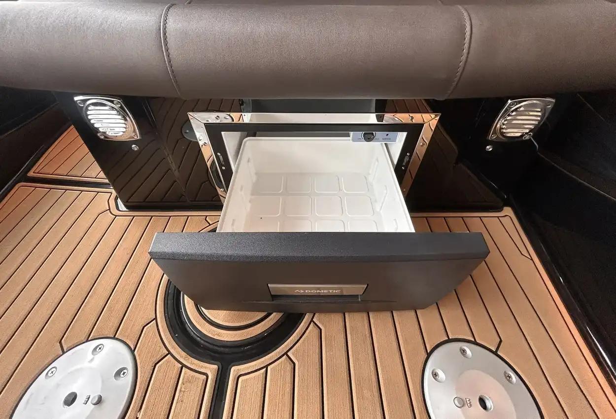 As a leader in its class, this 8-metre luxury boat can comfortably carry up to 10 passengers. It includes larger under-seat lockers, removable dining tables, and front and rear platforms for easy access, whether stepping onto dry land or diving into the big blue.