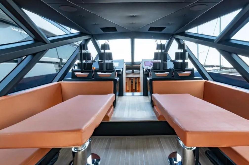 Folding cleats, Teak Side Decks, Special Colour, Deck Shower, Hydraulic Flaps, Gangway, Platform, Teak Cockpit, swimming ladder, 2 Living Room Foldable Table, Stern Winches.