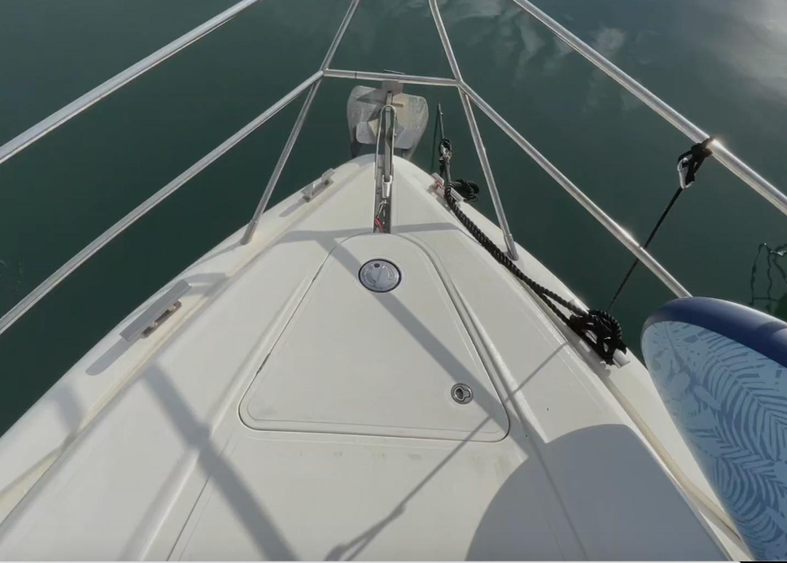 Comfort and ambiance: 1 master cabin at the front (double bed, plenty of storage, and direct access to the bathroom), 1 guest cabin with 2 single beds and wardrobe, convertible interior square bench into a resting/sleeping area, equipped kitchen (3-burner gas stove, 2-basin sink, refrigerator, microwave), interior and exterior refrigerators, reversible air conditioning, sunbathing areas, TV, Pionner Radio-CD, interior-exterior speakers, bathroom (large shower, toilet), washing machine.