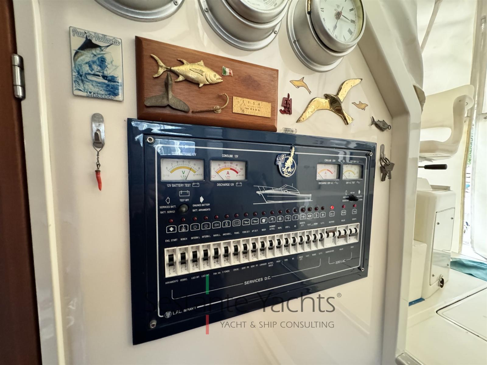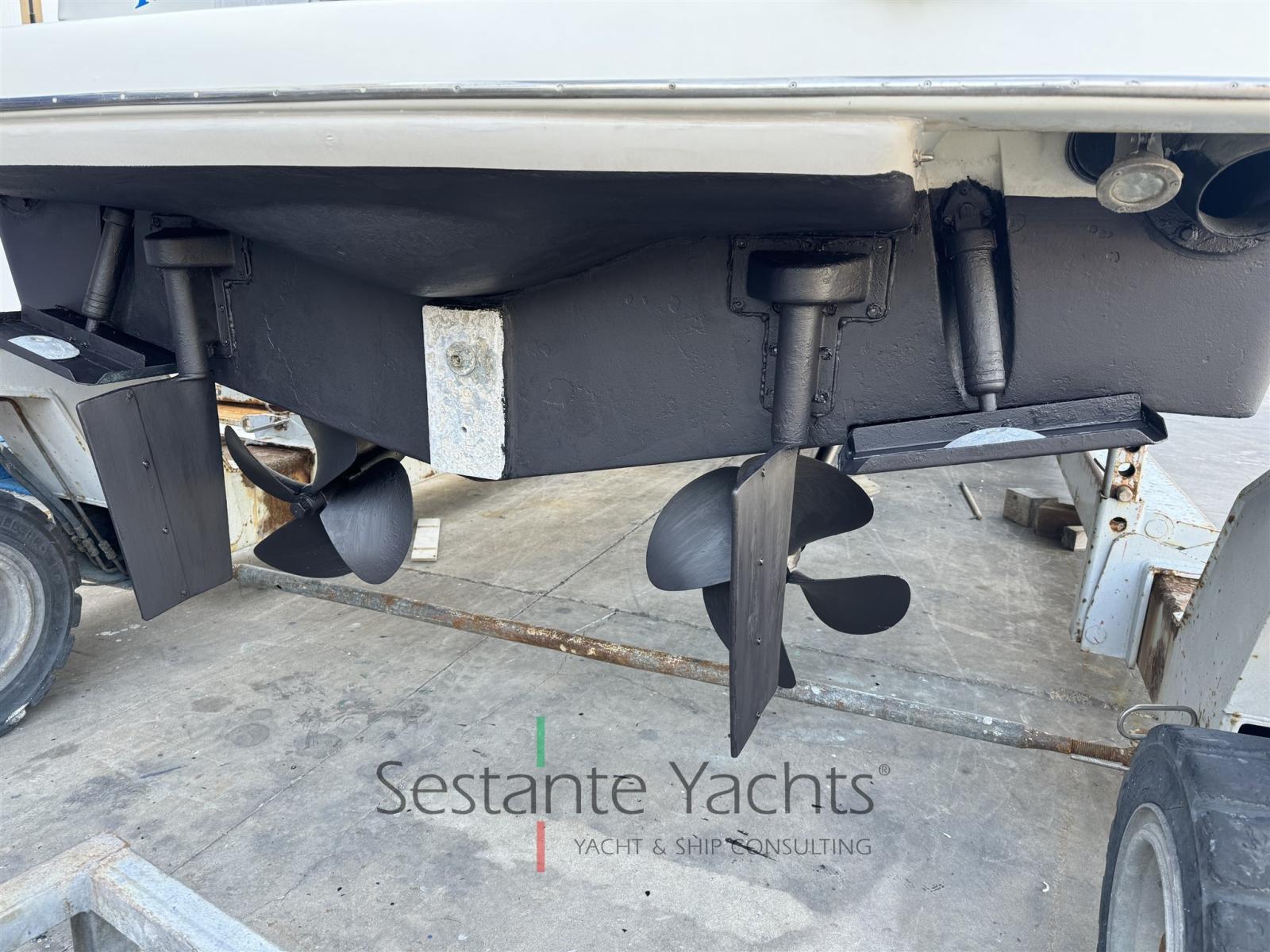 Engine Alarm, Bilge Alarm, Electric Engine Compartment Opening, Water pressure pump, Headlights fixed on the stem, Hydraulic Flaps, Hard top, Fire Extinguishing System, Flaps Indicators, Gangway, Automatic Bilge Pump, Manual Bilge Pump, Entry door, Shorepower connector, Voltage Rectifier, Electric Windlass, swimming ladder, cockpit table, Horn, Stern Winches.