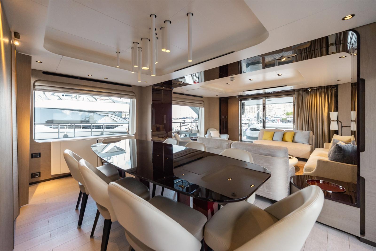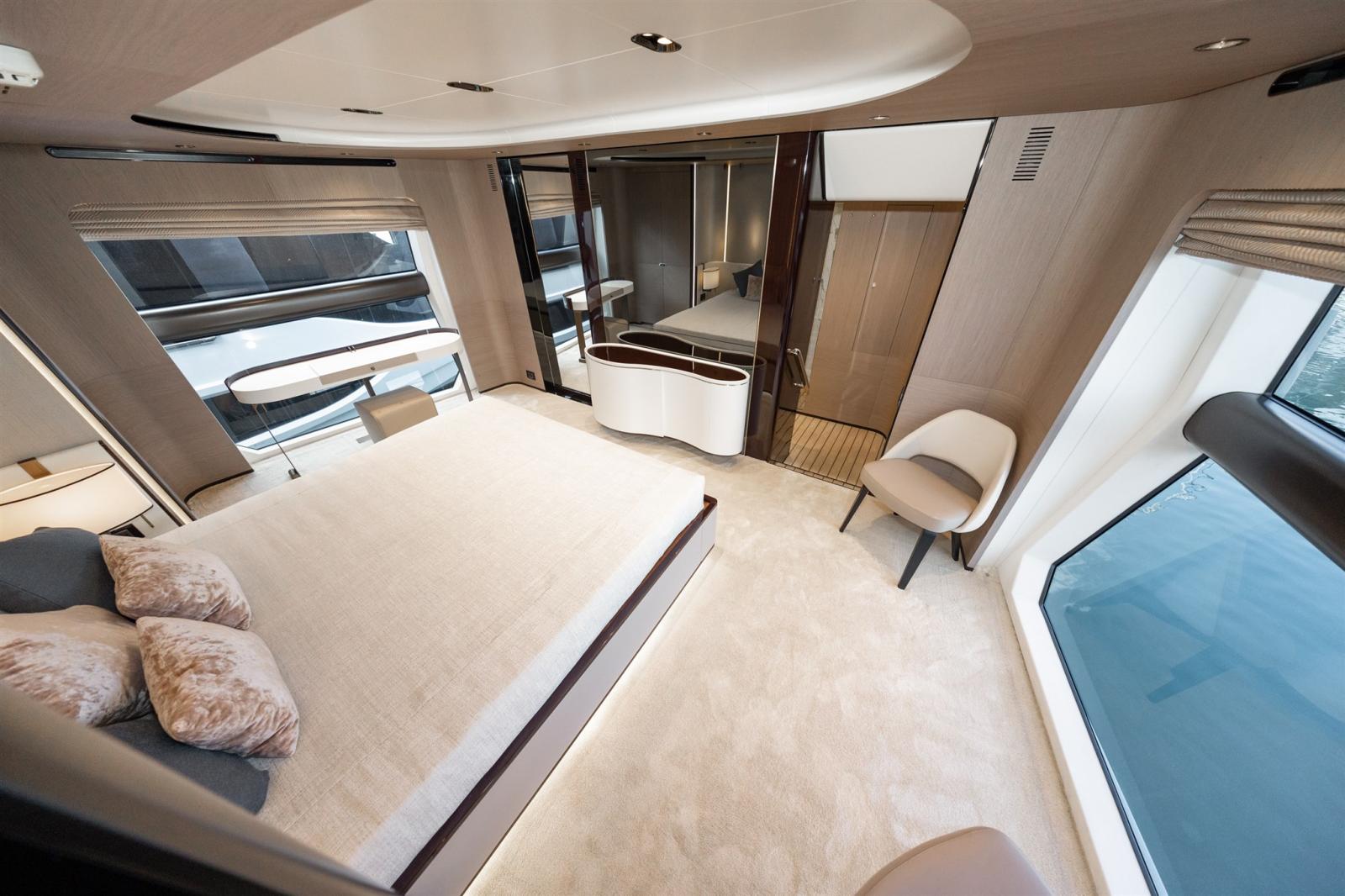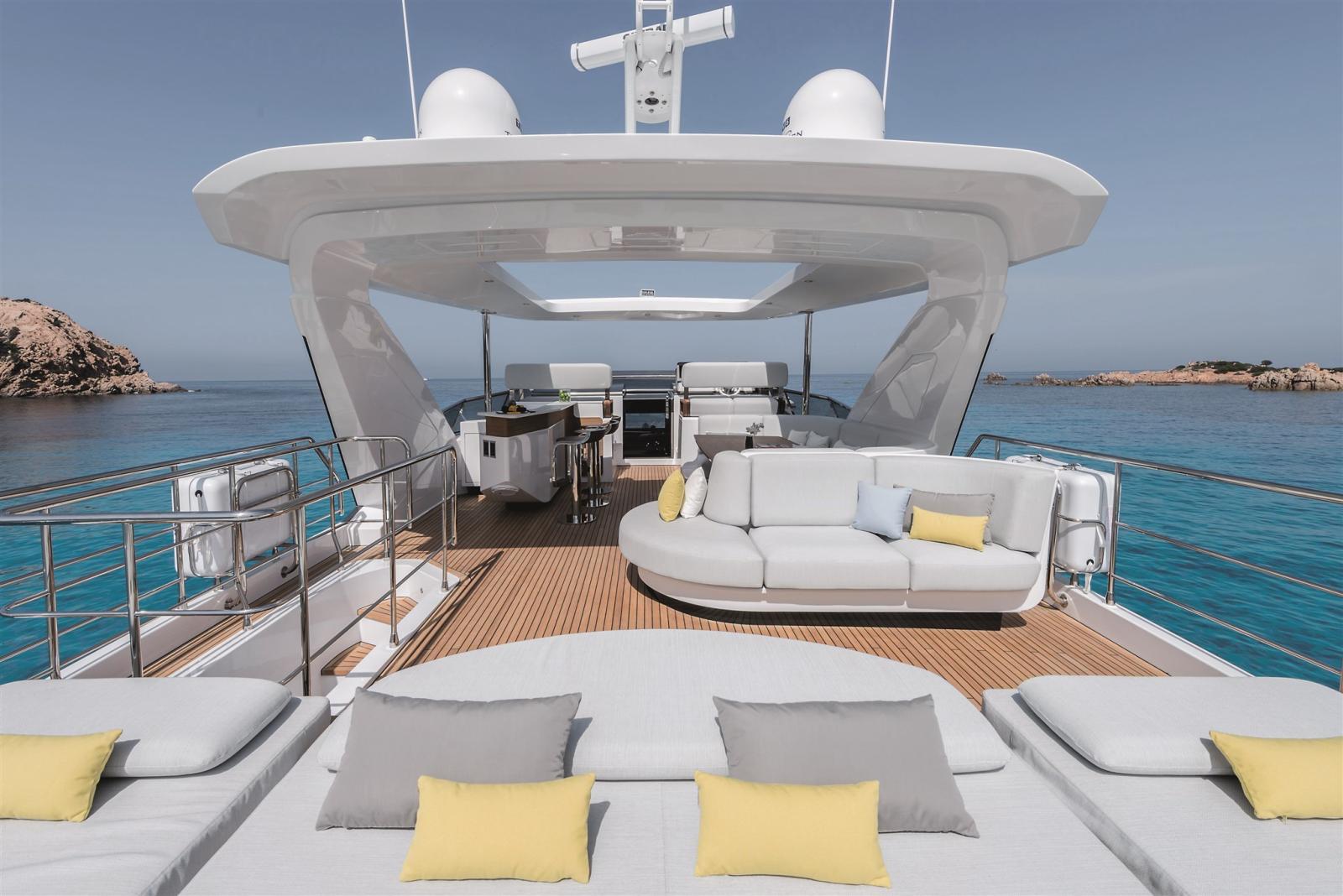 Designed by Stefano Righini, the Grande 27M boasts a carbon fiber superstructure, ensuring a lightweight yet ultra-stable ride. The spacious flybridge, beach club, and foredeck lounge provide the perfect settings for relaxation and entertainment, while the generous full-beam master suite on the main deck offers a private retreat with opulent finishes.