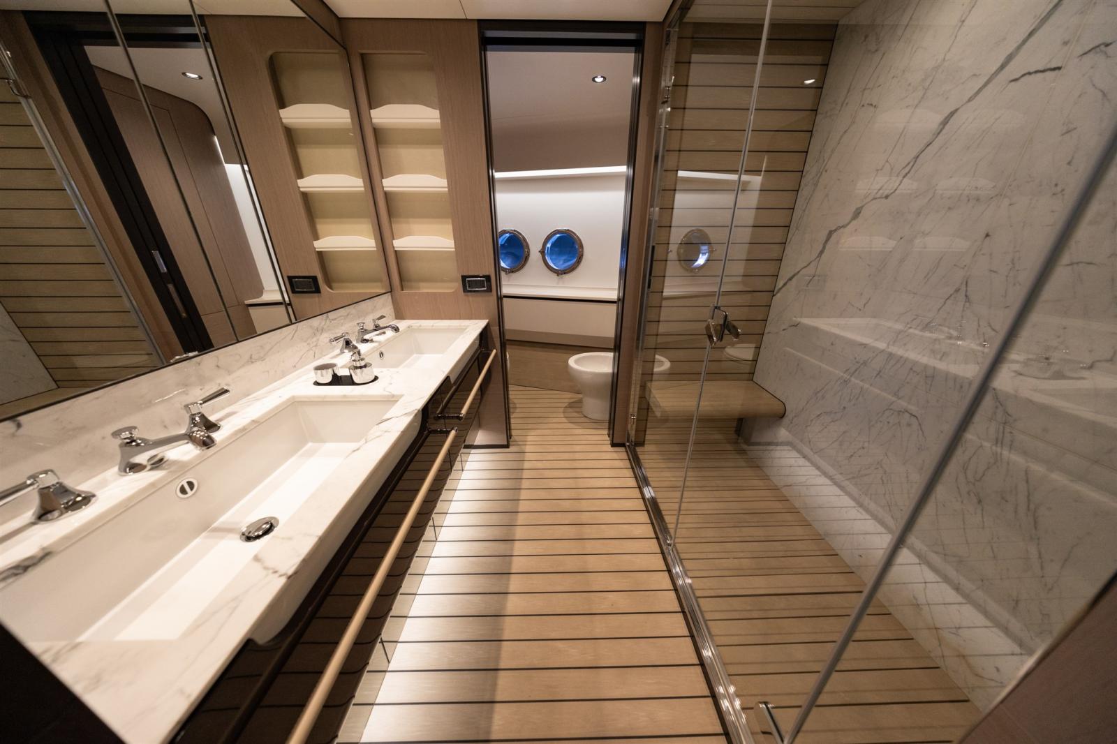 Fume/Gas Detector, Engine Alarm, Bilge Alarm, Water pressure pump, Auto-Trim, Teak Side Decks, Special Colour, Deck Shower, Headlights fixed on the stem, Directional Spotlight, Tender Garage, Tender Crane, Hard top, Fire Extinguishing System, Flaps Indicators, Anchor Chain Washdown, Washbasin in the cockpit, Courtesy Lights, Underwater lights, Gangway, Platform, Automatic Bilge Pump, Teak Cockpit, Shorepower connector, Gang Board, swimming ladder, Stabilizers, cockpit table, Horn, Teak Deckhouse, Stern Winches, Bow Winches.