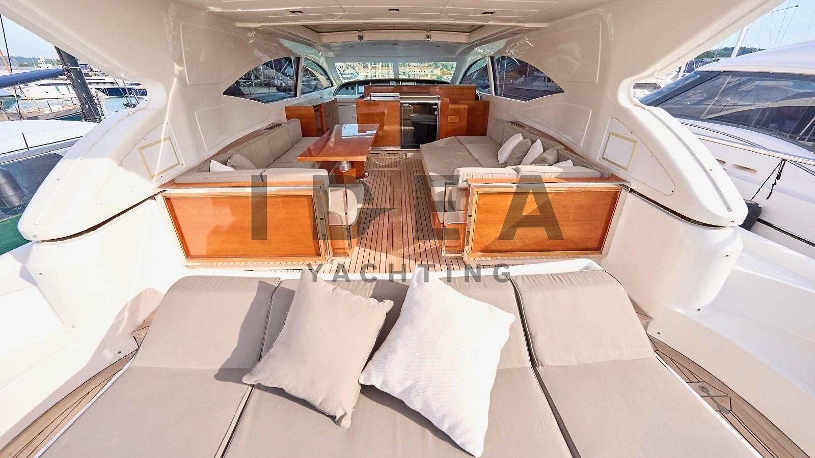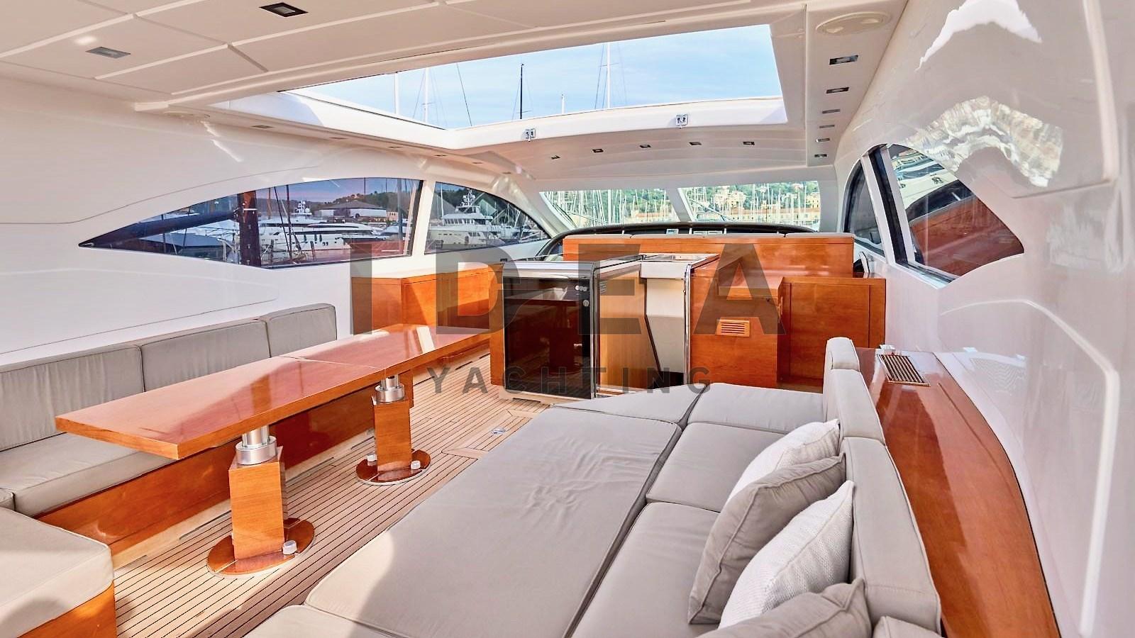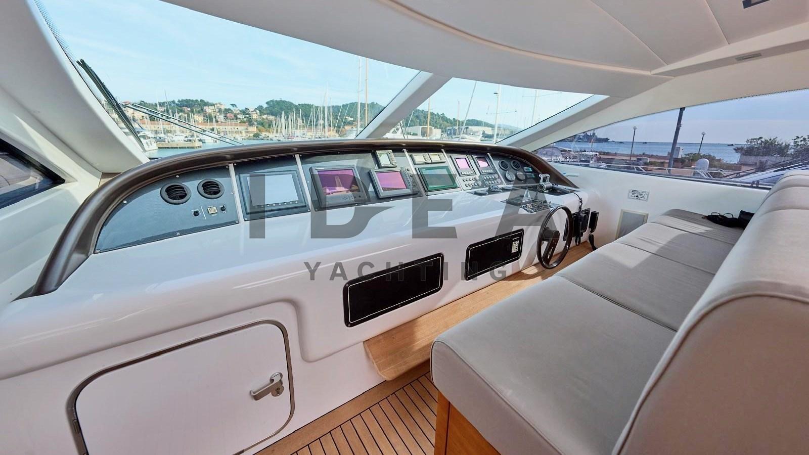 Fume/Gas Detector, 2 Engine Alarm, Bilge Alarm, Water pressure pump, 2 Battery charger, Deck Shower, Stern Thruster (Side Power), Bow Thruster (Side Power), Directional Spotlight, Tender Garage, Fire Extinguishing System, Washbasin in the cockpit, Courtesy Lights, Underwater lights, Gangway (Hydraulic telescopic Besenzoni), Platform, Automatic Bilge Pump, Manual Bilge Pump, Teak Cockpit, Shorepower connector, Water harbor connector system, Voltage Rectifier, Rollbar, Electric Windlass (Lofrans), swimming ladder, cockpit table (Telescopic), Horn, 2 Stern Winches (Lofrans), Bow Winches (Lofrans).