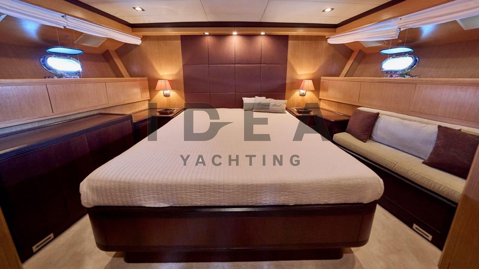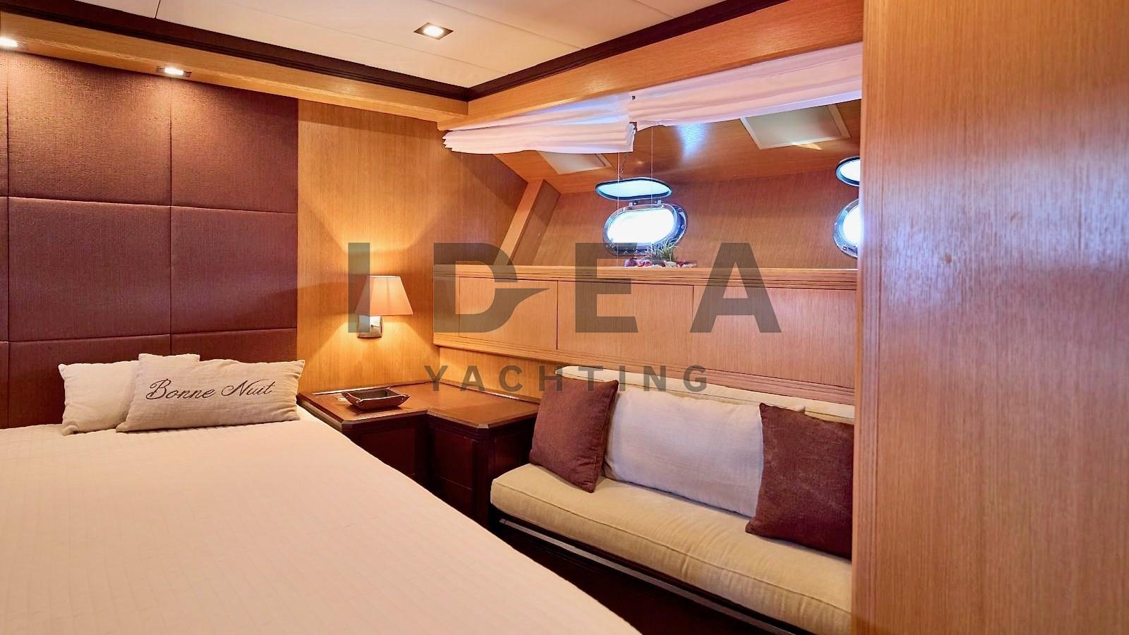 Accommodations include three elegantly appointed en-suite cabins, comfortably accommodating six guests, alongside a crew cabin that features double beds, which may serve as a versatile fourth guest cabin. The master suite, situated at the bow, stands as a sanctuary of luxury, offering abundant storage and a private en-suite bathroom. The remaining guest cabins comprise one with a double bed and another featuring twin beds, supplemented by an additional Pullman bed, each with their own en-suite facilities.