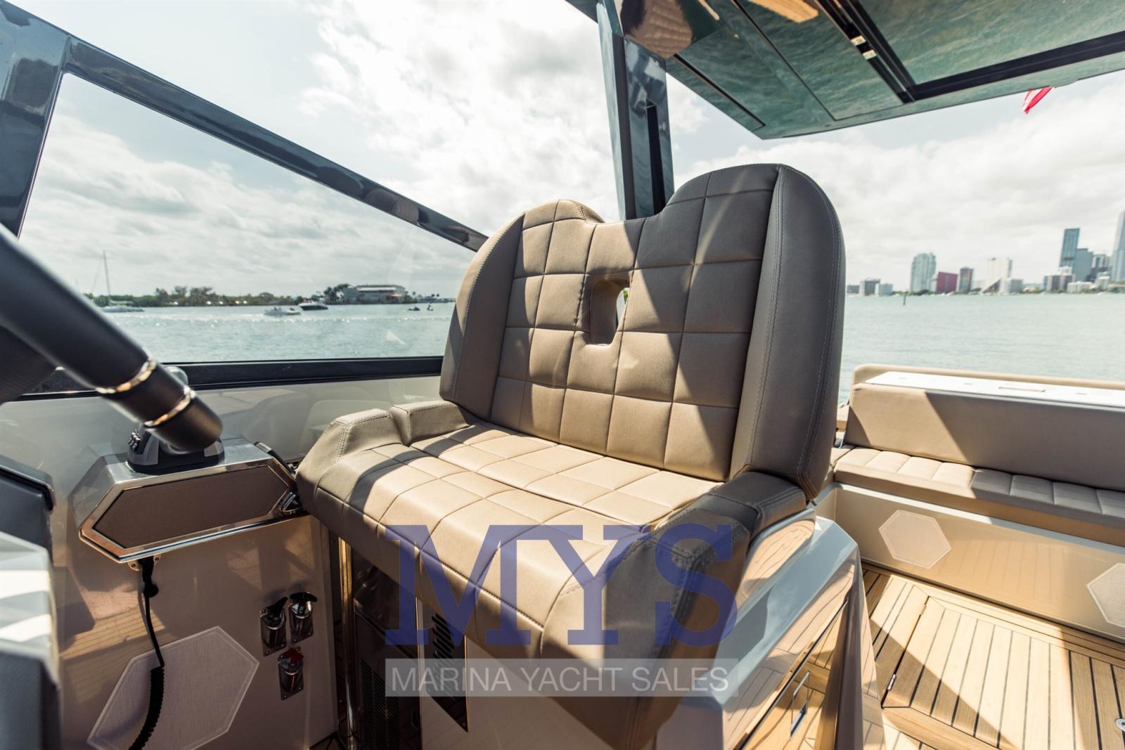 All controls and navigation systems are integrated into the teak console with soft lines. The rudder, Volvo Penta IPS joystick and two 12-inch touchscreens promise an exciting driving experience.
