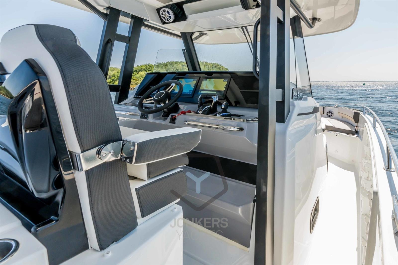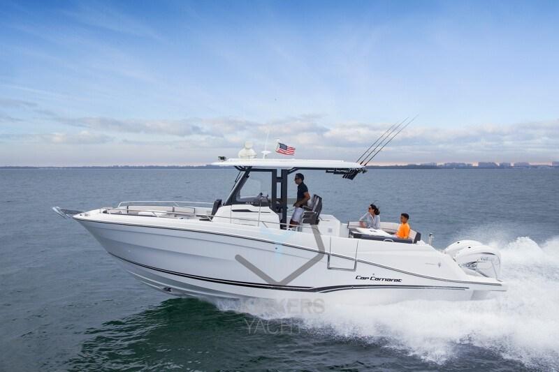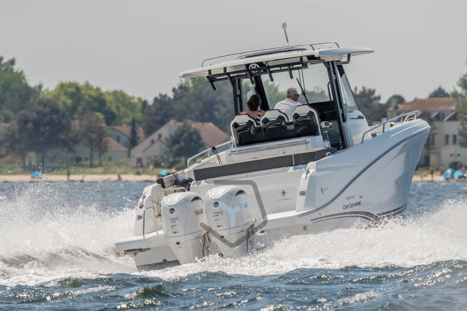 Whether you dream of a day of fishing with all the trimmings, or want to lie quietly at anchor, on the new boat within this series you can experience unforgettable moments with family and friends. The Cap Camarat 10.5 CC features two spacious steering positions and a large side door with integrated swim ladder for easy access to the sea: fun and relaxation guaranteed! With its V-shaped hull, the boat has excellent seaworthiness, and with its powerful twin engine, 2x 300 hp with joystick, and ergonomic steering, you will enjoy long fast cruises, perfectly safe in the comfortable seats.
