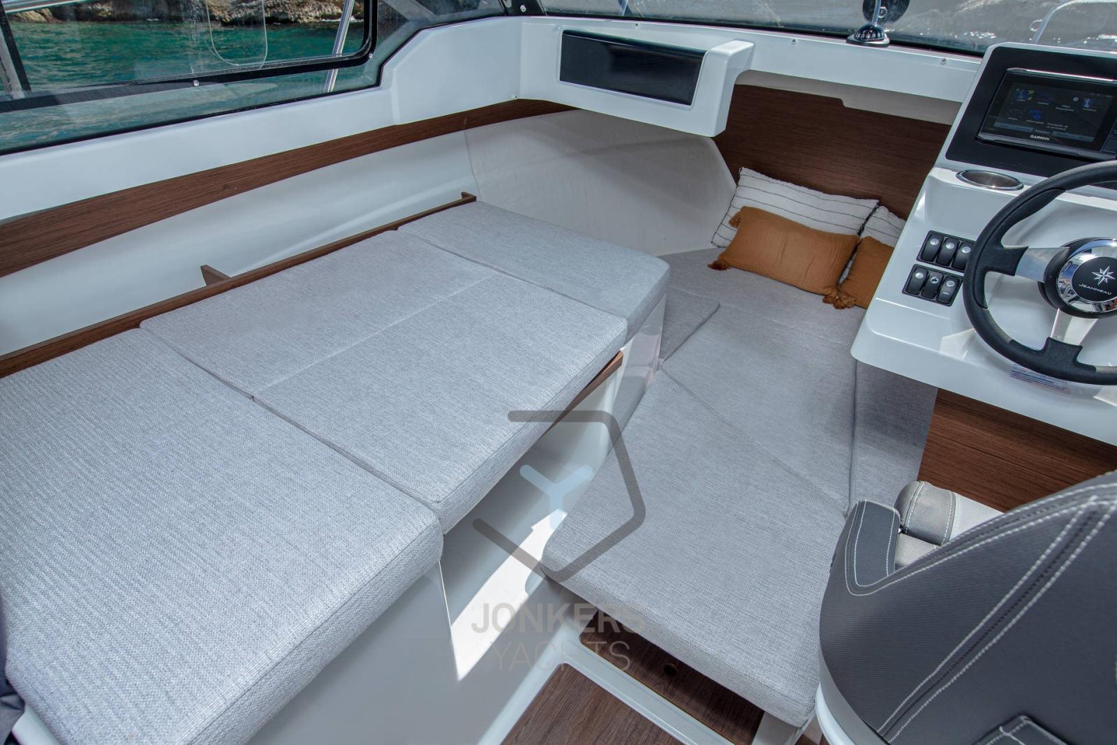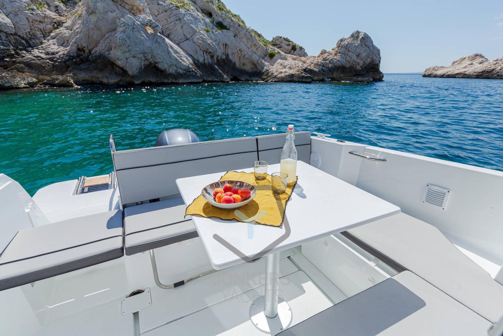 Enjoy sharing moments with family and friends in her spacious and inviting U-shaped cockpit saloon, which transforms into a sun deck. The sliding bench seat optimizes the space on board for maximum comfort. The generous flat aft deck provides easy access to the water.
