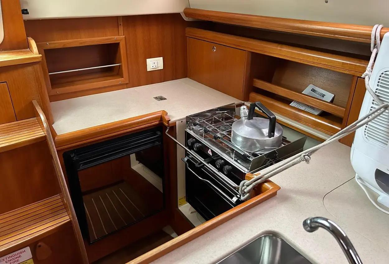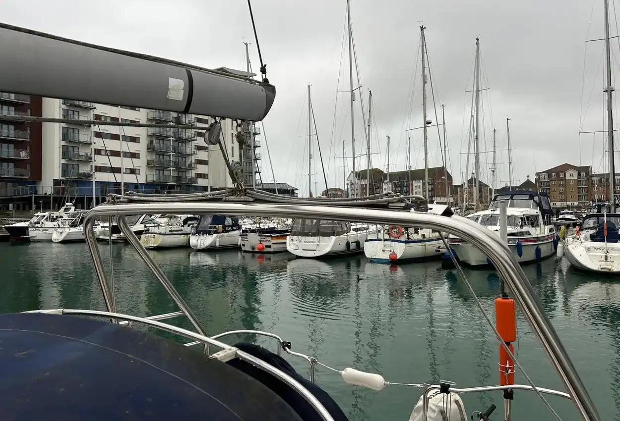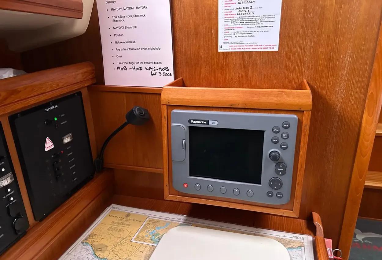 Boat DescriptionModel: 2005 Hunter Legend 33 sail cruiserEngine: Yanmar 3YM30 diesel engine with saildrive SD20 and folding propInterior FeaturesA lovely clean example of this popular model with:2 large double cabinsDouble berth sleeping in the saloonThe aft cabin to starboard includes:Double bedHanging lockerStowage areasThe saloon features:Large C-shaped seating area with table to portSeparate bench seat/bunk to starboardStowage areas throughoutUpholstery finished in dark blueTo starboard is the chart table area with:Ample room for charts and equipment12v and 240v switch panelsRaymarine plotter screenVHF radioStereoGaugesAlso to starboard is the heads compartment with:SinkShower attachmentMarine toilet (with holding tank)To port is the galley area in a wrap-around C shape with:Twin hobsOvenSinkFridgeStowage areas for provisionsCentral companionway access to the cockpit with engine compartment below.Inventory IncludesRaymarine C80 plotterRaymarine ST60 depth, log, wind speedSinrad RD68 VHFBlaupunkt Freiburg CD34 stereoElectric and manual bilge pumpsHot water systemOven with twin hobsFridgeMarine toilet with holding tankBattery charger with 220v shore power cableTeak cockpitCockpit cushionsOutboard engine bracketRadar reflectorAvon Redstar tenderHonda BF2.3 outboardSeago LR4V liferaft (date unknown)Ropes and fendersBoathooksWater temp gaugeOil pressure & temp gaugeCompassHour meterSwimming ladderSprayhoodElectric anchor windlass