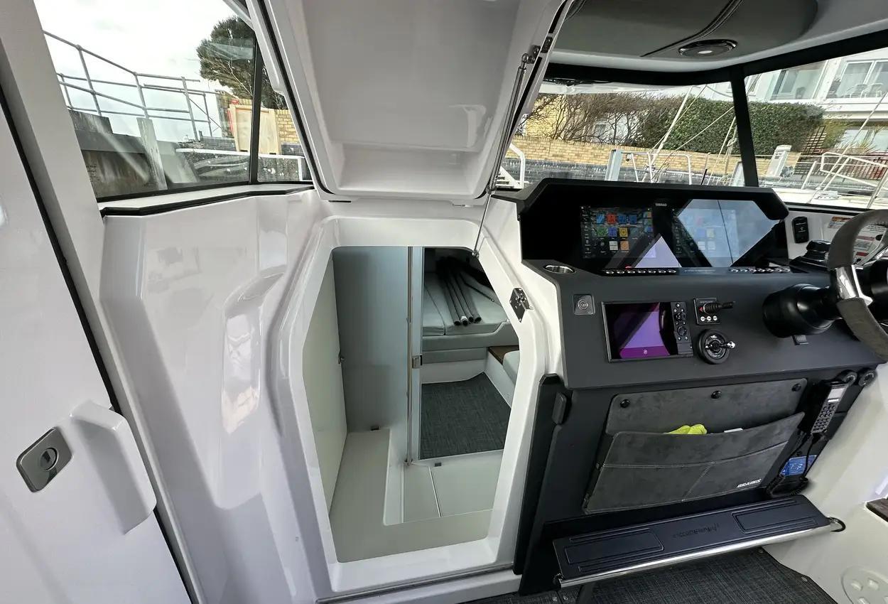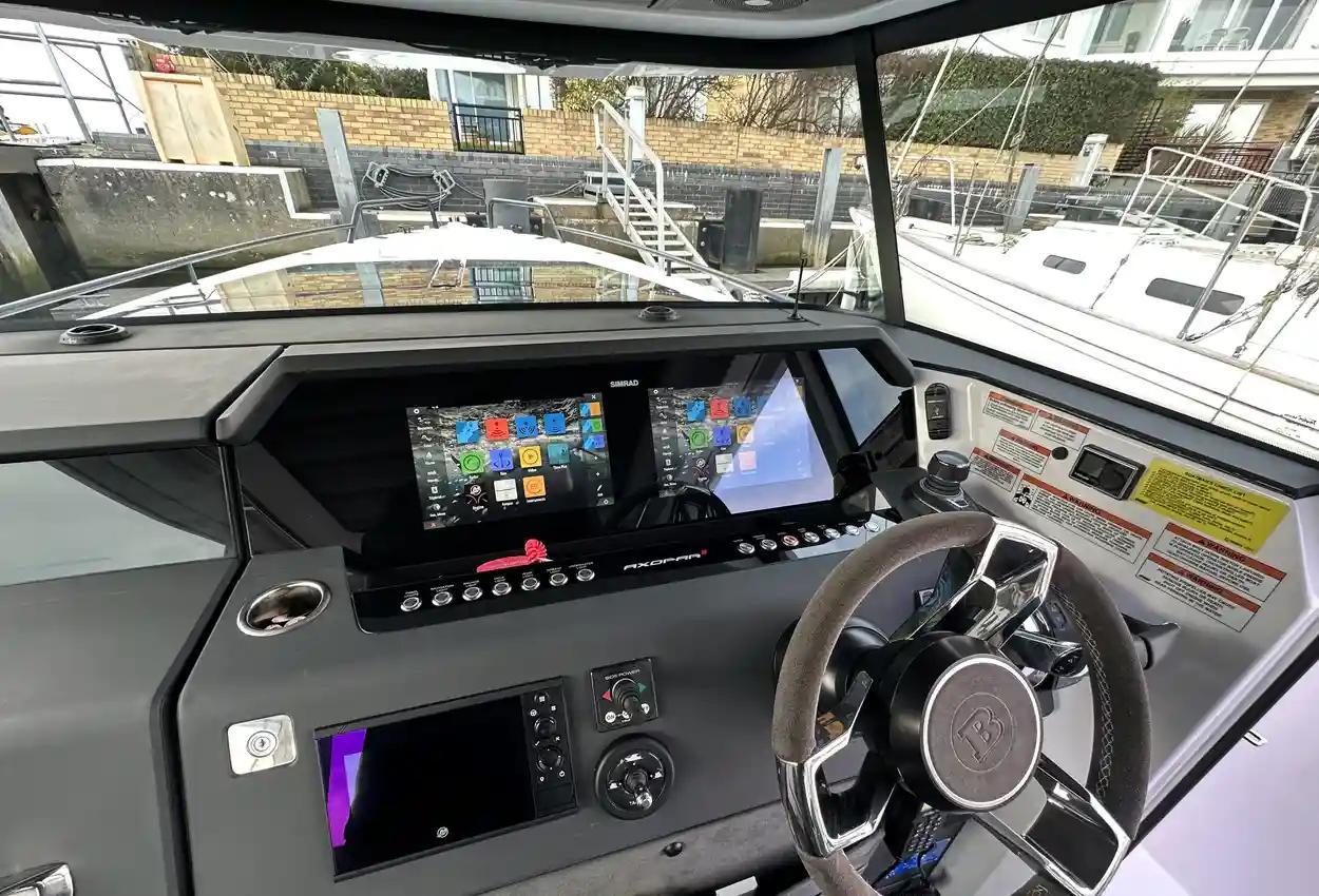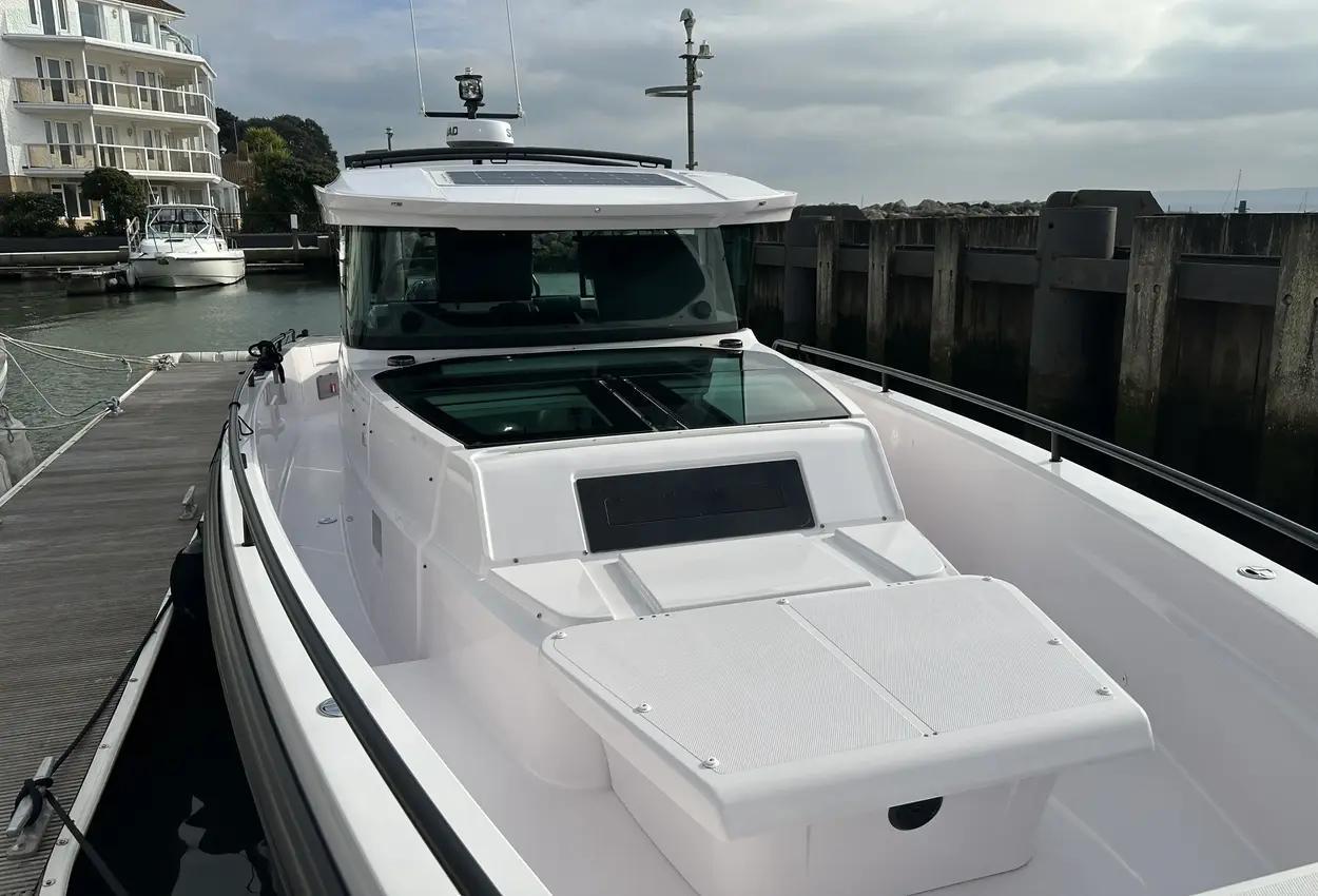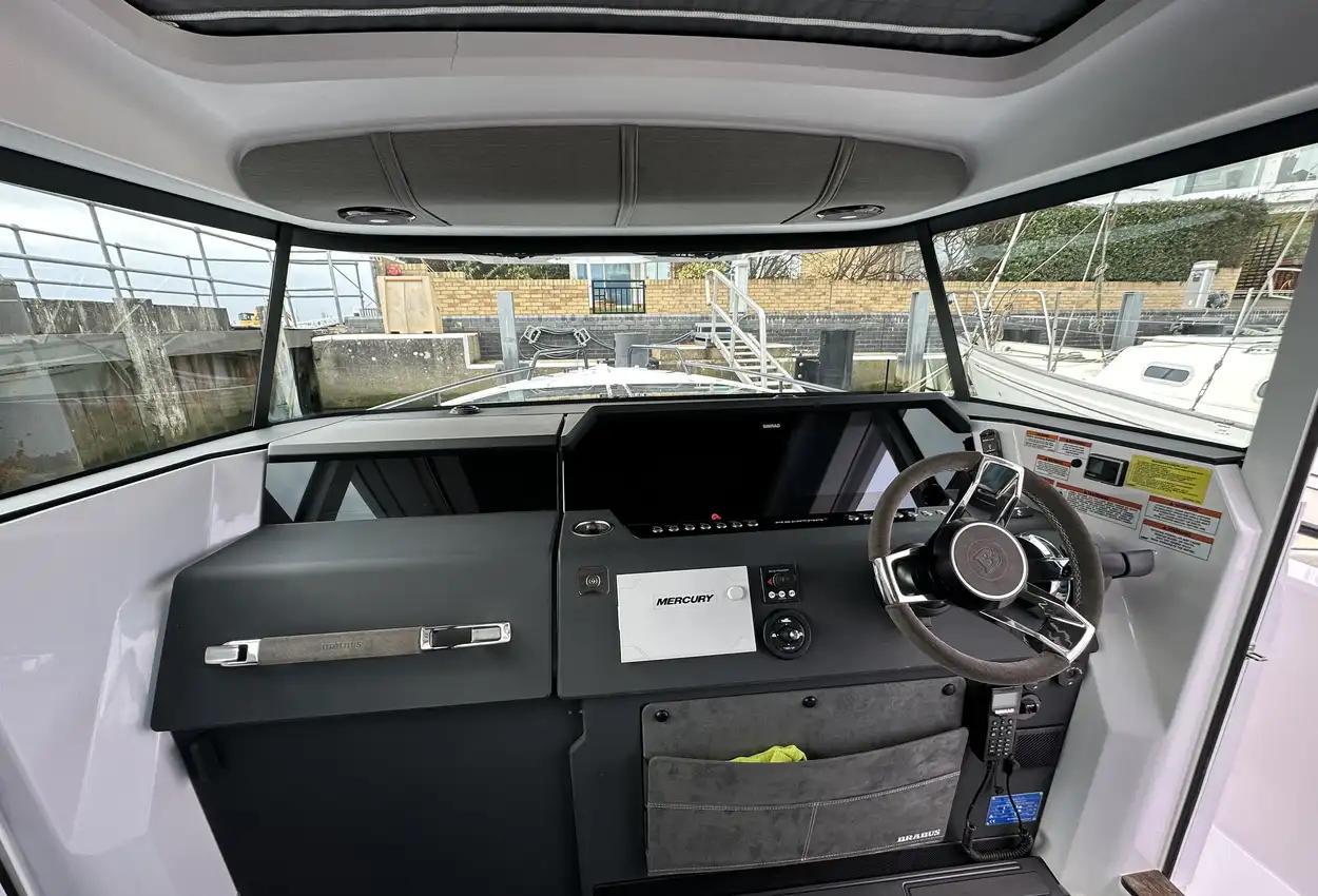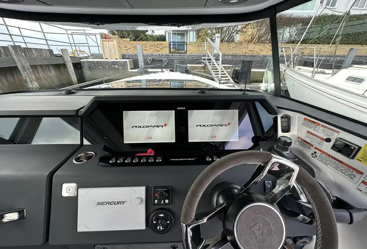 The Axopar 37 XC is designed to take on every season, offering a fully enclosed cabin to protect you from the elements. With twin Mercury Verado 330hp engines, it’s powerful yet comfortable, making it the perfect choice for year-round exploring. Whether it’s a crisp winter morning or a breezy summer evening, the Axopar 37 XC ensures you’re always ready to set sail.Incredible opportunity to purchase this Axopar 37XC Cross Cabin - Brabus Line! Experience power and comfort combined. Offering a huge spec, this is not a boat to be missed. View now in Poole 01202 679 421.Boat DescriptionHand laminated hull in Vinylester resin for the first coat for osmosis prevention of the hull in GRP materialTwin-stepped hull with “sharp entry bow”Integrated engine bracket in hull for outboard enginesFixed aluminium fuel tank 730l with overflow preventionFreshwater tank 100lHeavy-duty rub rail with rubber end caps in greyHeavy-duty rub rail around swim platformsAxopar 3D signature chrome logo on both sides of hullBow thruster tunnel preparation in hullWalk-around deck layout with open aft deckAnti-skid finishing on working deck areas and deck hatchesSelf-draining deck area with quick drain aft deckAll hardware, pulpits, locks, hinges, filler caps & cockpit grab rails in 316 stainless steel8 x cleats on aft, midships and fore deckAdditional hooking points for safety harness around side deck areasFore deck pulpits, shortLED navigation lights on fore deckSpacious anchor locker with drainage in bowRope holders in anchor locker on fore deck & fender storagesSofa with backrest on fore deck including harbor coverLarge skylight with harbor coverFlush mounted 2 x skylights including harbor coverCurved & toughened glass wrap-around windscreens and side windows in light green tint with illuminated 37 signatureFully enclosed cabin with extra wide & lockable sliding doorsRoof structure in white GRP with large opening canvas roofHarbour cover for opening canvas roof2 x integrated & interlinked windscreen wipersWindshield washer with separate reservoirGrab rail under coach roof on aft deckIntegrated boarding steps on both sides of helmFoldable light mast in white painted aluminium with anchor lightTwin large fender storages on aft deck with insulation/cooler boxesAft deck with large storage compartmentBattery/electrical compartment under aft deck storageFlagpoleSignal hornTwo electric bilge pumps with auto-functionManual bilge pump for aft deck sectionTrim-tabs with joystick controlSide railsIntegrated swim platforms and telescopic bathing ladderFront CabinFront cabin with L-shaped lounge sofa & seatingLarge queen size bed with soft side bolstersAll upholstery in Torres Grey fabricRoof panels in Vintage Steel fabricPortlight towards fore deck with openable hatchMirror in forward bulkhead2 x foldable wooden shelves beside the bedCabinet upholstered in Vintage Steel fabric with wenge topMirror above cabinet4 x pop up clothes hangersBuilt-in electric flush toilet under L-sofa with septic tank 70l and deck/hull outletsMain 12V fuse panel with automatic fuses12V & USB outlet in front cabinFire & CO2 alarms6 x LED roof spotlightsLED roof light strip between skylightsTwo manual “mushroom” roof ventsCarpet in blackBRABUS LineBRABUS Line Color Edition, Miami BlueBRABUS Line Color Edition, Platinum GreyBRABUS Performance LineAdditional FeaturesKitchen Module in cockpitToilet compartmentFixed sun bed on foredeck with coversX2 12" Glass helm Simrad information displayRoof barsNavigation OptionsChartplotter Simrad NSS 12Information display twin 12Twin Chartplotter Simrad NSS 12"Echo sounder, Activeimaging 3in1Echo sounder, thru hullSimrad VHFRadar Simrad Halo20+