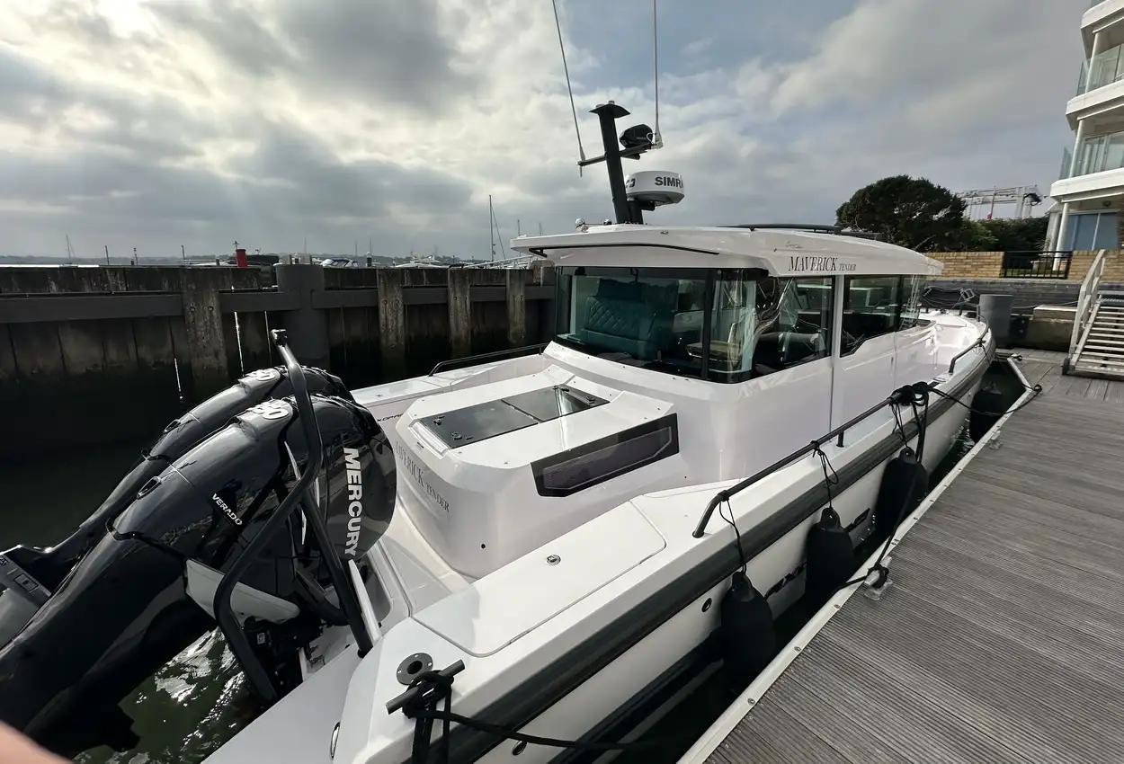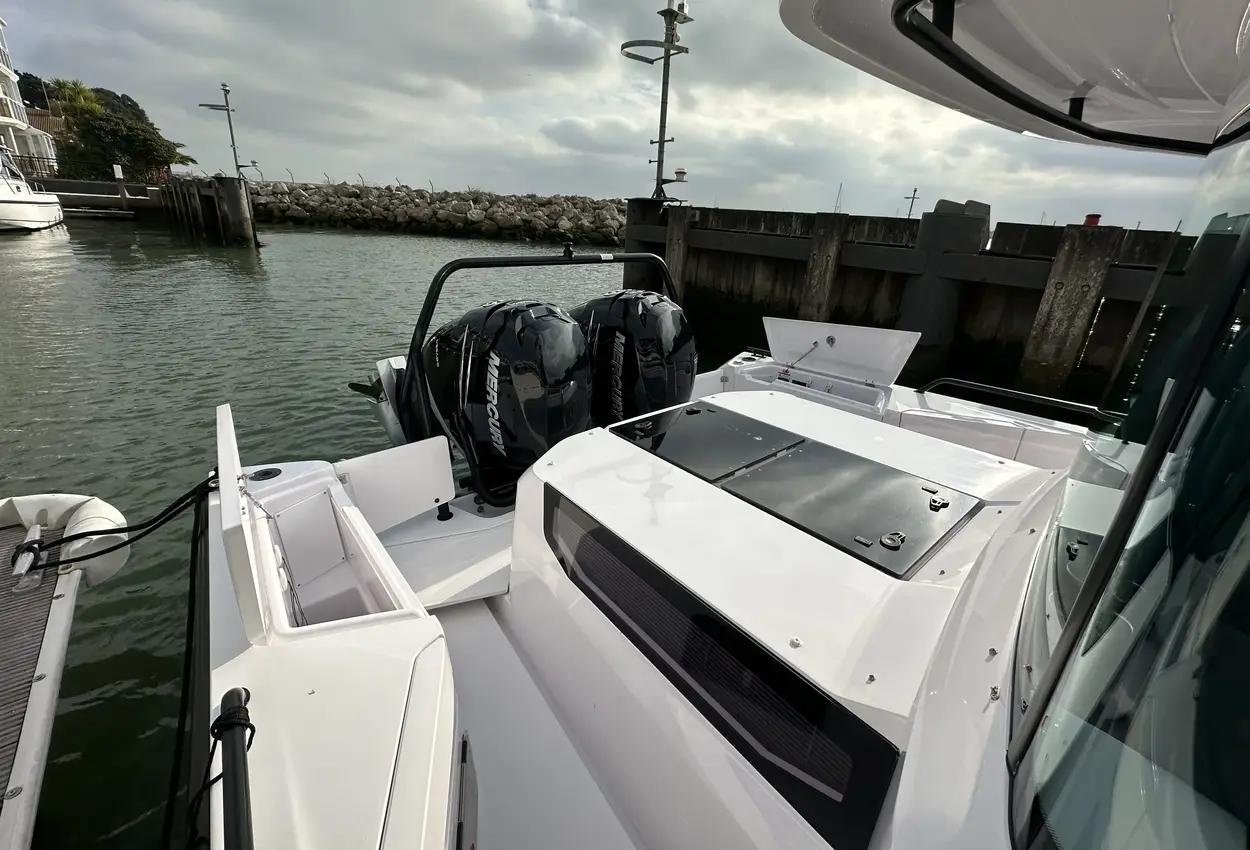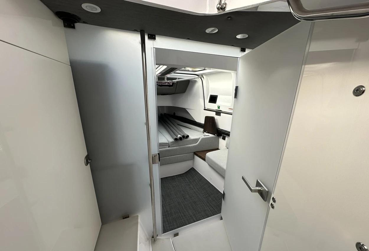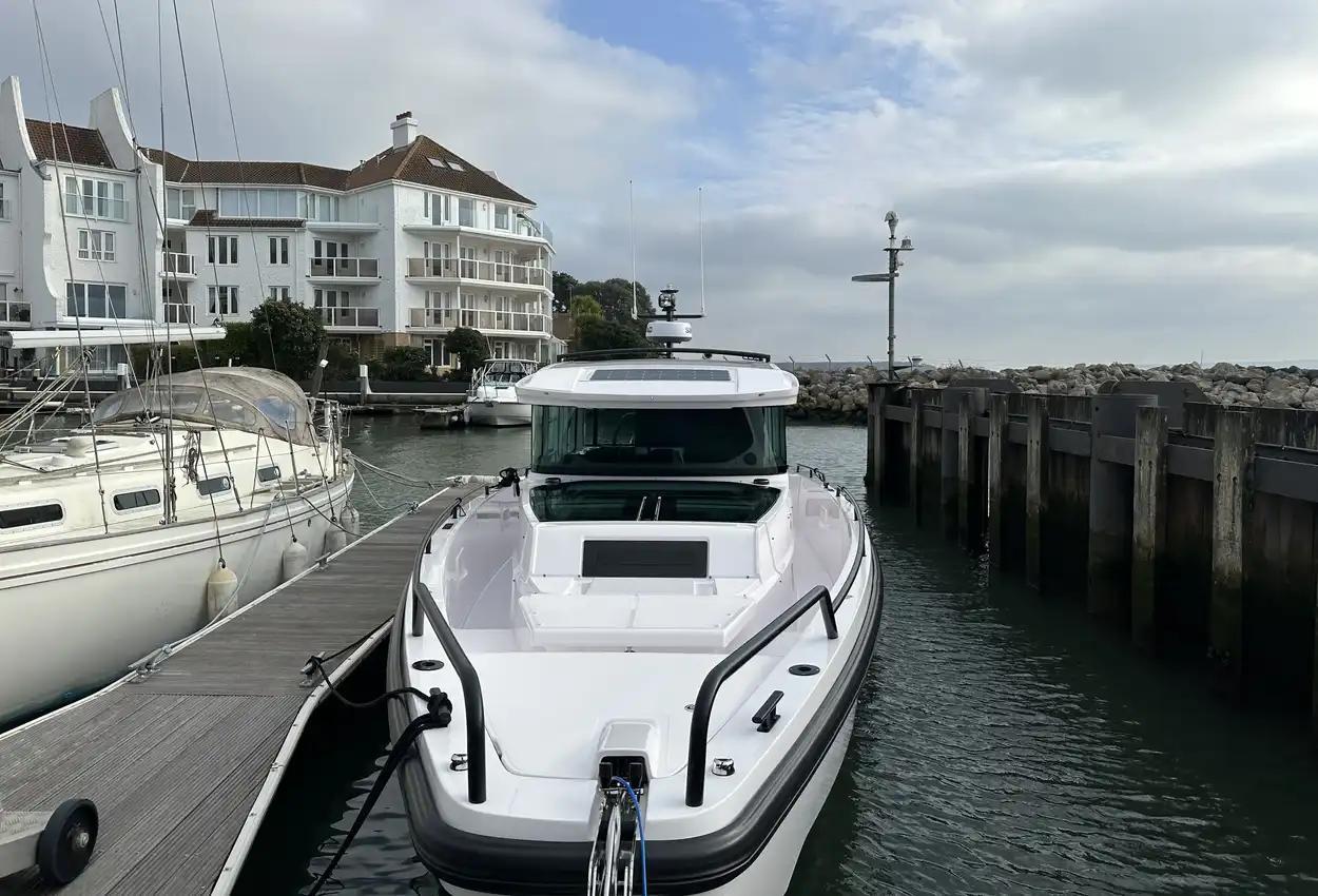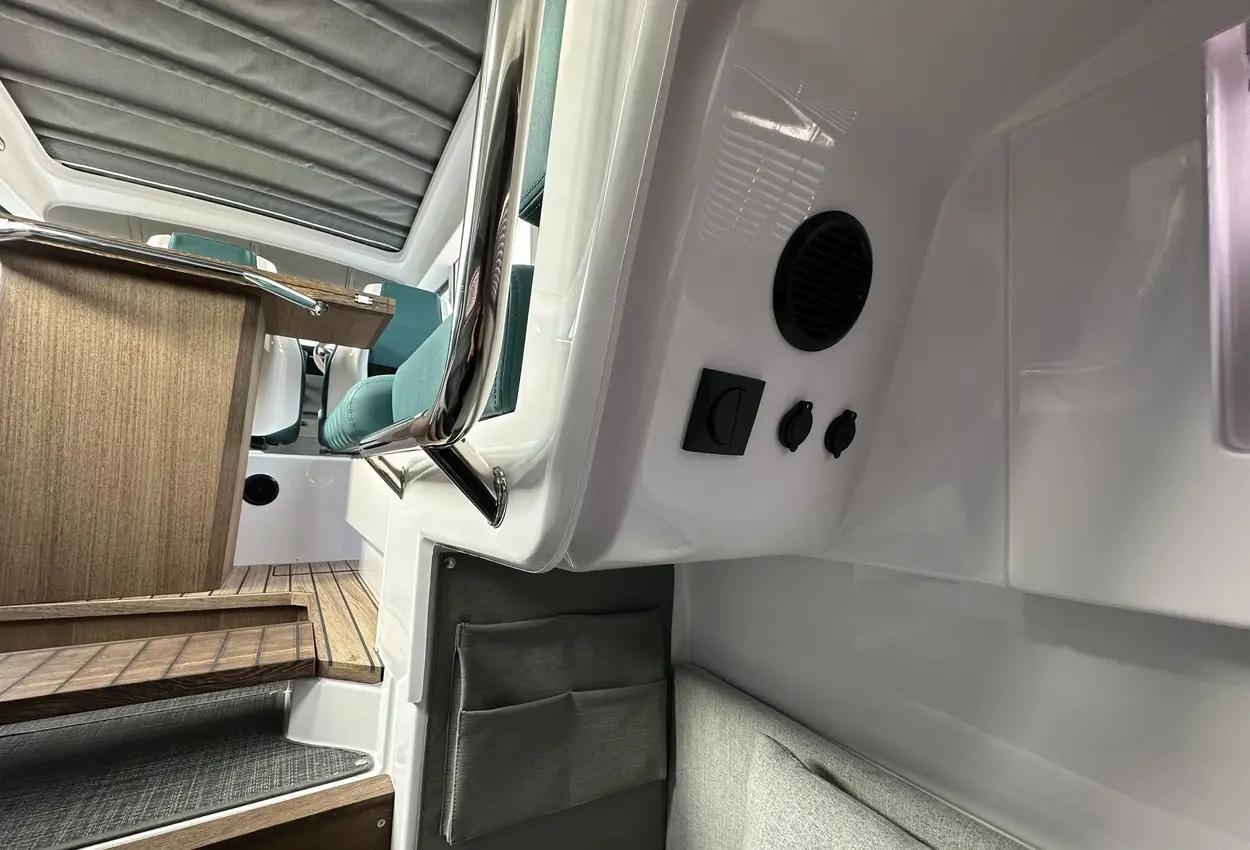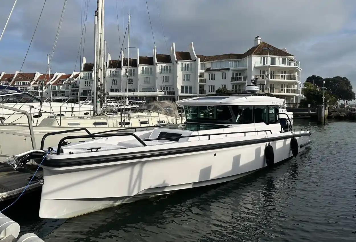 The Axopar 37 XC is designed to take on every season, offering a fully enclosed cabin to protect you from the elements. With twin Mercury Verado 330hp engines, it’s powerful yet comfortable, making it the perfect choice for year-round exploring. Whether it’s a crisp winter morning or a breezy summer evening, the Axopar 37 XC ensures you’re always ready to set sail.Incredible opportunity to purchase this Axopar 37XC Cross Cabin - Brabus Line! Experience power and comfort combined. Offering a huge spec, this is not a boat to be missed. View now in Poole 01202 679 421.Boat DescriptionHand laminated hull in Vinylester resin for the first coat for osmosis prevention of the hull in GRP materialTwin-stepped hull with “sharp entry bow”Integrated engine bracket in hull for outboard enginesFixed aluminium fuel tank 730l with overflow preventionFreshwater tank 100lHeavy-duty rub rail with rubber end caps in greyHeavy-duty rub rail around swim platformsAxopar 3D signature chrome logo on both sides of hullBow thruster tunnel preparation in hullWalk-around deck layout with open aft deckAnti-skid finishing on working deck areas and deck hatchesSelf-draining deck area with quick drain aft deckAll hardware, pulpits, locks, hinges, filler caps & cockpit grab rails in 316 stainless steel8 x cleats on aft, midships and fore deckAdditional hooking points for safety harness around side deck areasFore deck pulpits, shortLED navigation lights on fore deckSpacious anchor locker with drainage in bowRope holders in anchor locker on fore deck & fender storagesSofa with backrest on fore deck including harbor coverLarge skylight with harbor coverFlush mounted 2 x skylights including harbor coverCurved & toughened glass wrap-around windscreens and side windows in light green tint with illuminated 37 signatureFully enclosed cabin with extra wide & lockable sliding doorsRoof structure in white GRP with large opening canvas roofHarbour cover for opening canvas roof2 x integrated & interlinked windscreen wipersWindshield washer with separate reservoirGrab rail under coach roof on aft deckIntegrated boarding steps on both sides of helmFoldable light mast in white painted aluminium with anchor lightTwin large fender storages on aft deck with insulation/cooler boxesAft deck with large storage compartmentBattery/electrical compartment under aft deck storageFlagpoleSignal hornTwo electric bilge pumps with auto-functionManual bilge pump for aft deck sectionTrim-tabs with joystick controlSide railsIntegrated swim platforms and telescopic bathing ladderFront CabinFront cabin with L-shaped lounge sofa & seatingLarge queen size bed with soft side bolstersAll upholstery in Torres Grey fabricRoof panels in Vintage Steel fabricPortlight towards fore deck with openable hatchMirror in forward bulkhead2 x foldable wooden shelves beside the bedCabinet upholstered in Vintage Steel fabric with wenge topMirror above cabinet4 x pop up clothes hangersBuilt-in electric flush toilet under L-sofa with septic tank 70l and deck/hull outletsMain 12V fuse panel with automatic fuses12V & USB outlet in front cabinFire & CO2 alarms6 x LED roof spotlightsLED roof light strip between skylightsTwo manual “mushroom” roof ventsCarpet in blackBRABUS LineBRABUS Line Color Edition, Miami BlueBRABUS Line Color Edition, Platinum GreyBRABUS Performance LineAdditional FeaturesKitchen Module in cockpitToilet compartmentFixed sun bed on foredeck with coversX2 12" Glass helm Simrad information displayRoof barsNavigation OptionsChartplotter Simrad NSS 12Information display twin 12Twin Chartplotter Simrad NSS 12"Echo sounder, Activeimaging 3in1Echo sounder, thru hullSimrad VHFRadar Simrad Halo20+